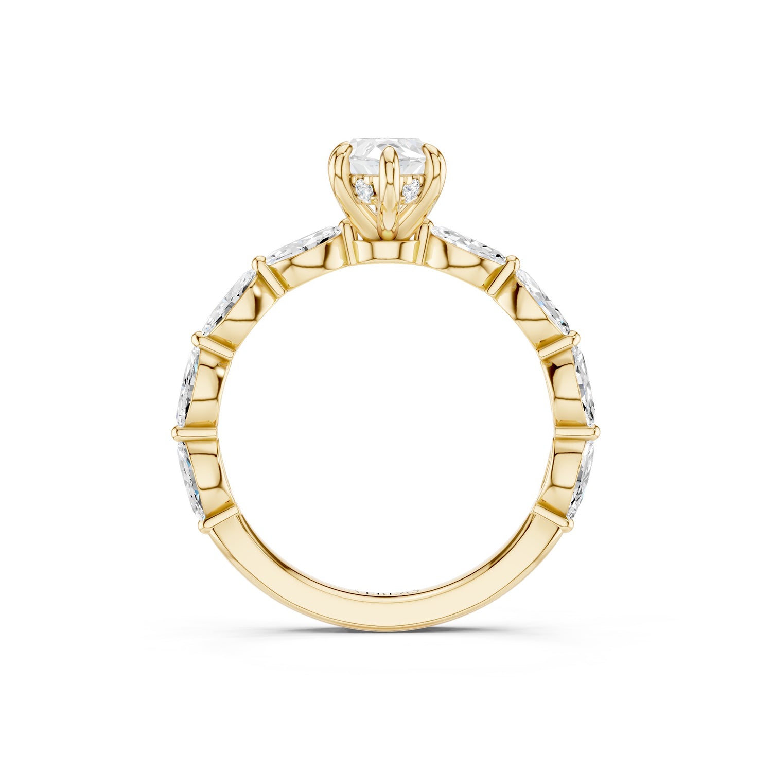 The Marquise Hidden Halo Diamond Ring is a true showstopper. The elongated marquise-cut lab-grown diamond at its heart elongates the finger with timeless elegance, while a hidden halo tucked beneath the center diamond creates an intimate glow that’s all your own. The polished gold band enhances its bold geometry with marquise diamond accents. Designed for those who love standout sparkle with a touch of intrigue.