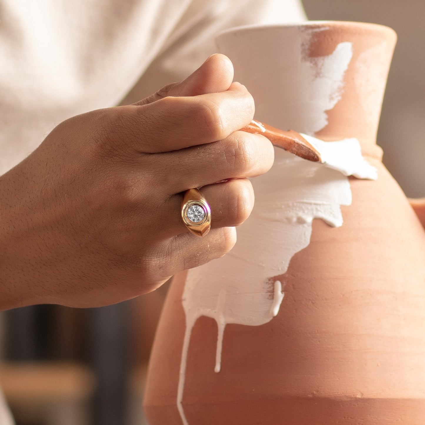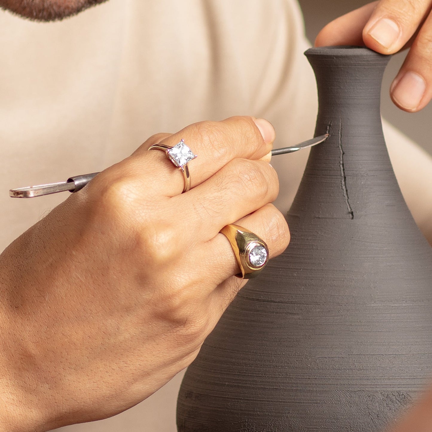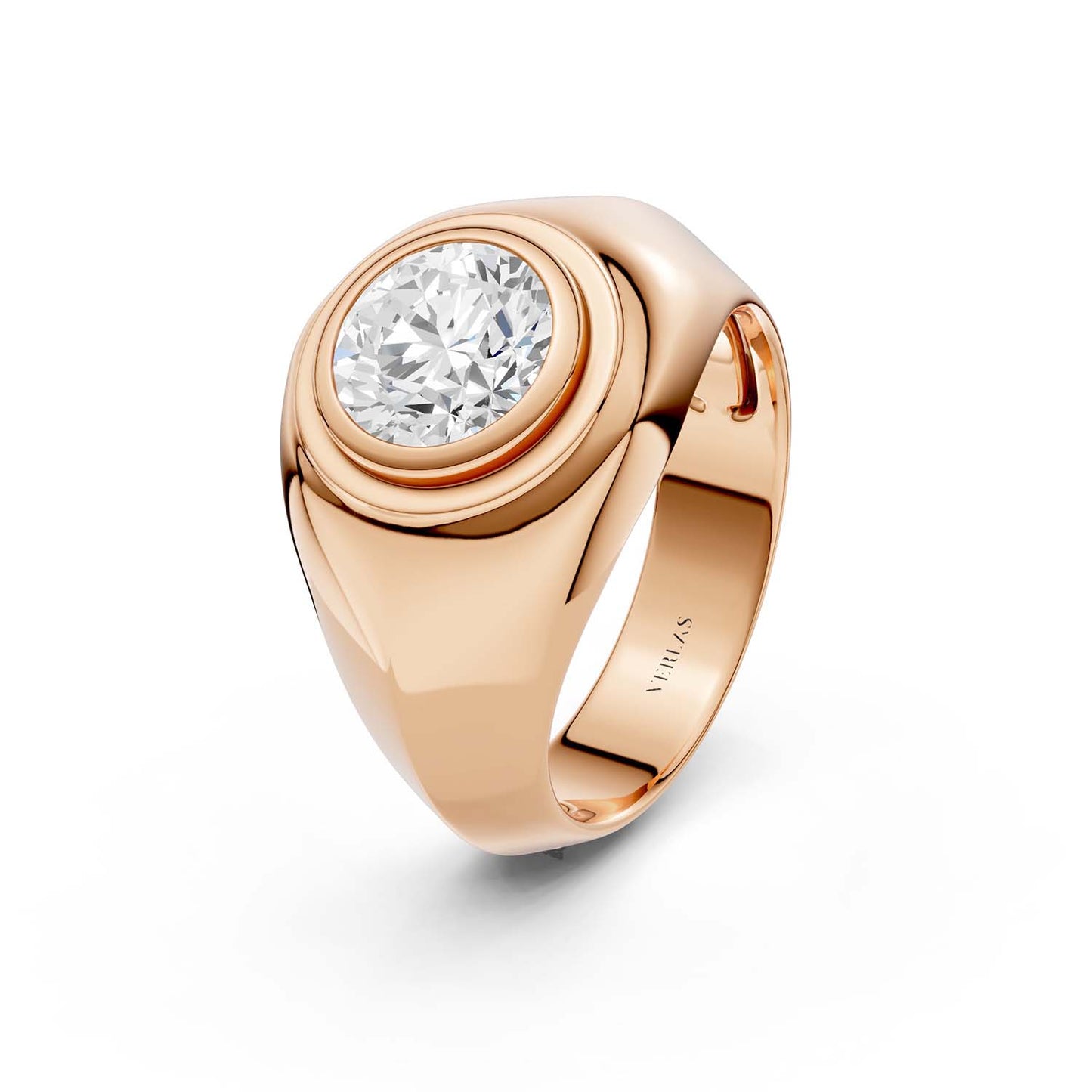 This bold ring features a flat-top labgrown diamond for an engagement ring at the center. The ring has a charming appeal with rounded edges and a sublime round-cut diamond. This bezel-set ring is the best choice for all who cares about the small things in life and espouses perfection.
