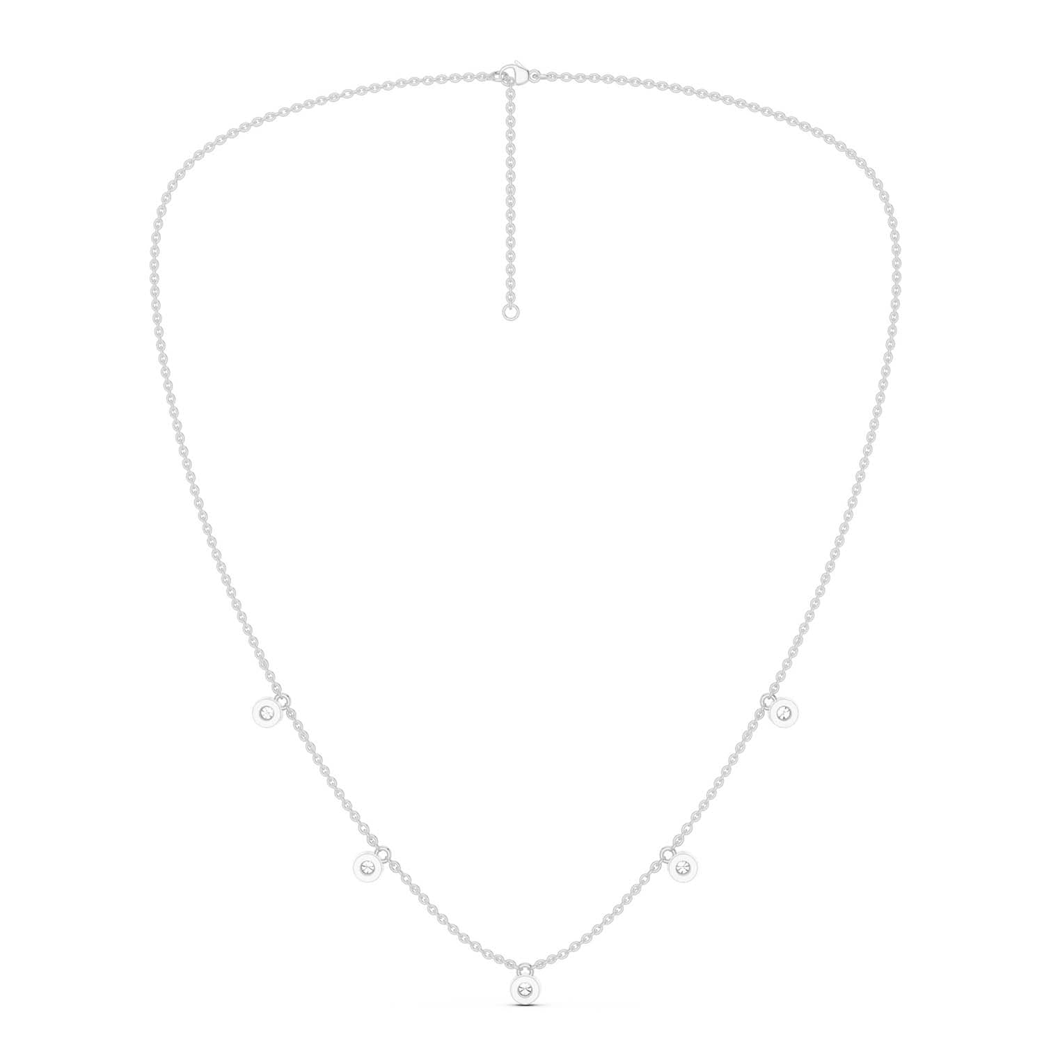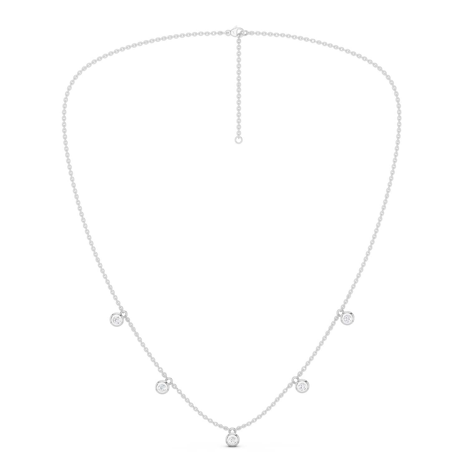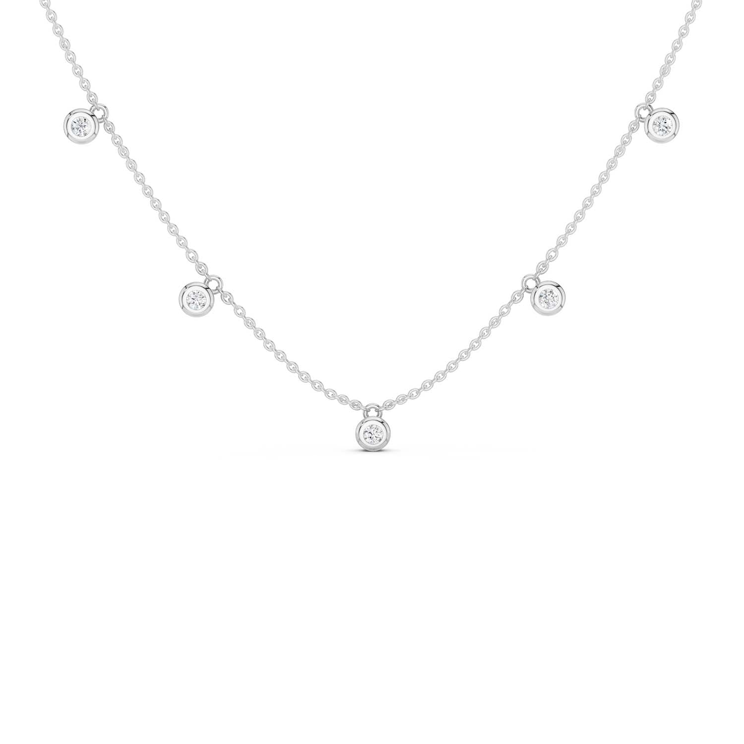 The versatile Mini-Round Encompassing Stationed Necklace showcases a series of carefully selected, round-cut diamonds, set in a manner that maximizes their radiance. It is a perfect blend of elegance and charm for those aspiring minimalists. With five stunning round bezel stations, this classic diamond necklace design offers endless layering possibilities.