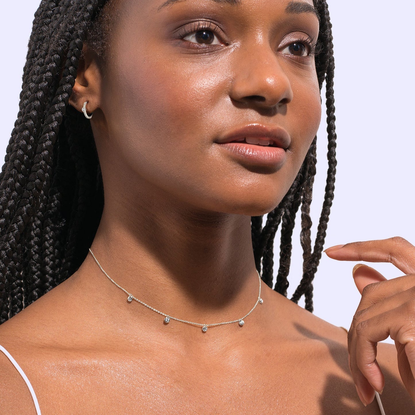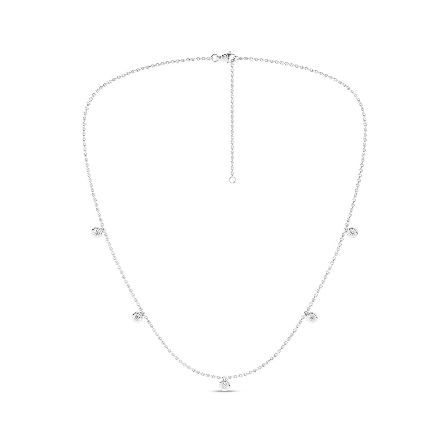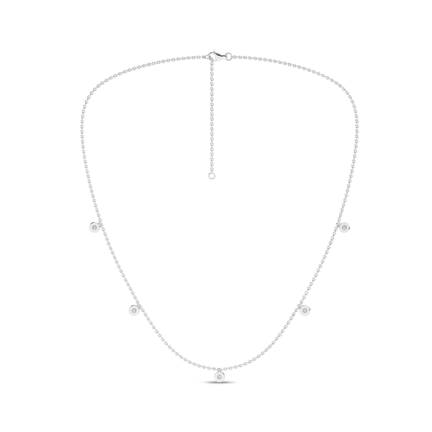 The versatile Mini-Round Encompassing Stationed Necklace showcases a series of carefully selected, round-cut diamonds, set in a manner that maximizes their radiance. It is a perfect blend of elegance and charm for those aspiring minimalists. With five stunning round bezel stations, this classic diamond necklace design offers endless layering possibilities.