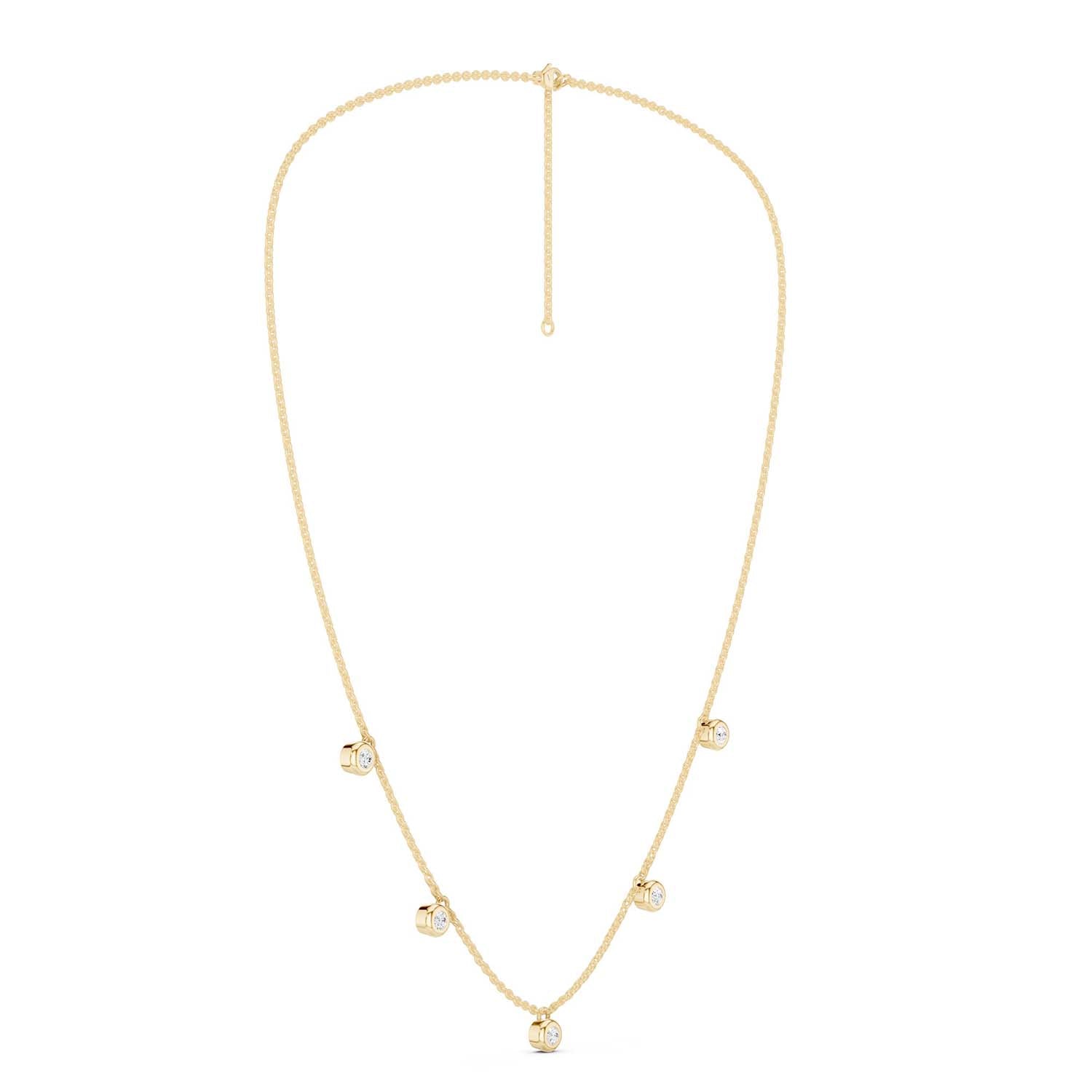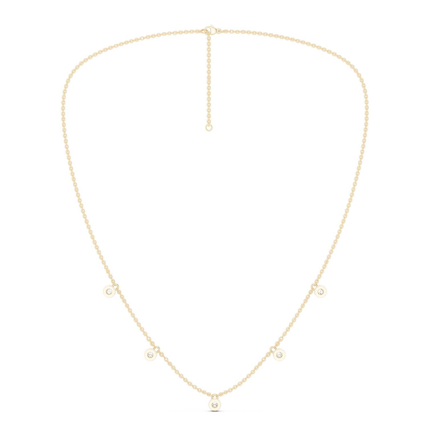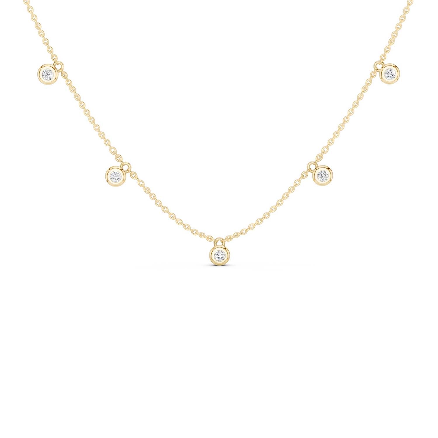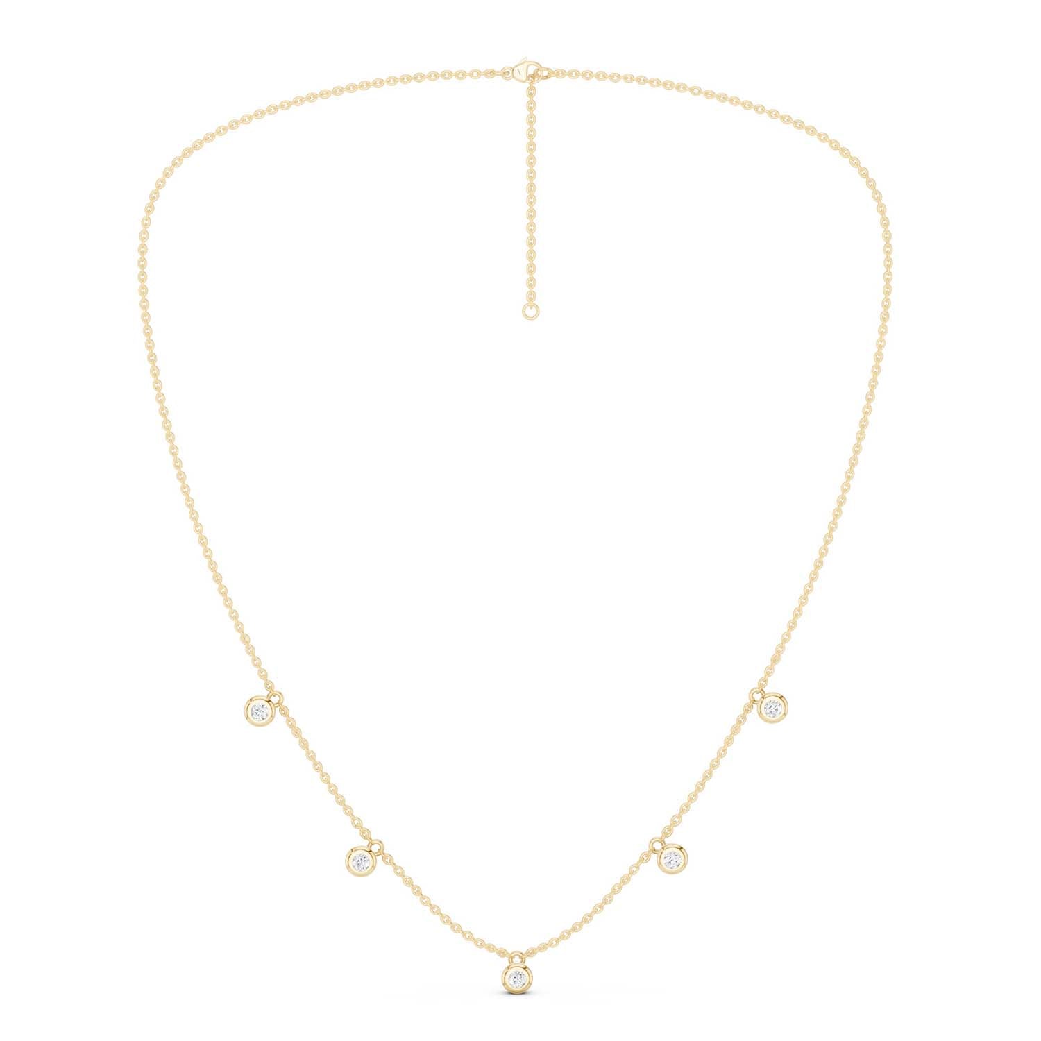 The versatile Mini-Round Encompassing Stationed Necklace showcases a series of carefully selected, round-cut diamonds, set in a manner that maximizes their radiance. It is a perfect blend of elegance and charm for those aspiring minimalists. With five stunning round bezel stations, this classic diamond necklace design offers endless layering possibilities.