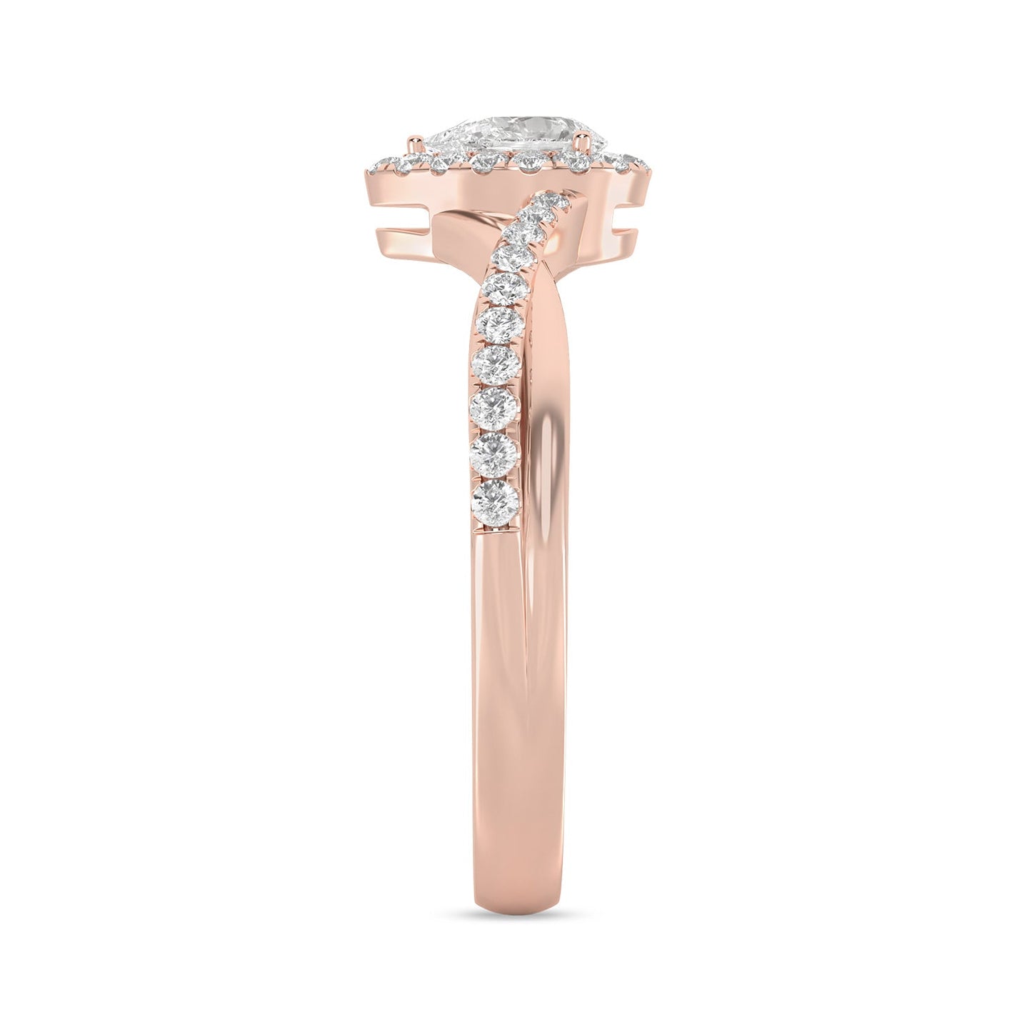 The My Crossover Peeking Dewdrop Halo Ring is a stunning ring with a round brilliant diamond peeking through a crossover halo of round diamonds. The ring is made of gold and has a split shank design that adds flair. It is a dazzling and eye-catching ring that will make you feel special.