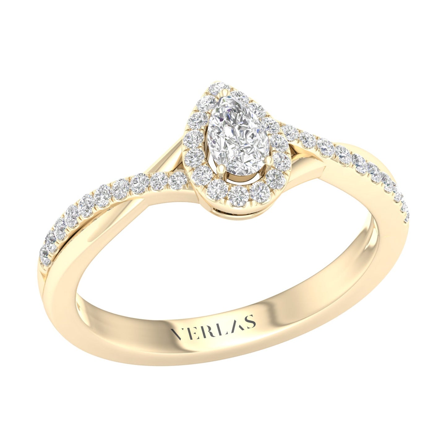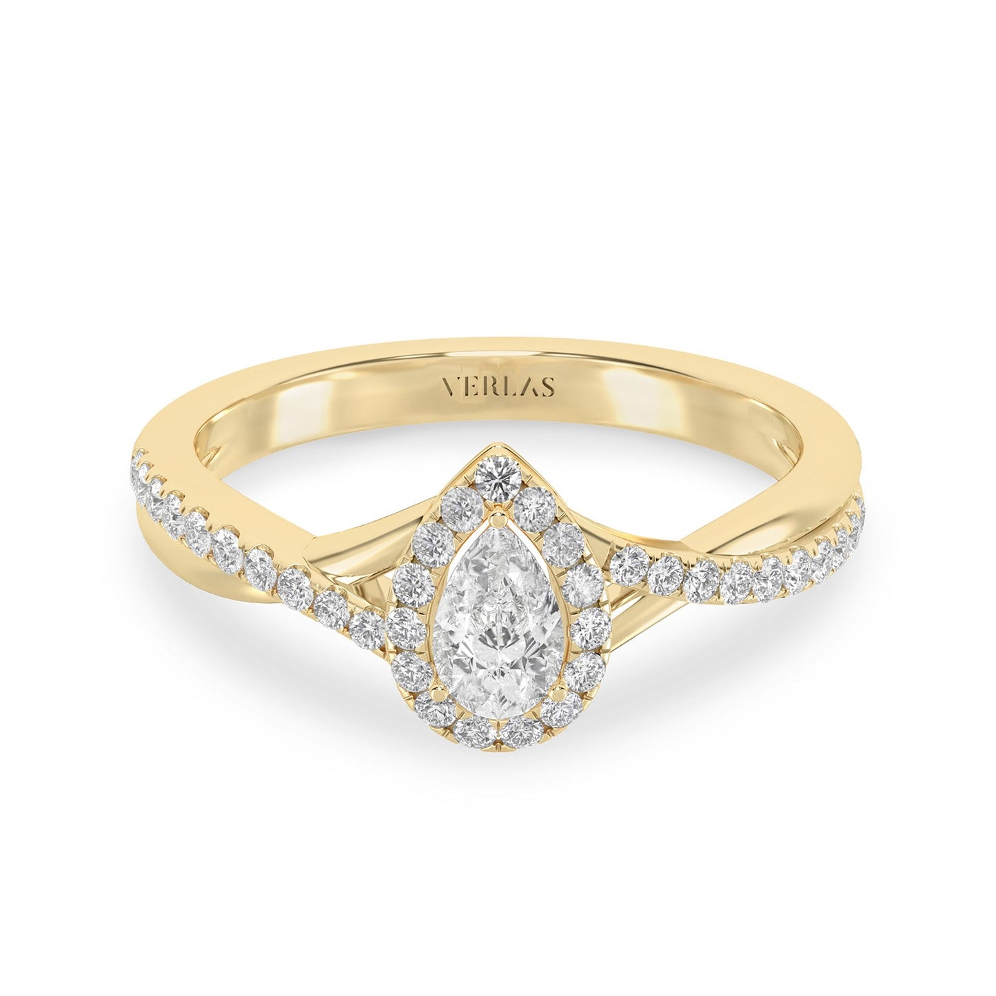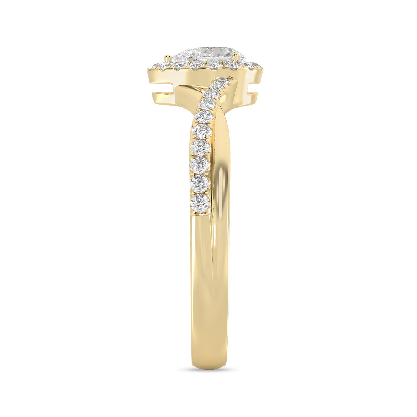 The My Crossover Peeking Dewdrop Halo Ring is a stunning ring with a round brilliant diamond peeking through a crossover halo of round diamonds. The ring is made of gold and has a split shank design that adds flair. It is a dazzling and eye-catching ring that will make y. . . Read More