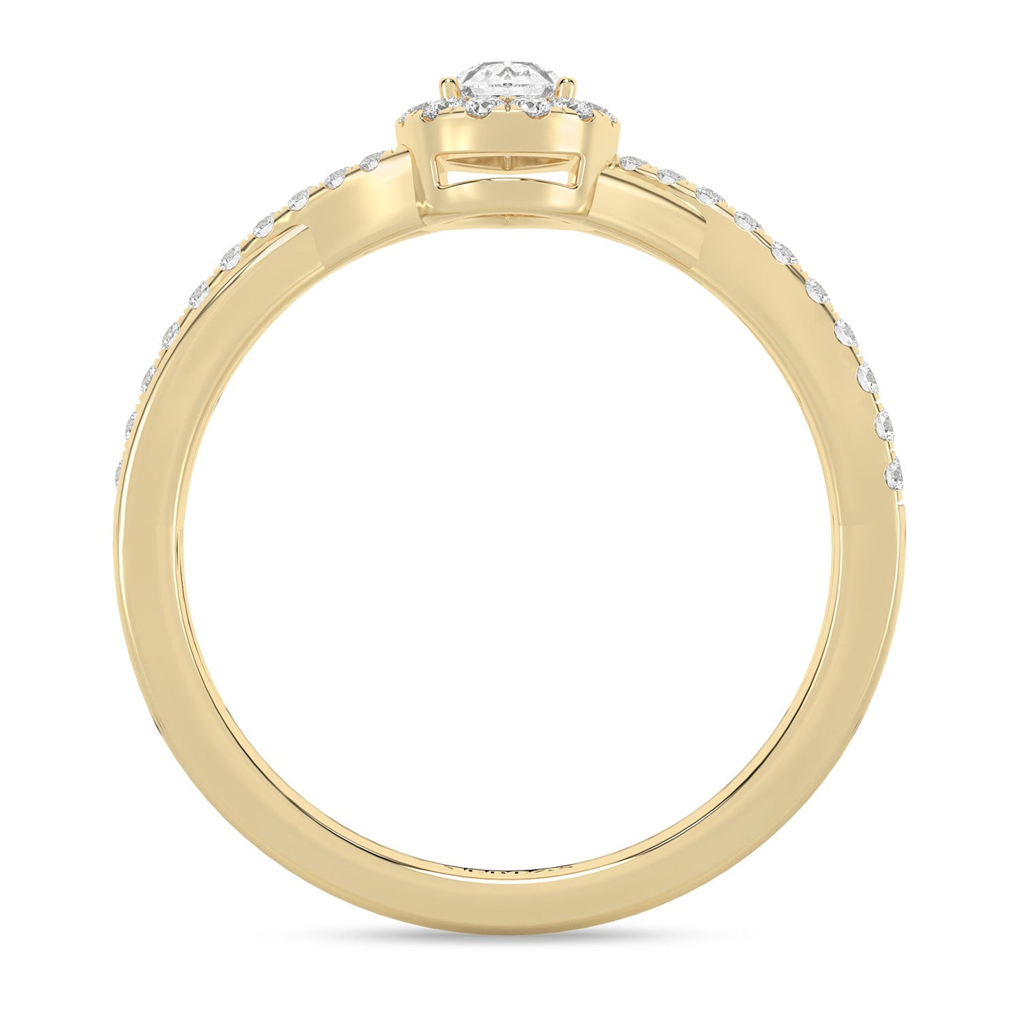 The My Crossover Peeking Dewdrop Halo Ring is a stunning ring with a round brilliant diamond peeking through a crossover halo of round diamonds. The ring is made of gold and has a split shank design that adds flair. It is a dazzling and eye-catching ring that will make you feel special.