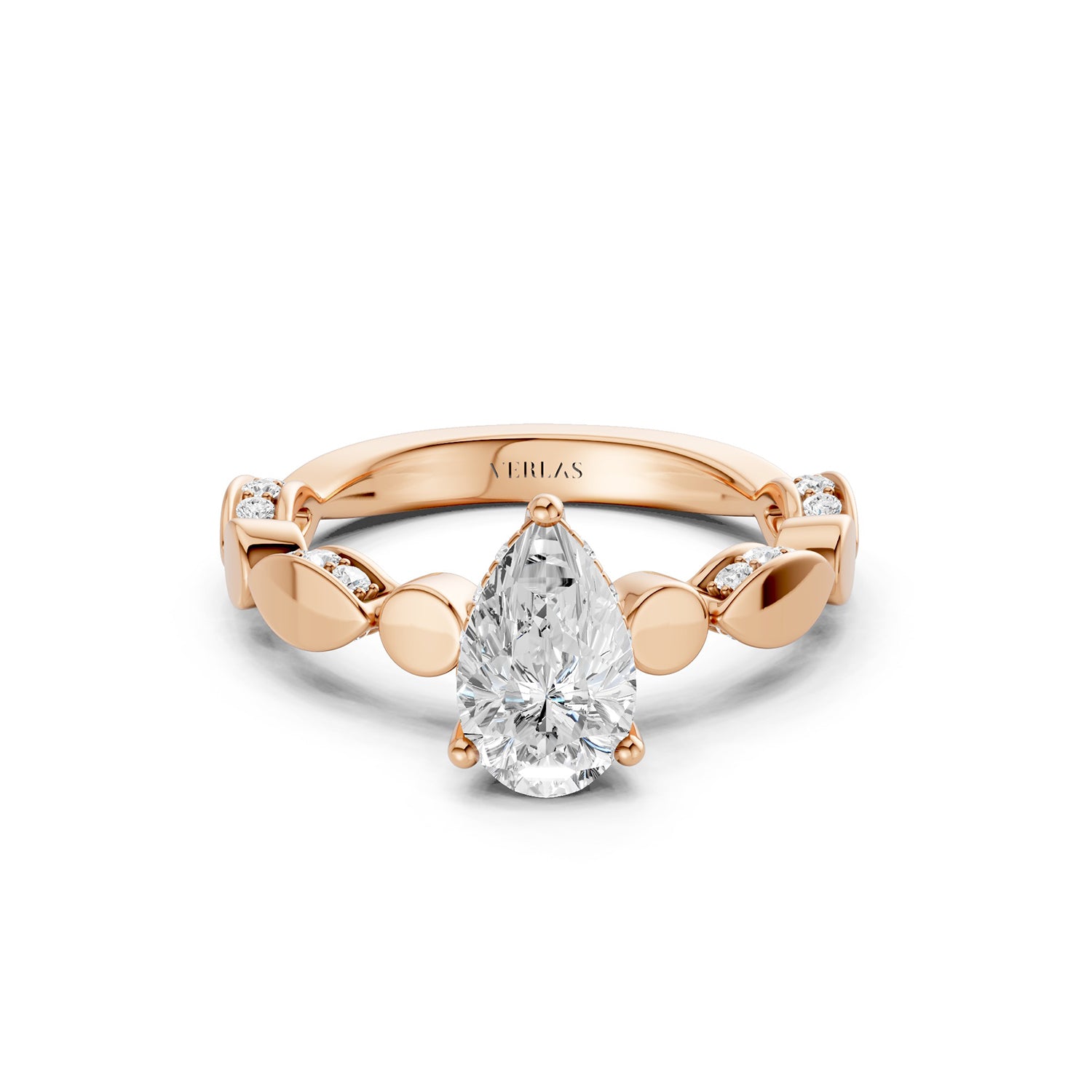 A modern classic with a twist — this lab-grown Pear Hidden Halo Accent Diamond Ring has a pear diamond that takes the center stage in a three-prong setting, resting above a hidden halo for secret sparkle. The band alternates marquise and round motifs, some polished gold, others with accent diamonds, creating a refined, organic elegance.