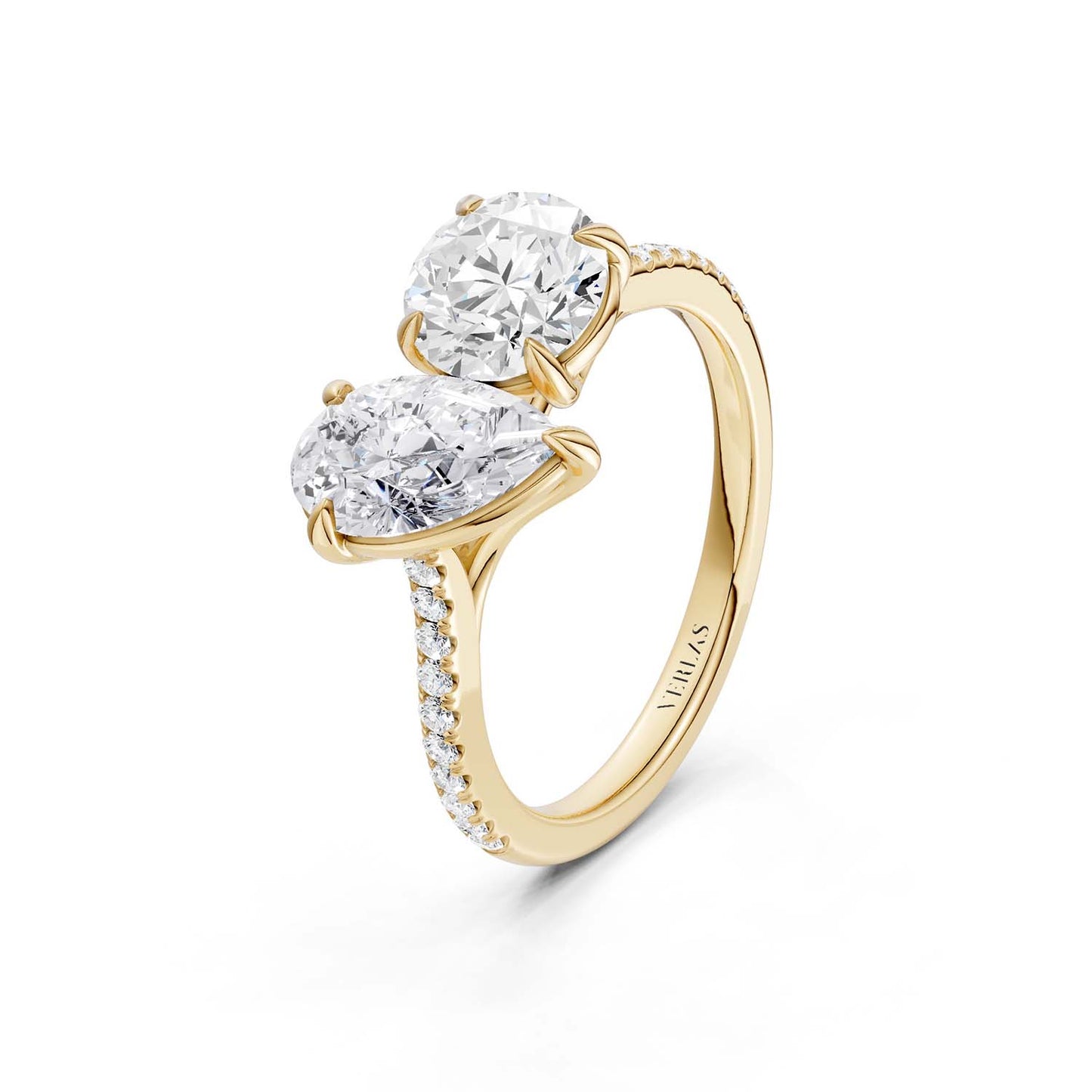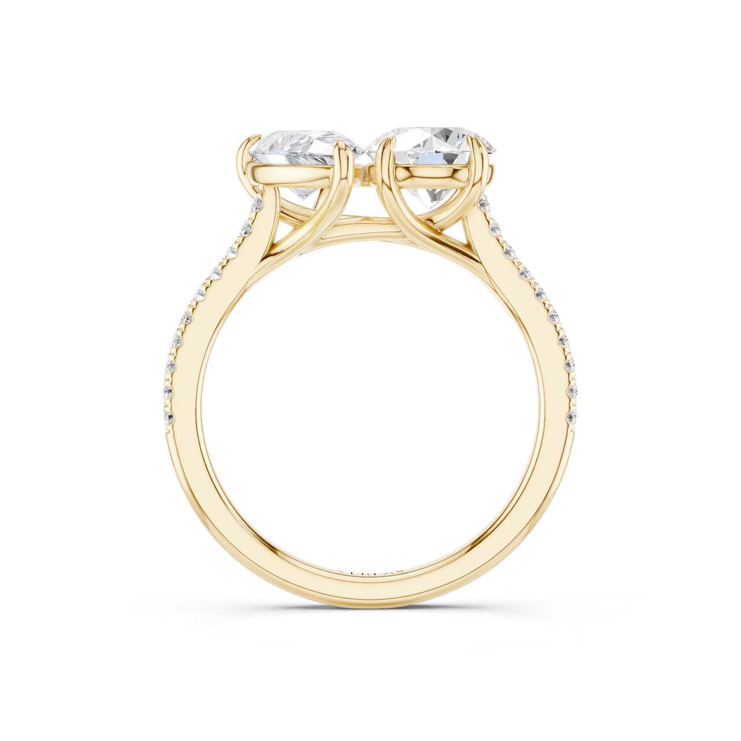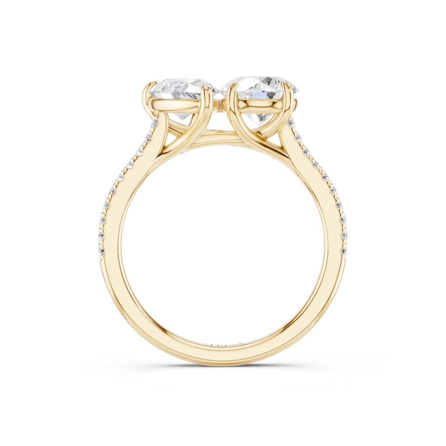 This Toi et Moi ring is a true embodiment of profound connections. The two-tone design features a pear and a round stone delicately nestled side by side upon a gleaming shank adorned with a cascade of diamonds. The pear represents the graceful, nurturing aspects of love, while the round stone symbolizes eternity, signifying the unwavering bond between two souls.