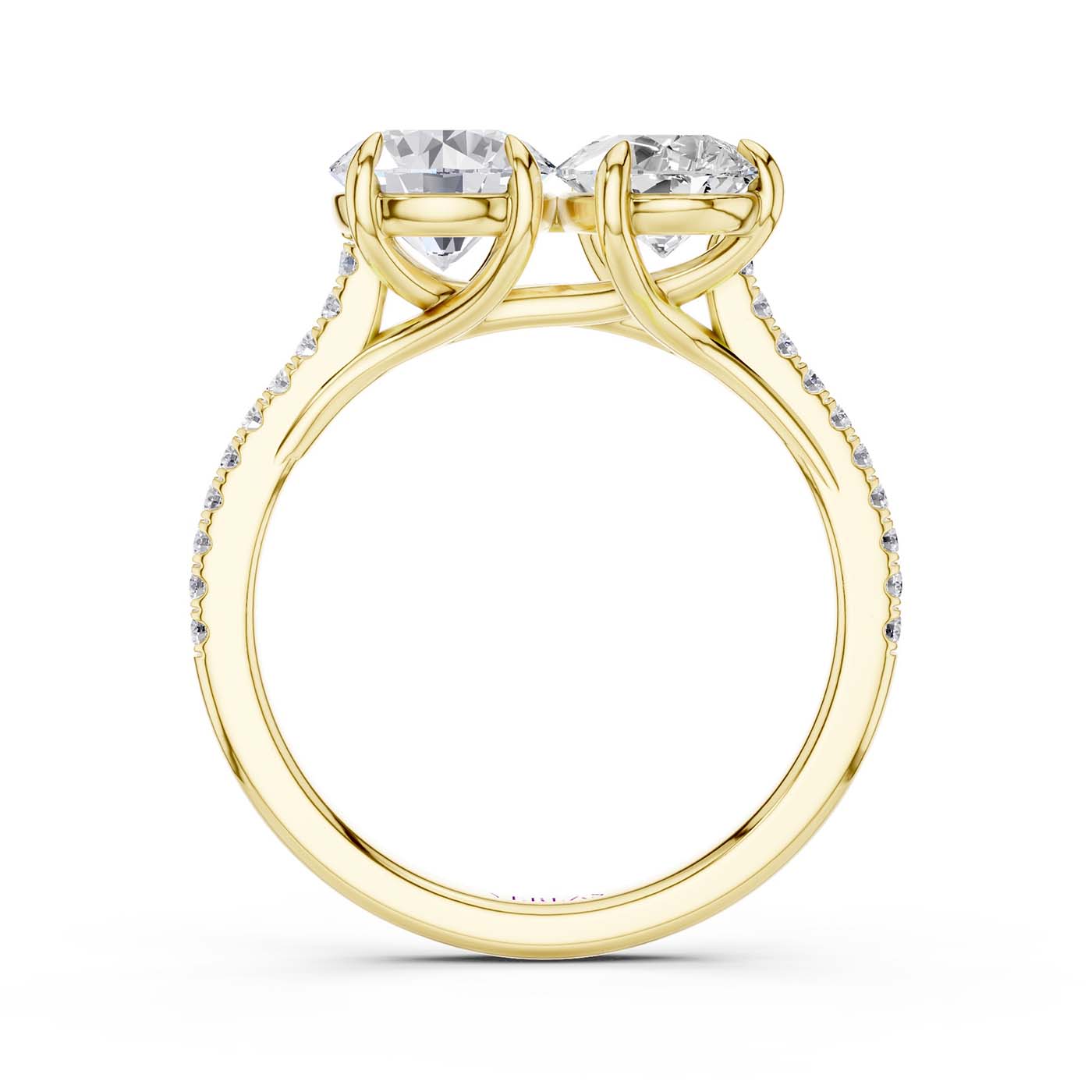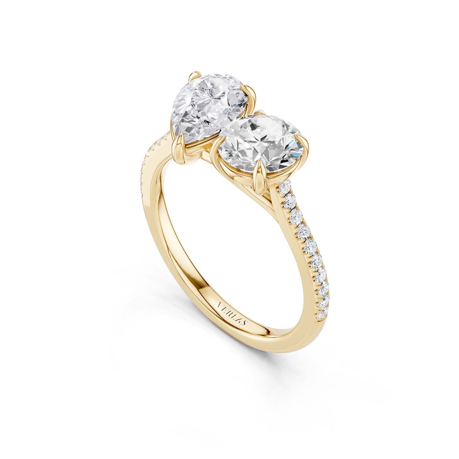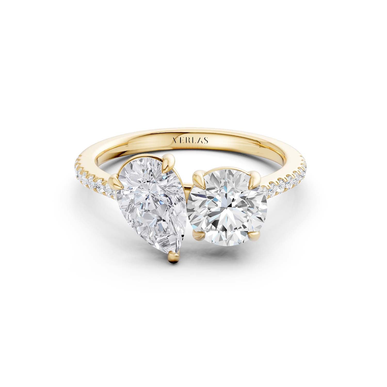 This Toi et Moi ring is a true embodiment of profound connections. The two-tone design features a pear and a round stone delicately nestled side by side upon a gleaming shank adorned with a cascade of diamonds. The pear represents the graceful, nurturing aspects of love, while the round stone symbolizes eternity, signifying the unwavering bond between two souls.