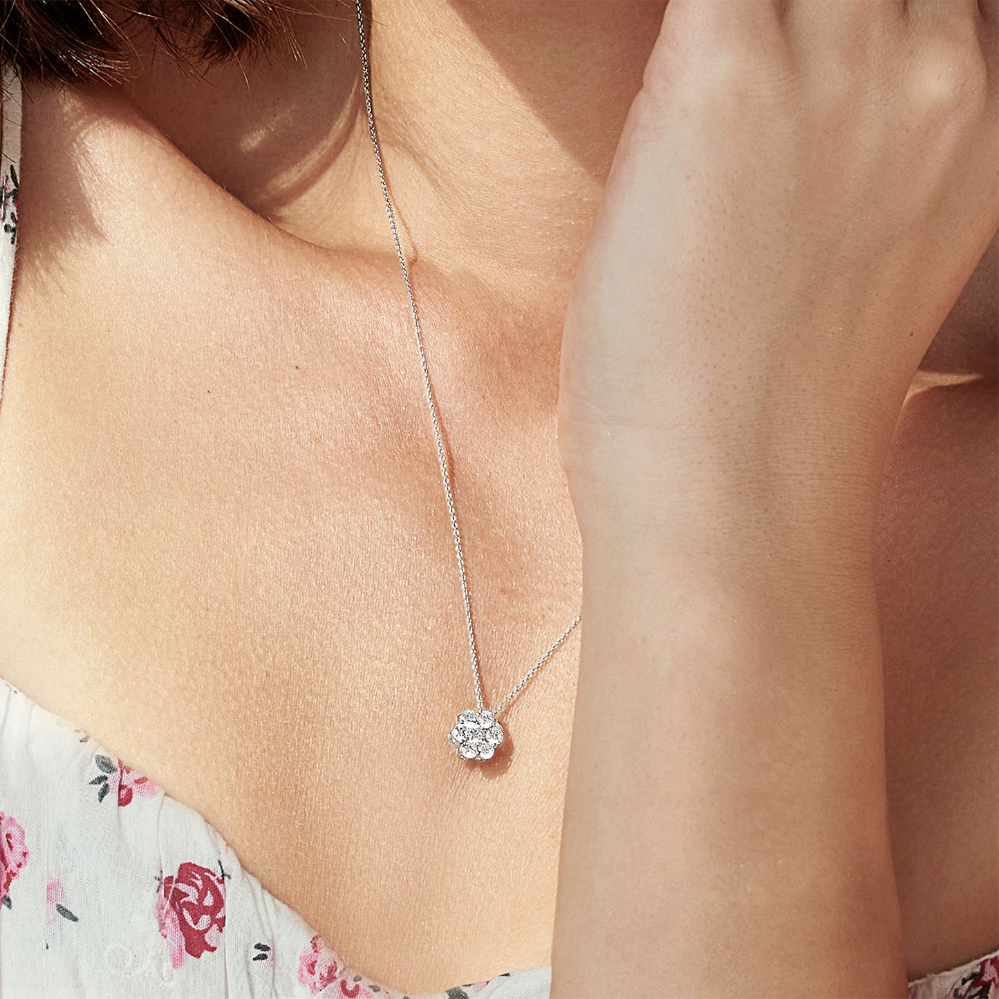 This gorgeous Primrose Necklace features a delicate chain with a floral pendant. The diamond pendant necklace shimmers with every movement, reflecting the light and creating an alluring effect. Symbolizing love, beauty, and hope, this necklace is a perfect gift for someone special or a treat for yourself.