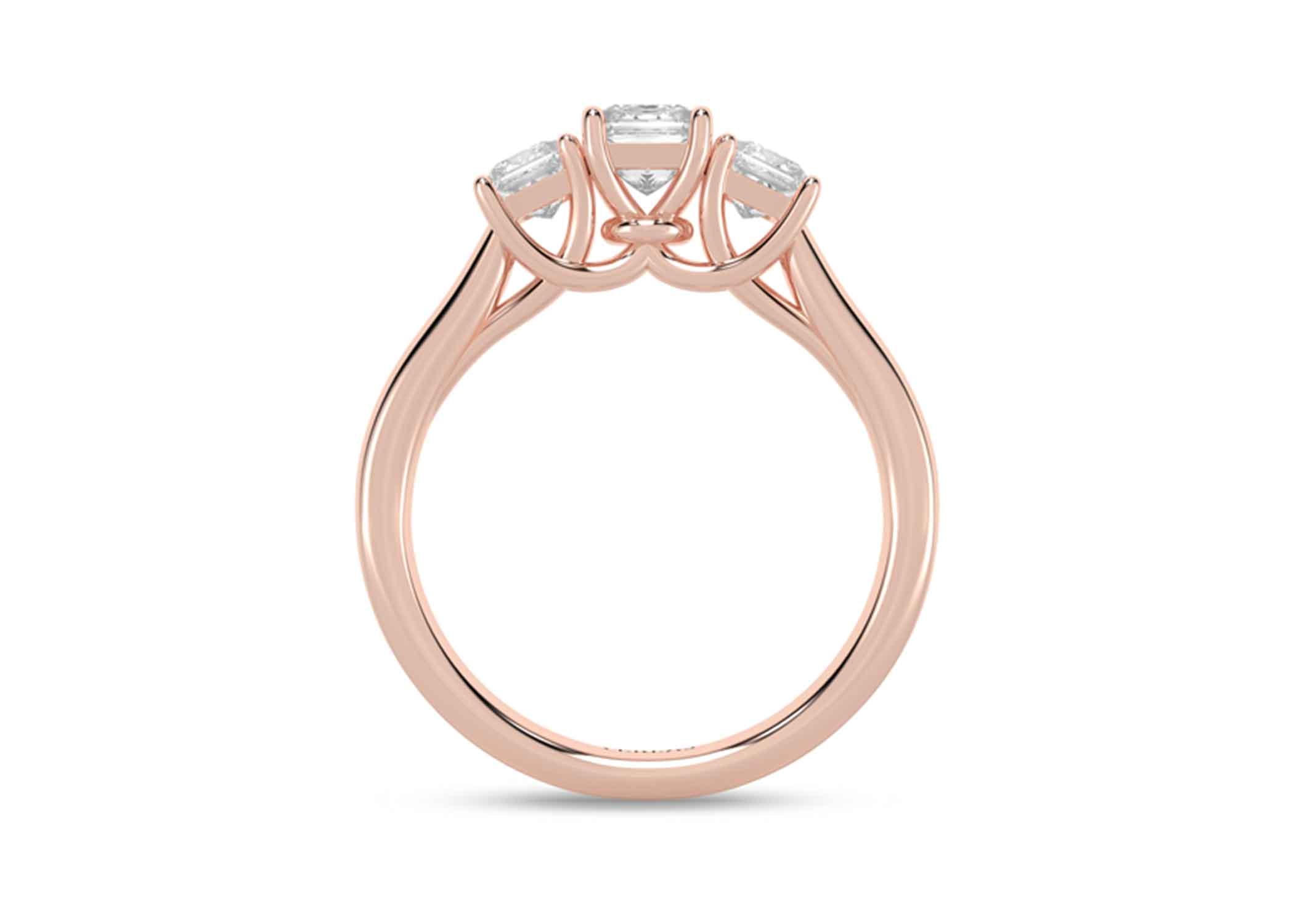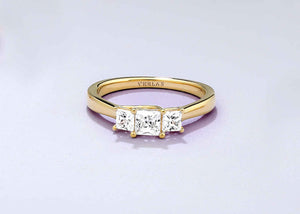 The Princess Vows diamond ring is classic, elegant, and iconic. It features three princess-cut diamonds placed next to each other on a gold ring in a prong setting. The princess vows design symbolizes love and commitment. The three princess-cut diamonds add sparkle and brilliance to the ring, making it a stunning statement piece to celebrate your love.