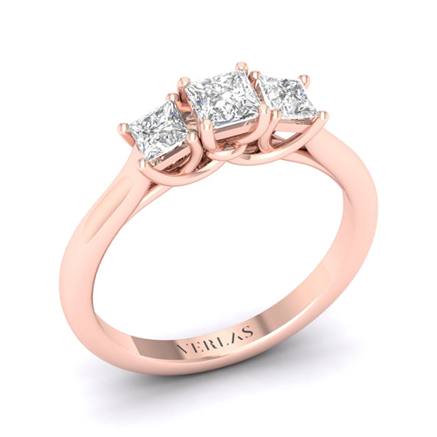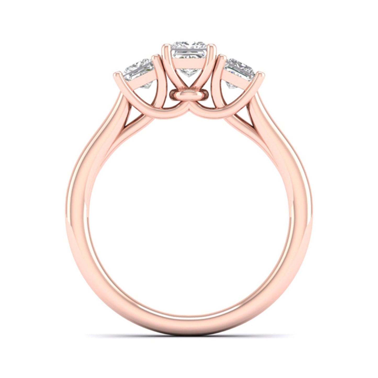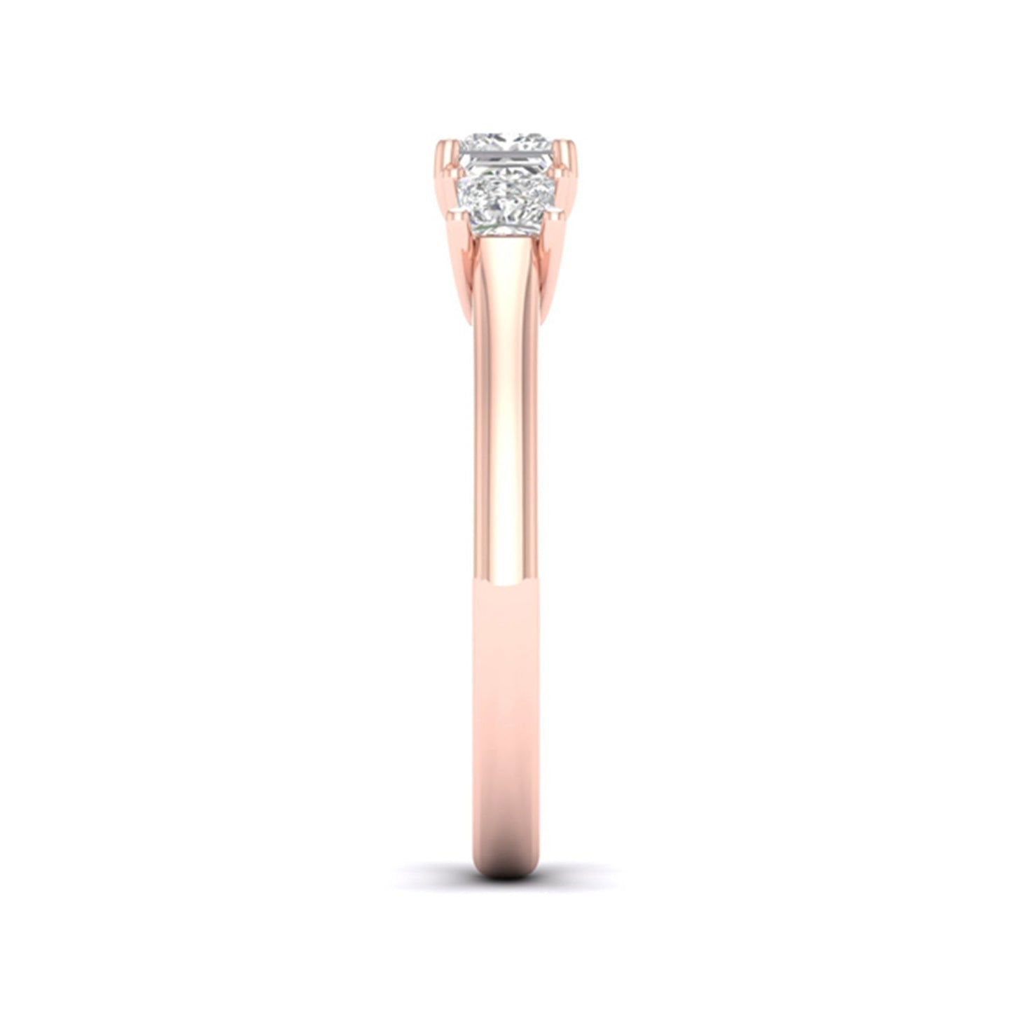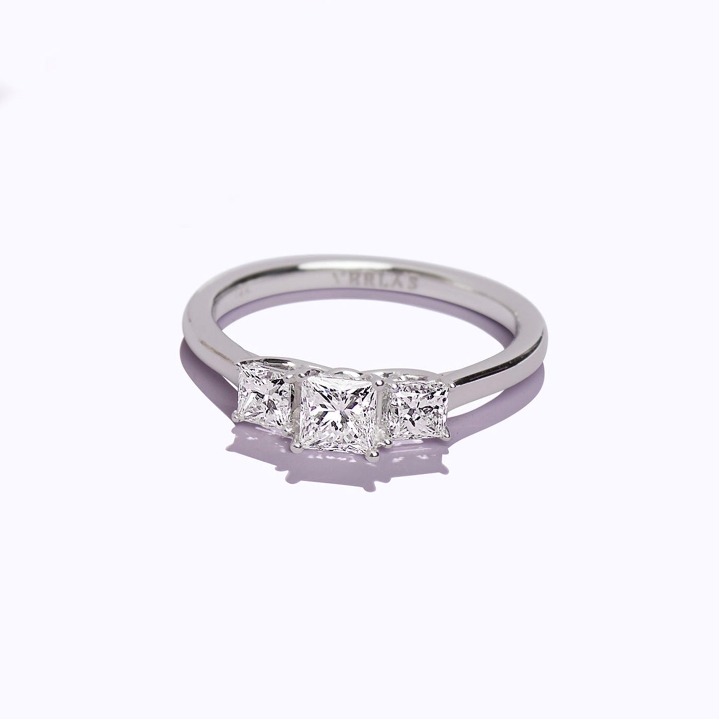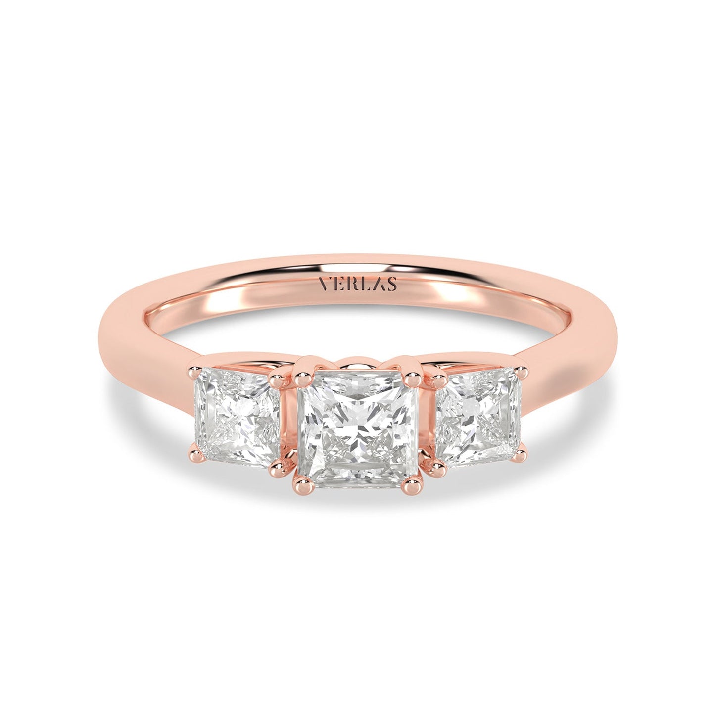 The Princess Vows diamond ring is classic, elegant, and iconic. It features three princess-cut diamonds placed next to each other on a gold ring in a prong setting. The princess vows design symbolizes love and commitment. The three princess-cut diamonds add sparkle and brilliance to the ring, making it a stunning statement piece to celebrate your love.