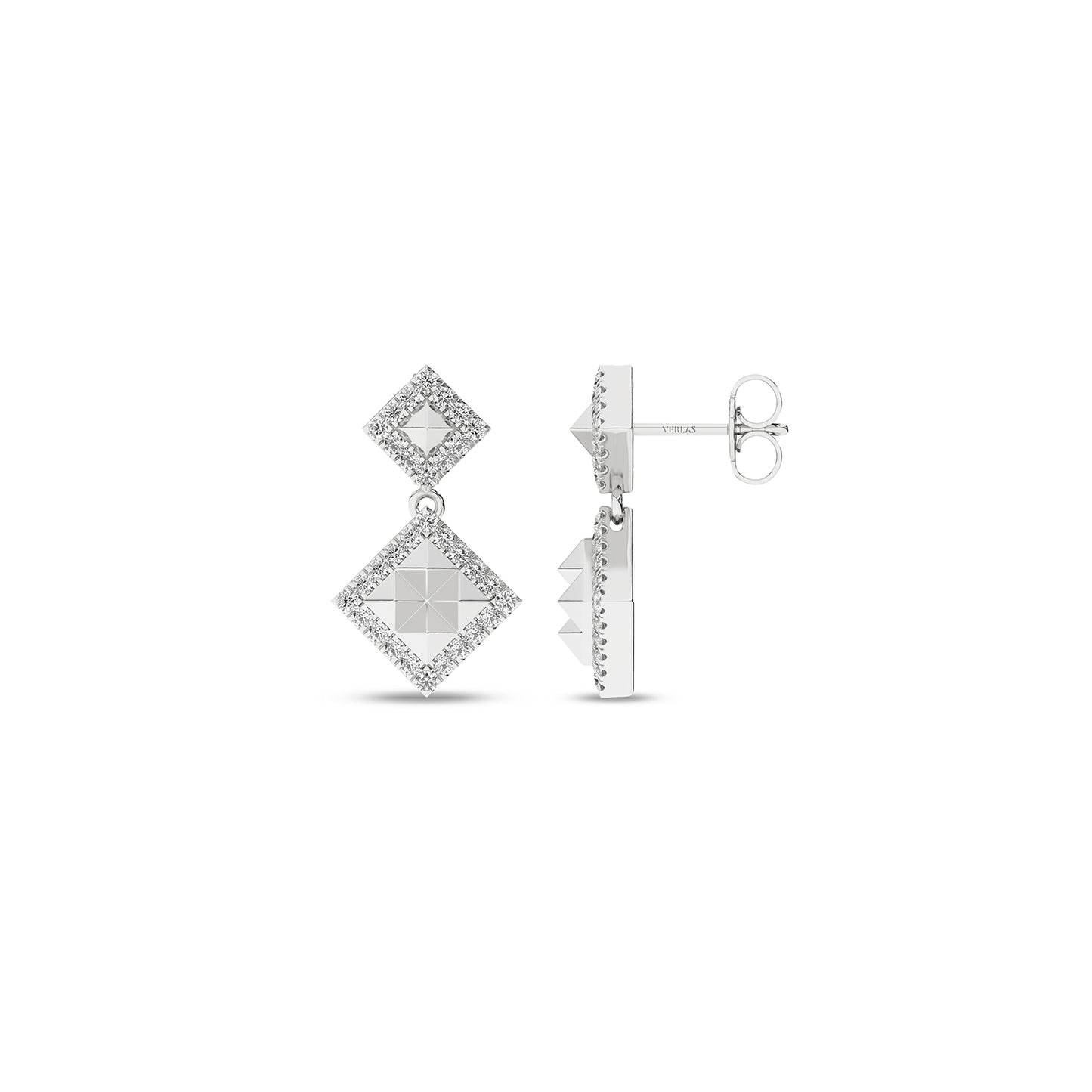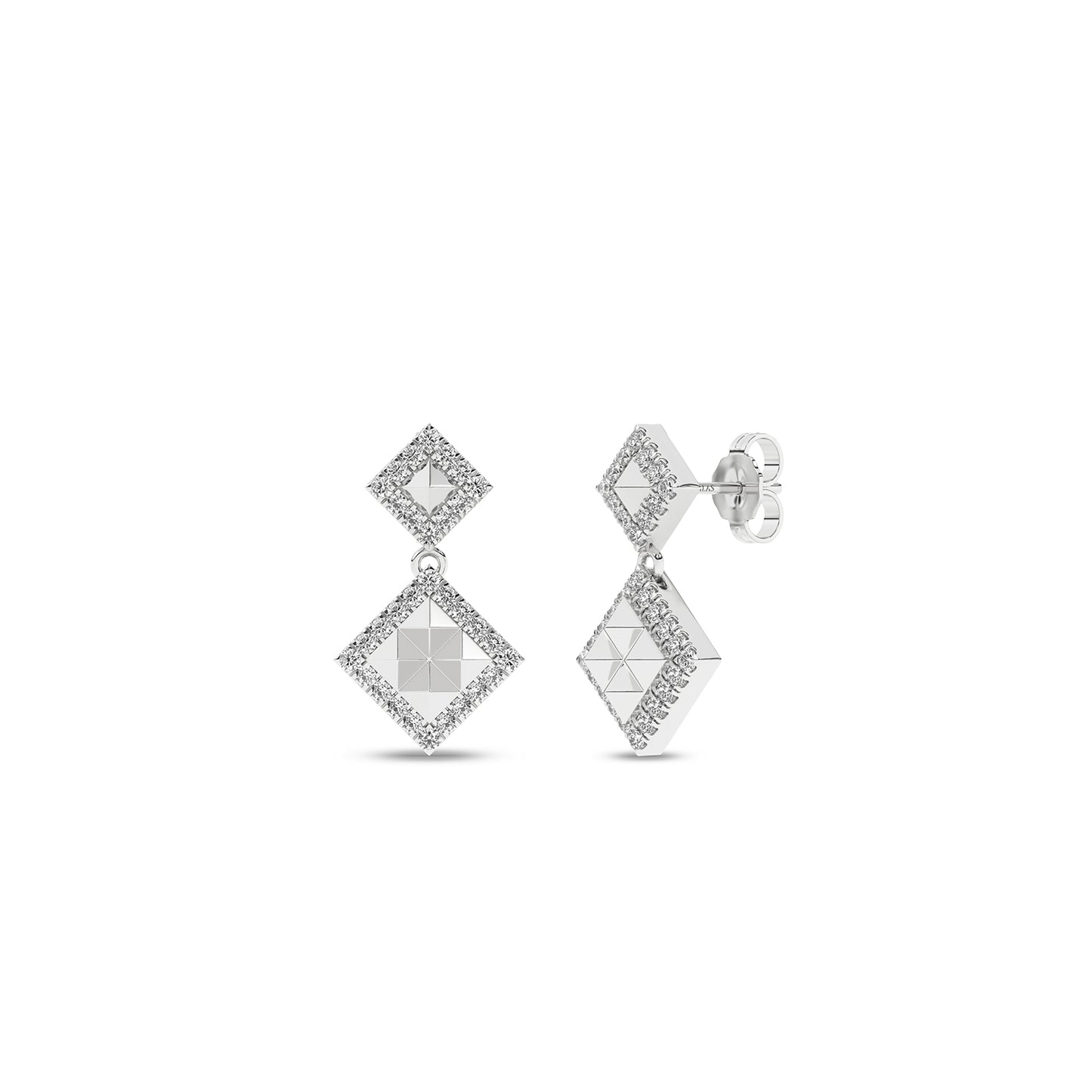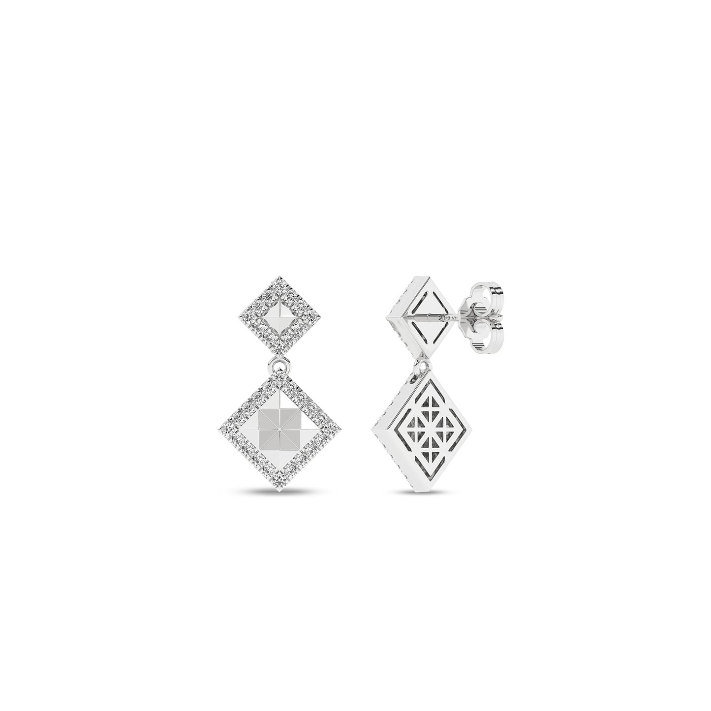The Pyramid Luxe Geometric Contour Earrings feature two vertically stacked squares. The upper square showcases a bold single pyramid motif, while the larger lower square captivates with four pyramid motifs. Each square is encrusted with sparkling lab-grown diamonds, creating a dazzling finish from every angle. These diamond drop earrings are perfect for those who love geometry designs and sustainable luxury. Certified and crafted with high-quality materials, these diamond earrings offer elegance with a modern twist.
