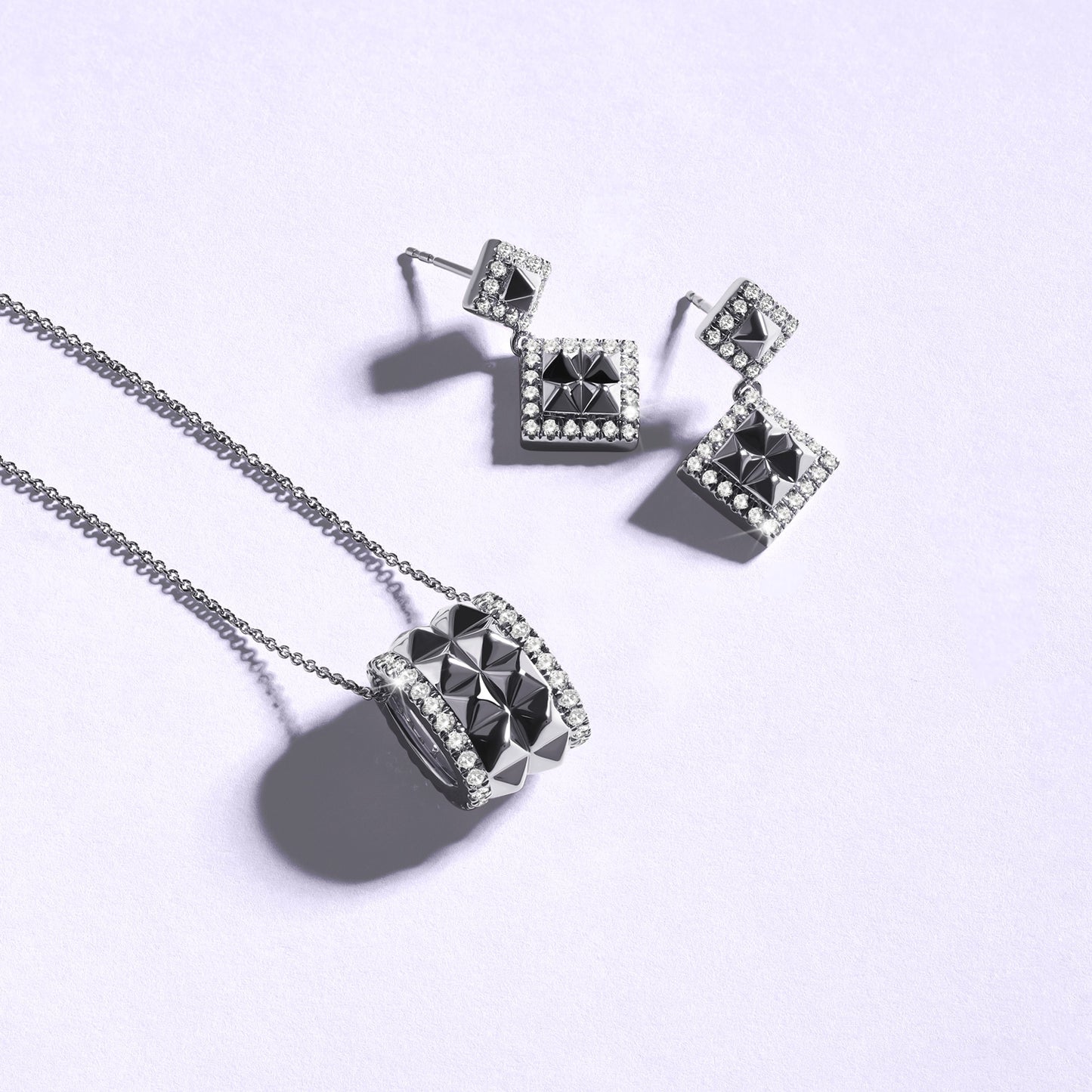 The Pyramid Luxe Geometric Contour Earrings feature two vertically stacked squares. The upper square showcases a bold single pyramid motif, while the larger lower square captivates with four pyramid motifs. Each square is encrusted with sparkling lab-grown diamonds, crea. . . Read More