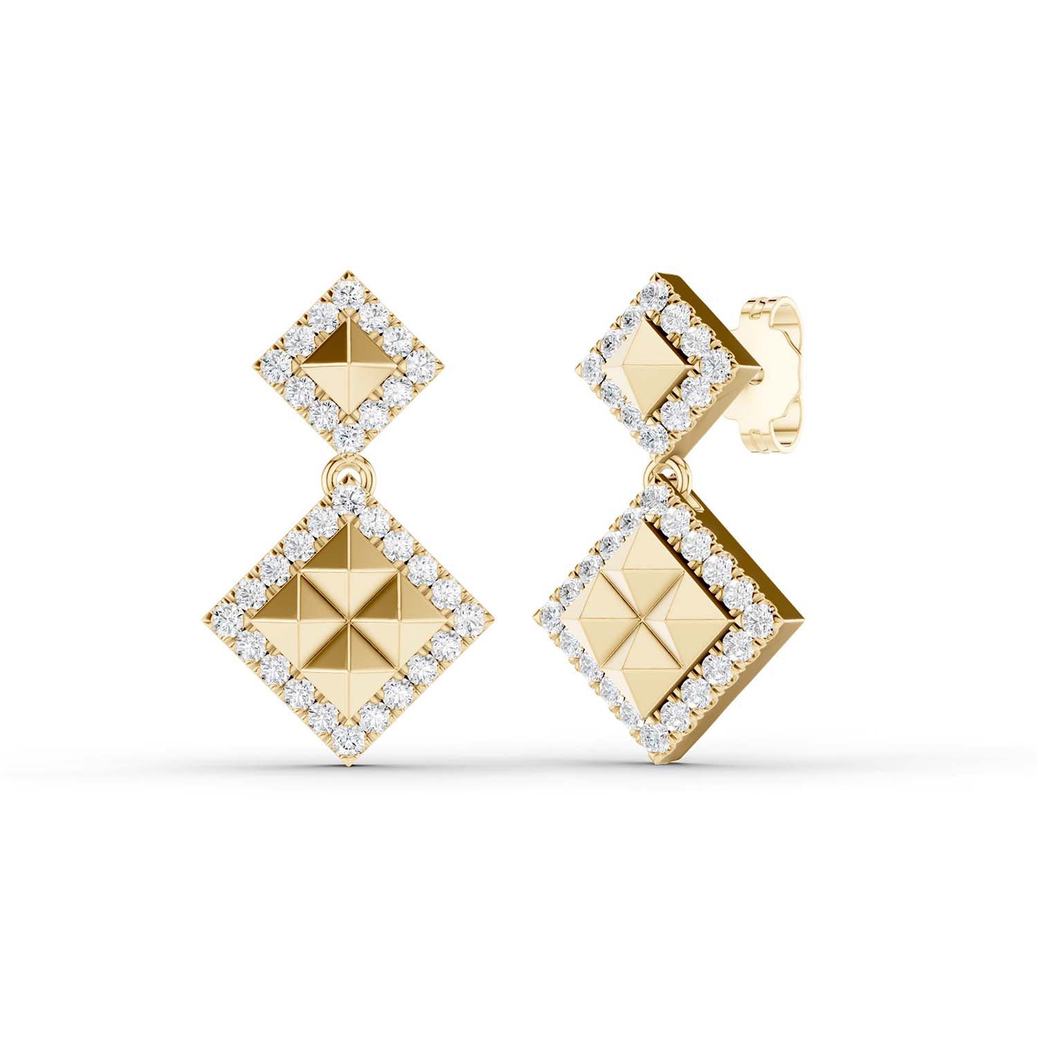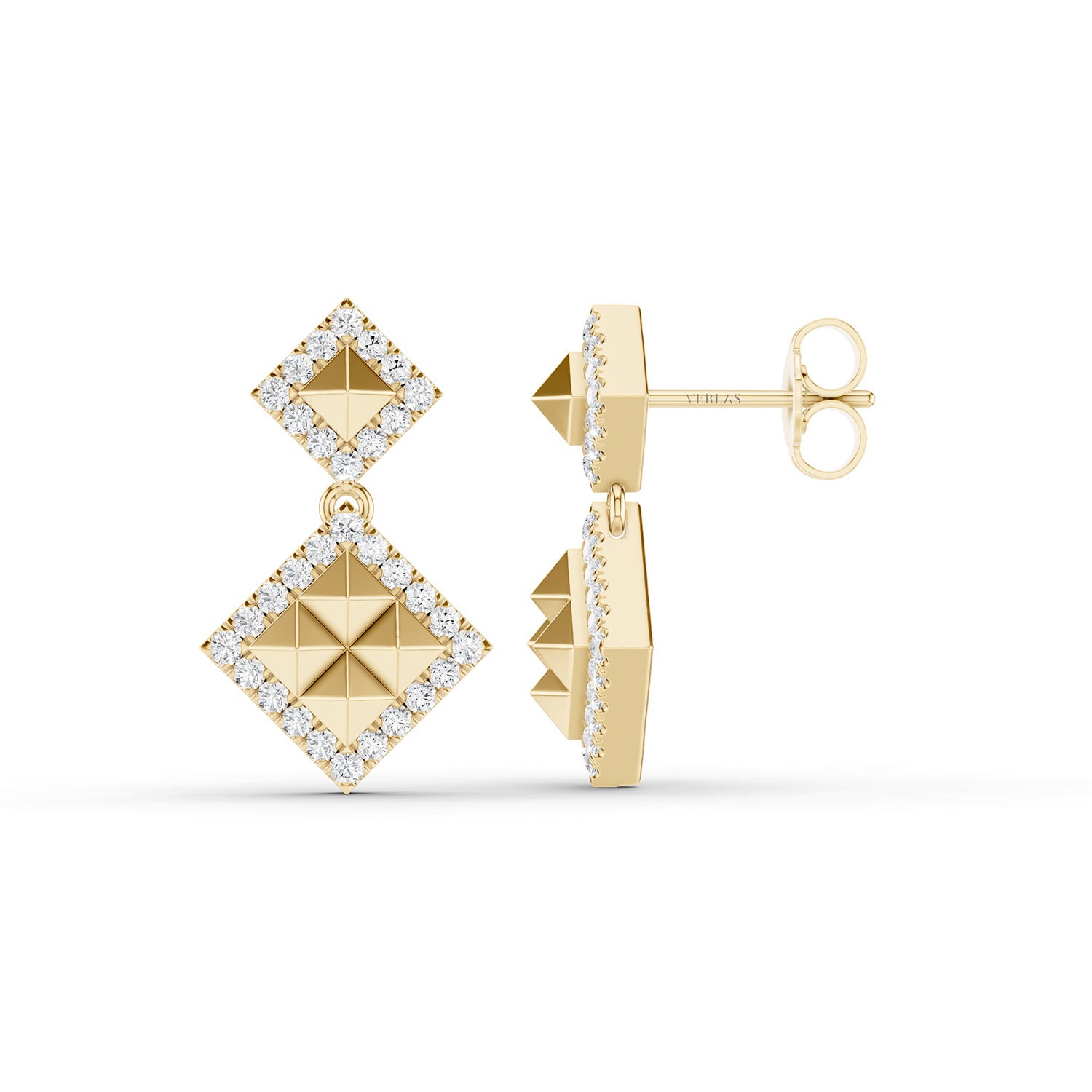 The Pyramid Luxe Geometric Contour Earrings feature two vertically stacked squares. The upper square showcases a bold single pyramid motif, while the larger lower square captivates with four pyramid motifs. Each square is encrusted with sparkling lab-grown diamonds, creating a dazzling finish from every angle. These diamond drop earrings are perfect for those who love geometry designs and sustainable luxury. Certified and crafted with high-quality materials, these diamond earrings offer elegance with a modern twist.