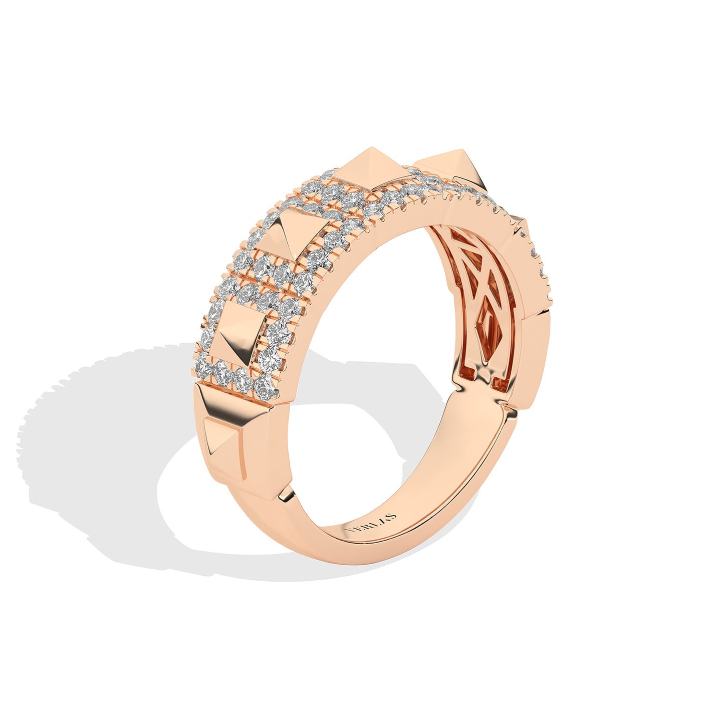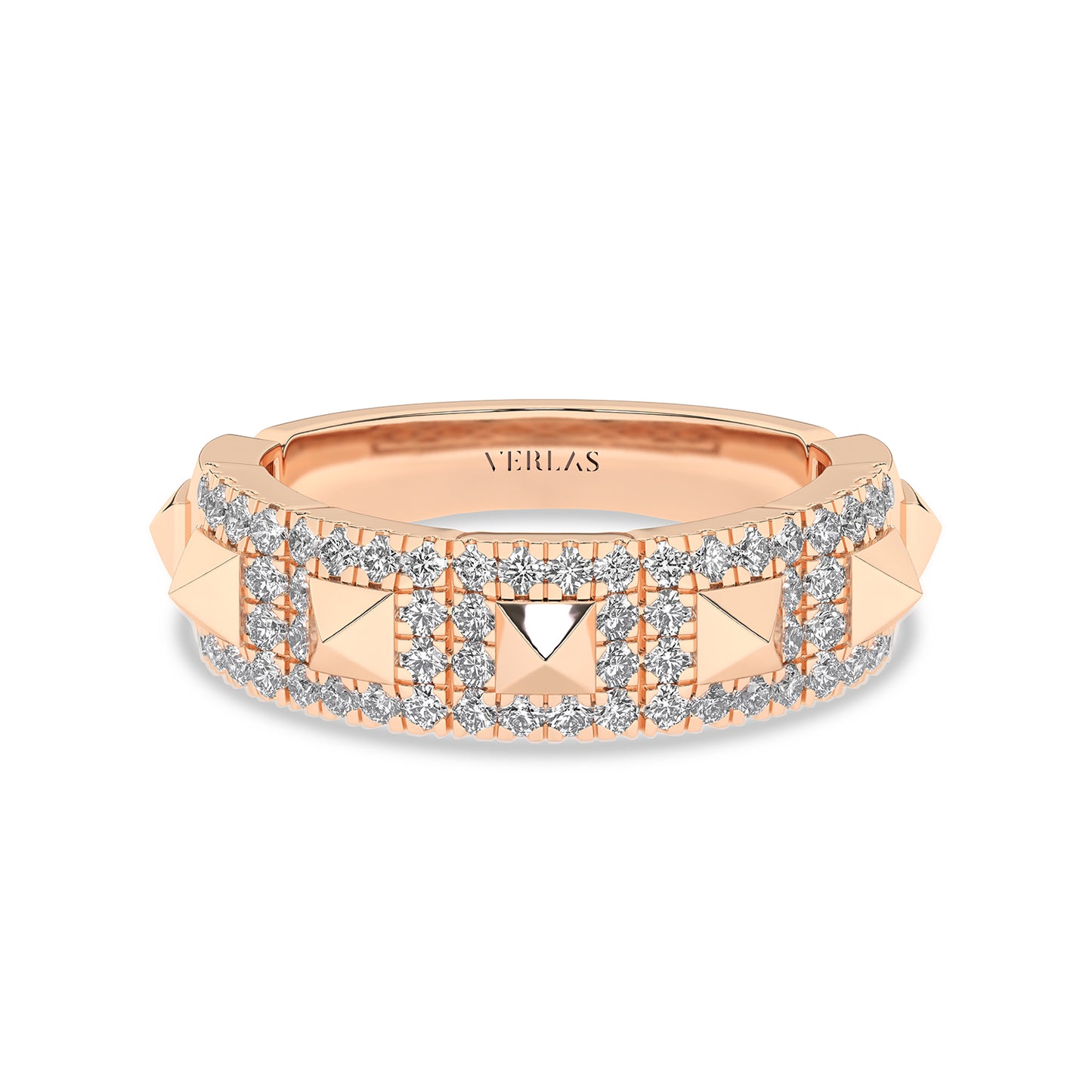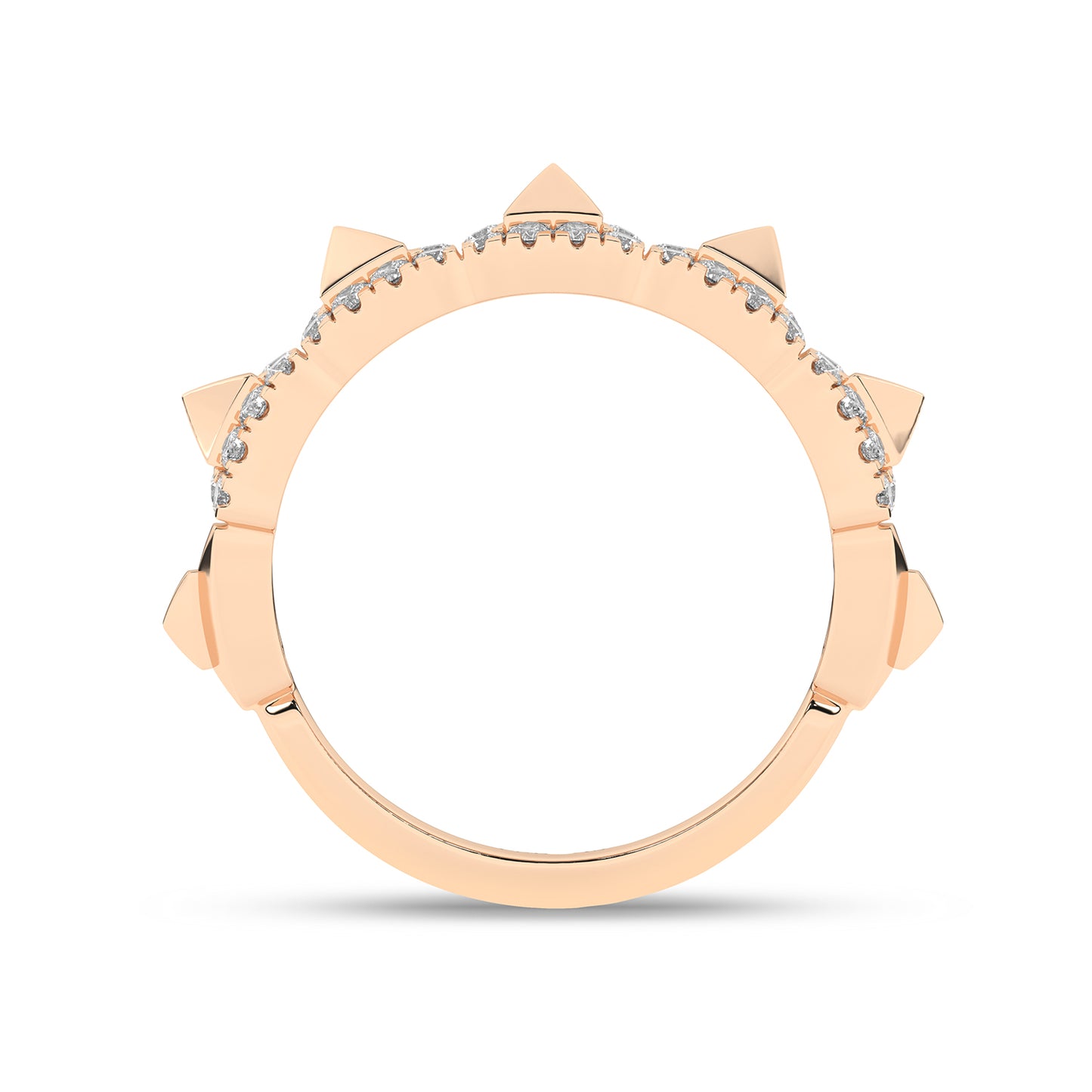 Understated yet elegant, the Pyramid Luxe Geometric Sleek Band offers a refined take on everyday luxury. Featuring a delicate row of three-dimensional pyramid motifs, meticulously encrusted with sparkling lab-grown diamonds, it exudes a subtle shimmer that complements any look. The unique geometric elements deliver a modern edge, making this band a statement of individuality. Ideal for those seeking a chic, contemporary look with a classic edge, this diamond band makes a sleek, luxurious statement. The sleek profile ensures a timeless charm that pairs effortlessly with any outfit.