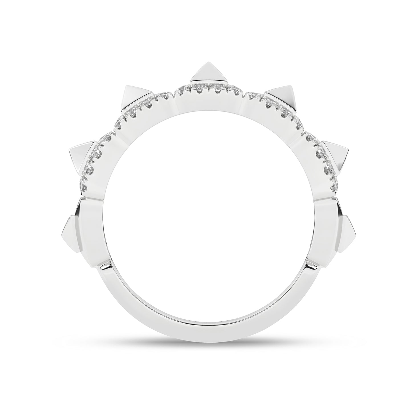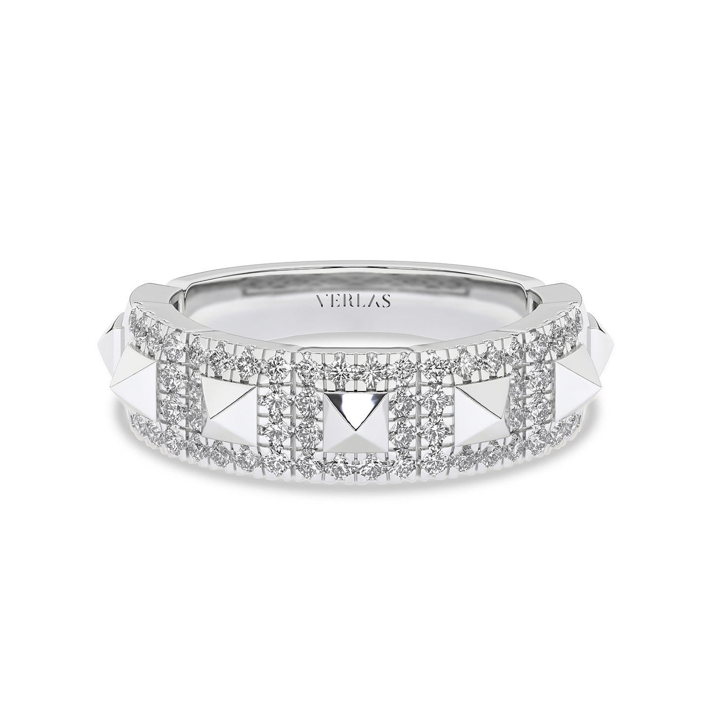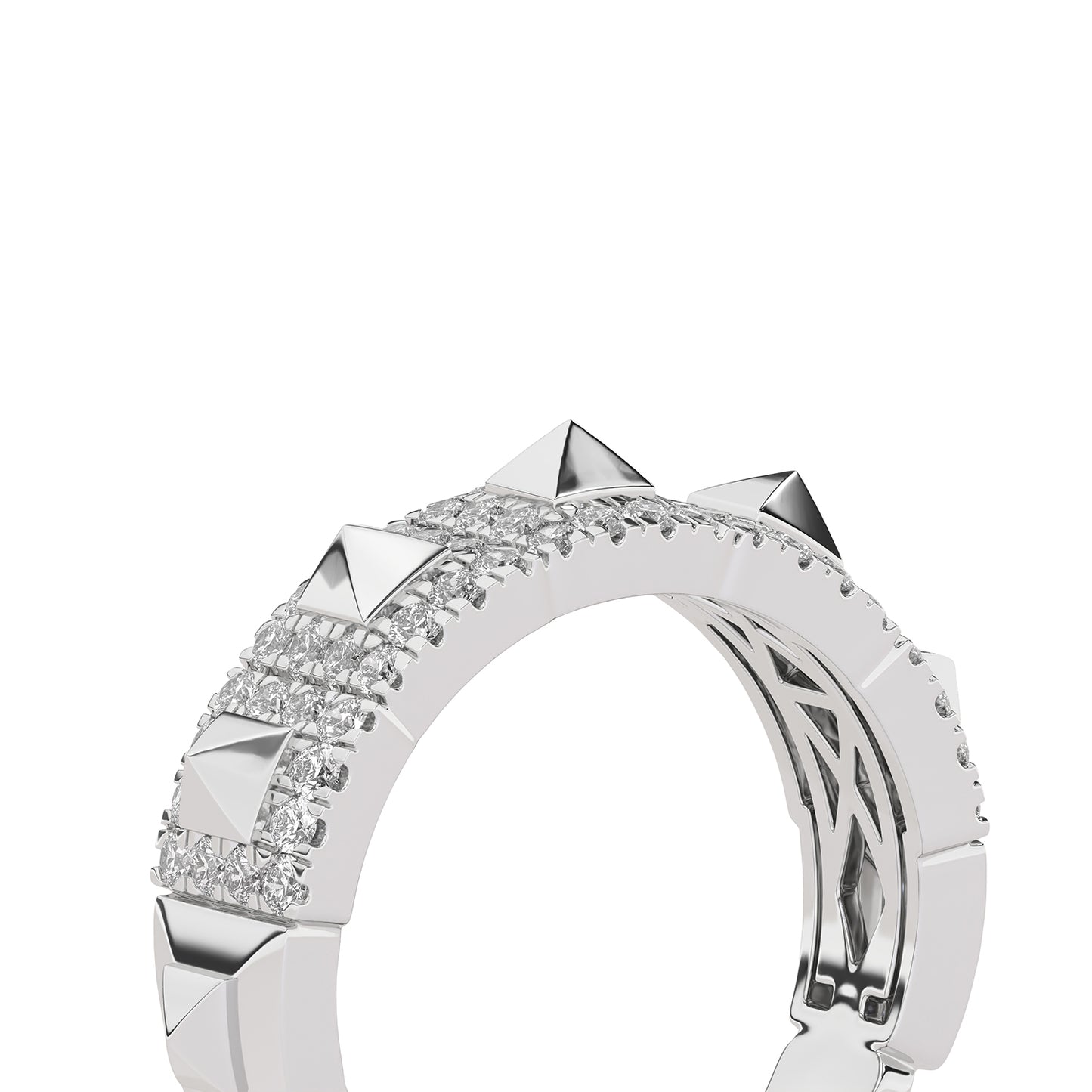 Understated yet elegant, the Pyramid Luxe Geometric Sleek Band offers a refined take on everyday luxury. Featuring a delicate row of three-dimensional pyramid motifs, meticulously encrusted with sparkling lab-grown diamonds, it exudes a subtle shimmer that complements any look. The unique geometric elements deliver a modern edge, making this band a statement of individuality. Ideal for those seeking a chic, contemporary look with a classic edge, this diamond band makes a sleek, luxurious statement. The sleek profile ensures a timeless charm that pairs effortlessly with any outfit.