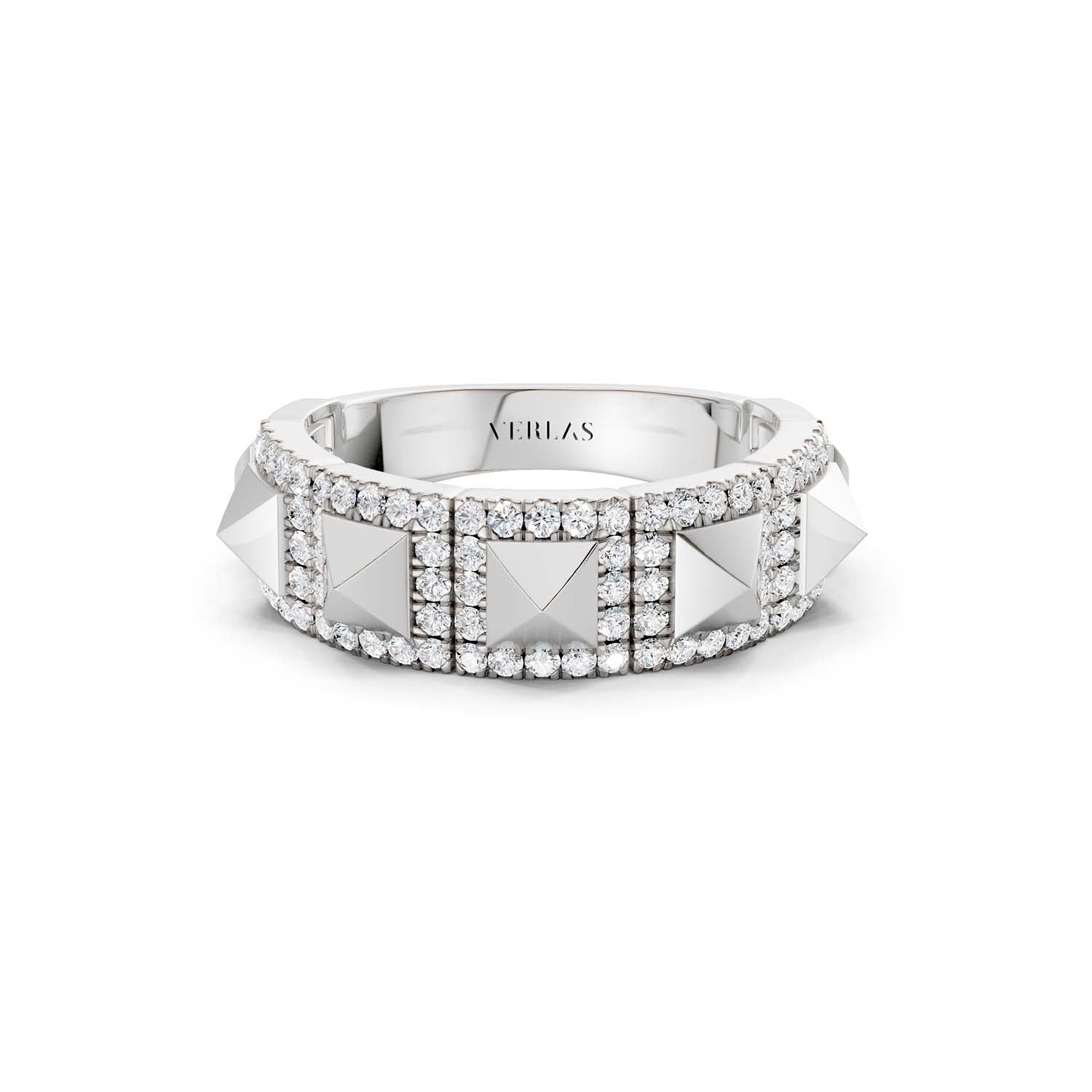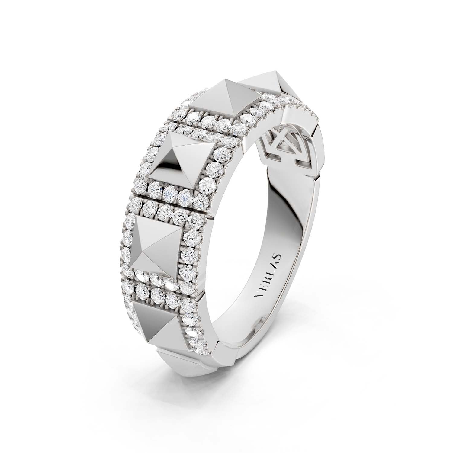 Make a bold statement with the Pyramid Luxe Geometric Statement Band, where contemporary design meets timeless elegance. This striking band showcases a captivating interplay of three-dimensional pyramid-like shapes, and rectangular sections, all polished to perfection. The rectangular sections are beautifully encrusted with sparkling lab-grown diamonds, adding a touch of classic sophistication. With its striking size and dramatic sparkle, this band is ideal for those who love a bold, glamorous look that stands out from the crowd. Wear it as a standalone accessory or stack it for a more layered look.