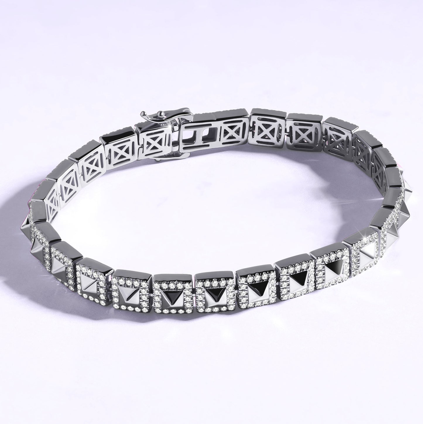 Introducing the Pyramid Luxe Geometric Tennis Bracelet, where modern artistry meets timeless sophistication. This striking diamond tennis bracelet showcases a series of pyramid motifs, each elegantly encased in its own rectangular frame, creating a captivating geometric design. Surrounding each pyramid are shimmering lab-grown diamond accents that elevate the piece with their radiant sparkle, offering a stunning contrast to the bold shapes. Whether you're dressing up for a special occasion or adding a touch of glam to your everyday wear, this bracelet is the perfect accessory to enhance any outfit.