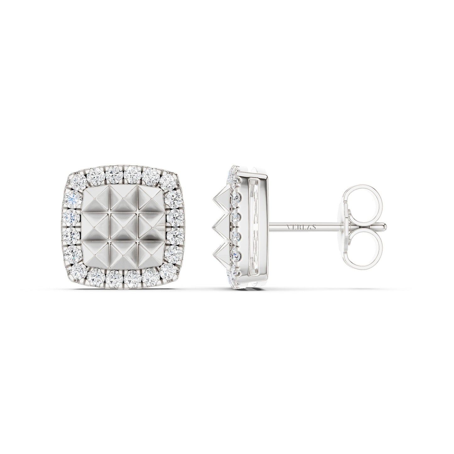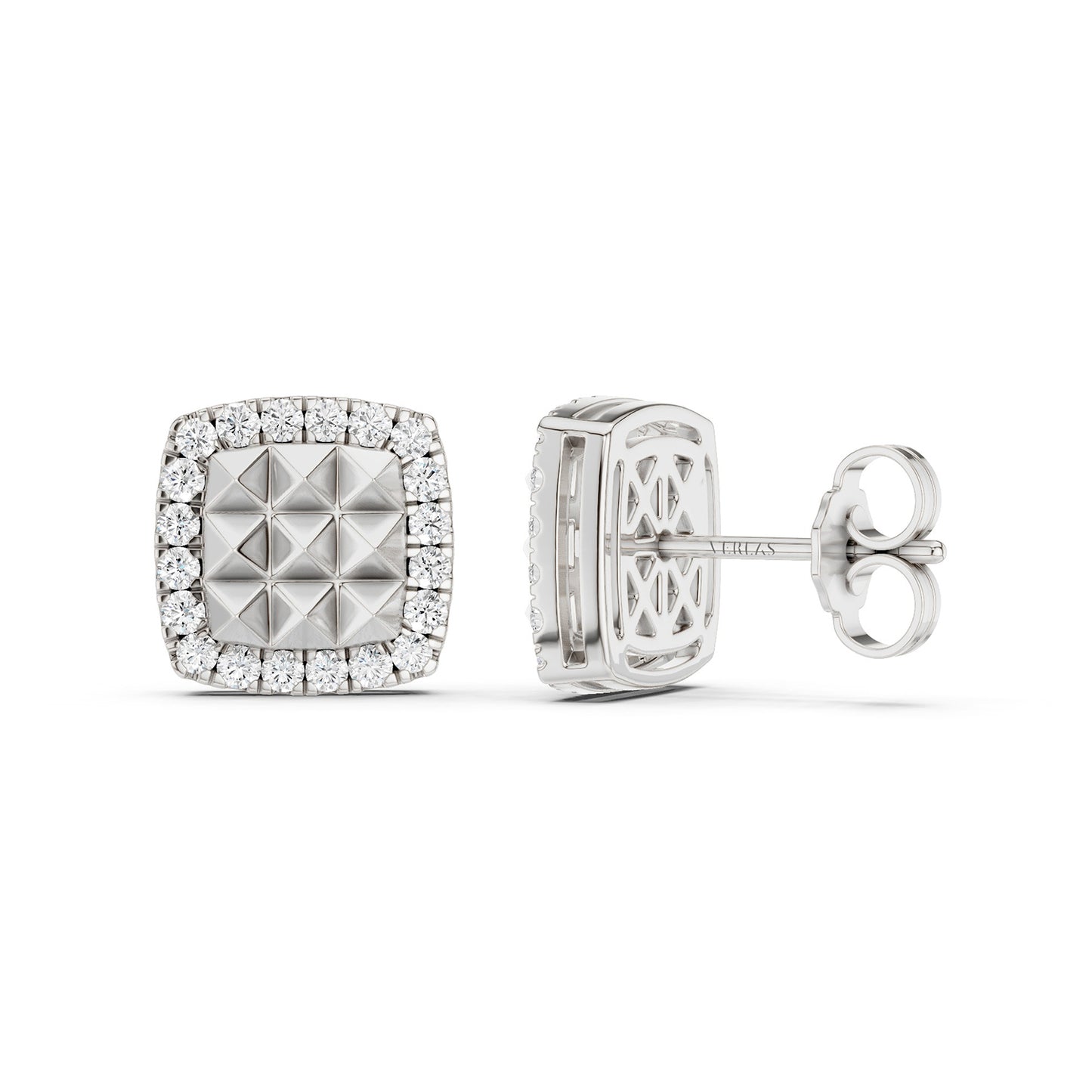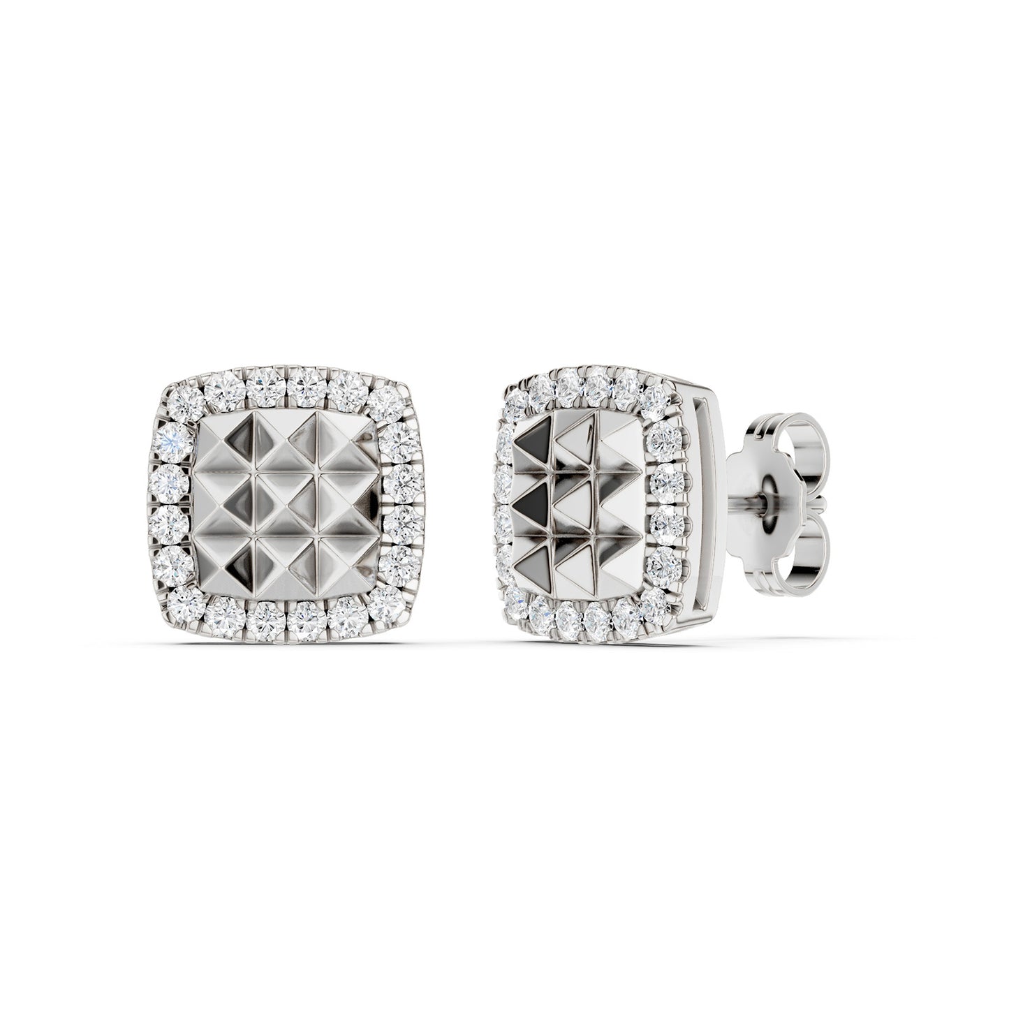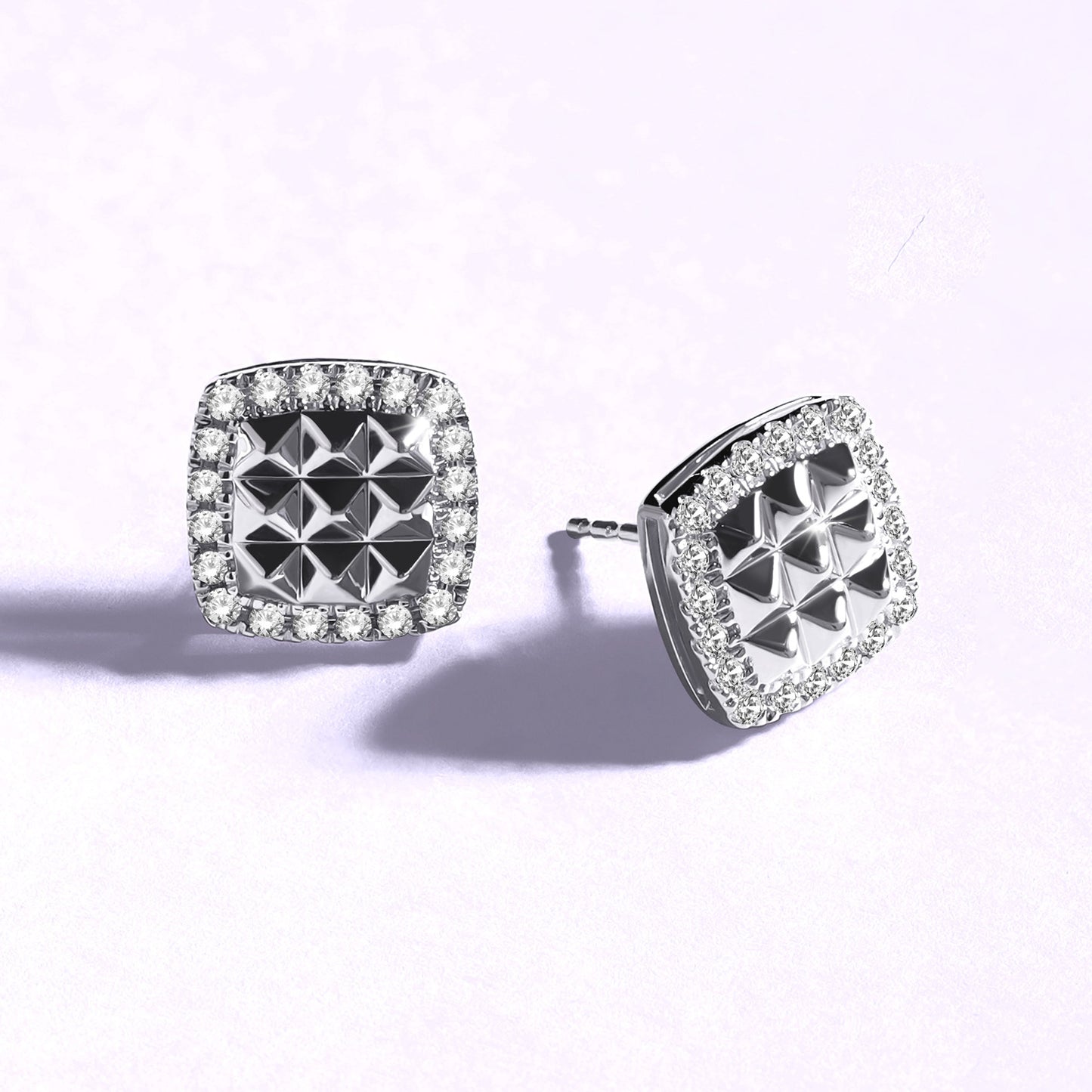 These Pyramid Radiant Diamond Studs showcase a captivating arrangement of pyramid motifs at the center, creating a unique geometric pattern that is both bold and eye-catching. The pyramids are meticulously arranged in a grid-like formation, giving the studs a textured, three-dimensional look that stands out beautifully against the ear. Framing the central design is a delicate border of round diamonds, adding a touch of sparkle and contrast that elevates the overall aesthetic. Whether you're dressing up for a special occasion or looking to enhance your everyday style, these diamond studs are the ideal accessory to express your individuality and sophistication.