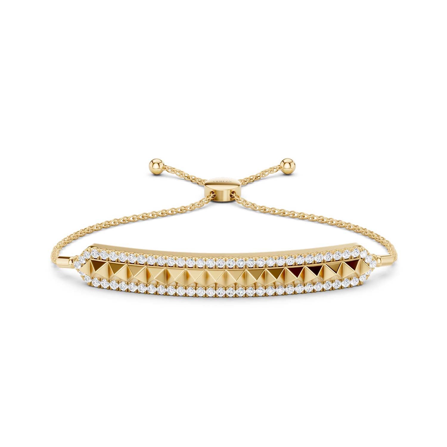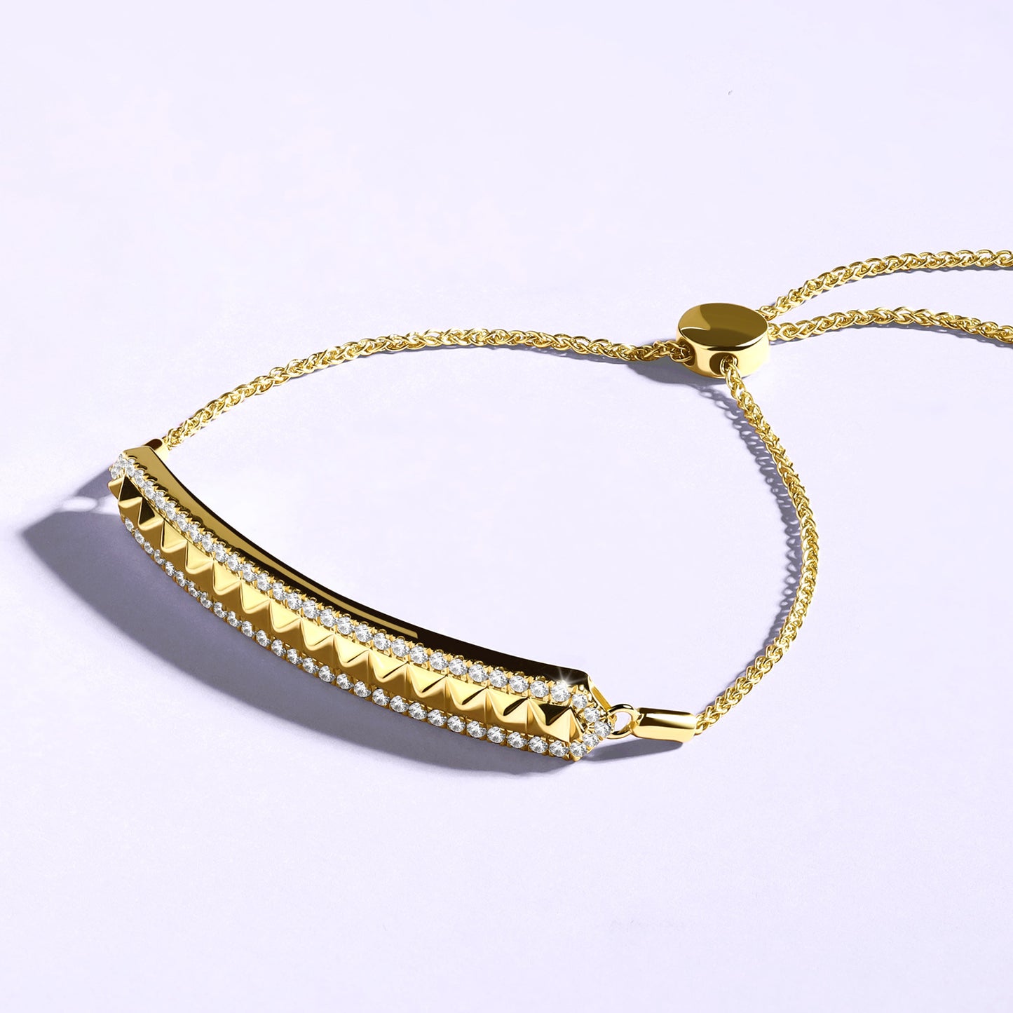 Discover your inner trendsetter with the Pyramid Spiked Diamond Bolo Bracelet, a stunning blend of architectural brilliance and modern sophistication. This striking cuff features a central bar, adorned with intricately arranged pyramid-like studs, introducing a playful texture that elevates its contemporary aesthetic. On either side of the central pyramids, two radiant rows of ethically sourced lab-grown diamonds add a touch of opulence, ensuring that this piece shines with every movement. This diamond bolo bracelet is a powerful statement of style and confidence, perfect for those who dare to stand out.