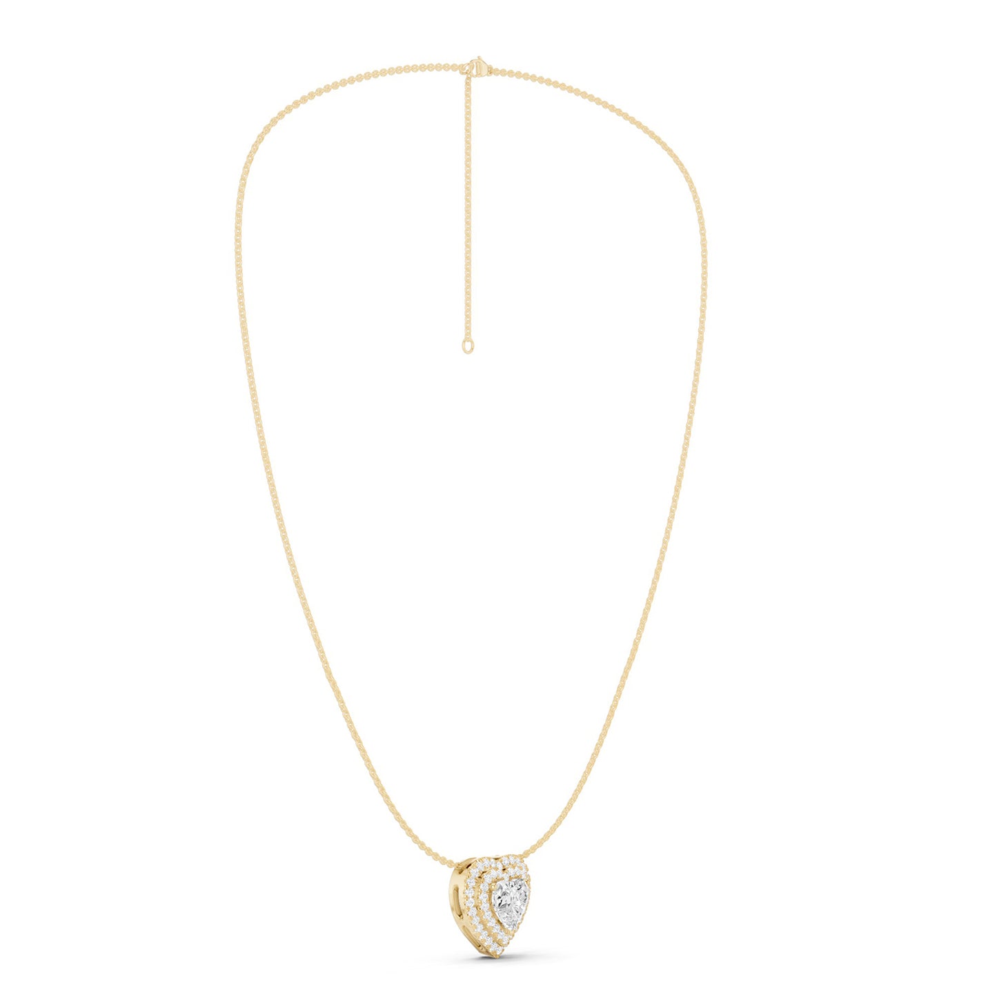 Embrace the essence of love with the Quaint Double Halo Heart Pendant. At its center, a stunning heart-shaped lab-grown diamond shines brightly, set in a classic prong setting for a secure and brilliant sparkle. The pendant is surrounded by two halos of dazzling diamond accents, adding depth and radiance to the already captivating heart. Crafted with precision and care, this piece is available in your choice of 14k white, yellow, or rose gold, making it a versatile and timeless addition to any jewelry collection. Whether celebrating a milestone moment or simply adding a touch of elegance to everyday wear, this diamond pendant is a beautiful expression of love and commitment.