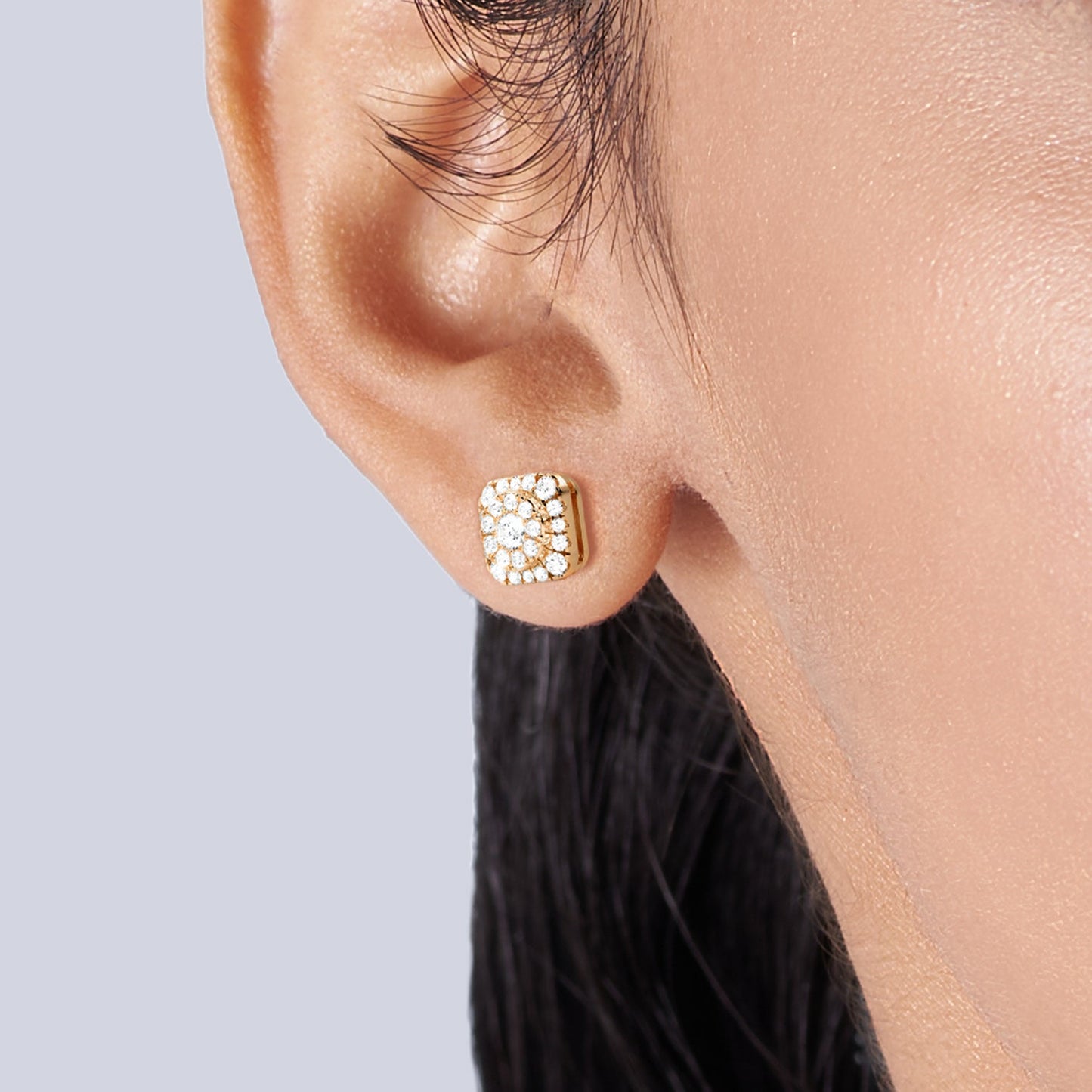 This Round-Cushion Halo Studs is a remarkable fusion of timeless sophistication and contemporary design. It showcases a brilliant round diamond cradled within a cushion-shaped halo of dazzling diamonds. The classic yet contemporary design of these diamond stud earrings ensures versatility, making them the perfect addition to any ensemble. Whether it's a celebration of love, a milestone occasion, or simply a thoughtful gesture, it makes for a meaningful and elegant gift.