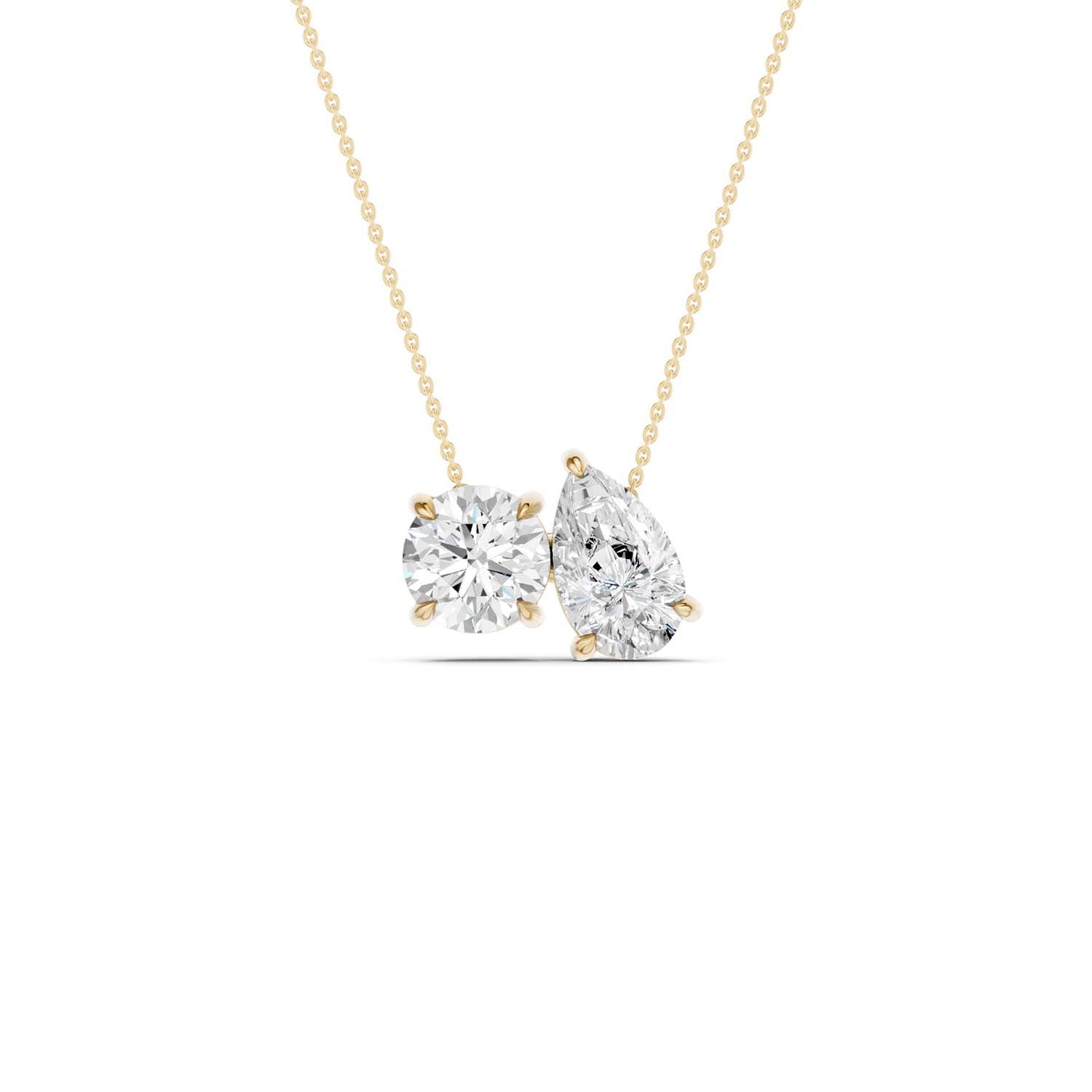 Two stunning diamonds - round-cut and pear-cut, are the soul of this Toi et Moi necklace. This dazzling duo clings in a setting that highlights their beauty and symbolizes the unity of two souls. This two-stone necklace is a perfeCt. expression of love for engagements, anniversaries, or any momentous celebration.
