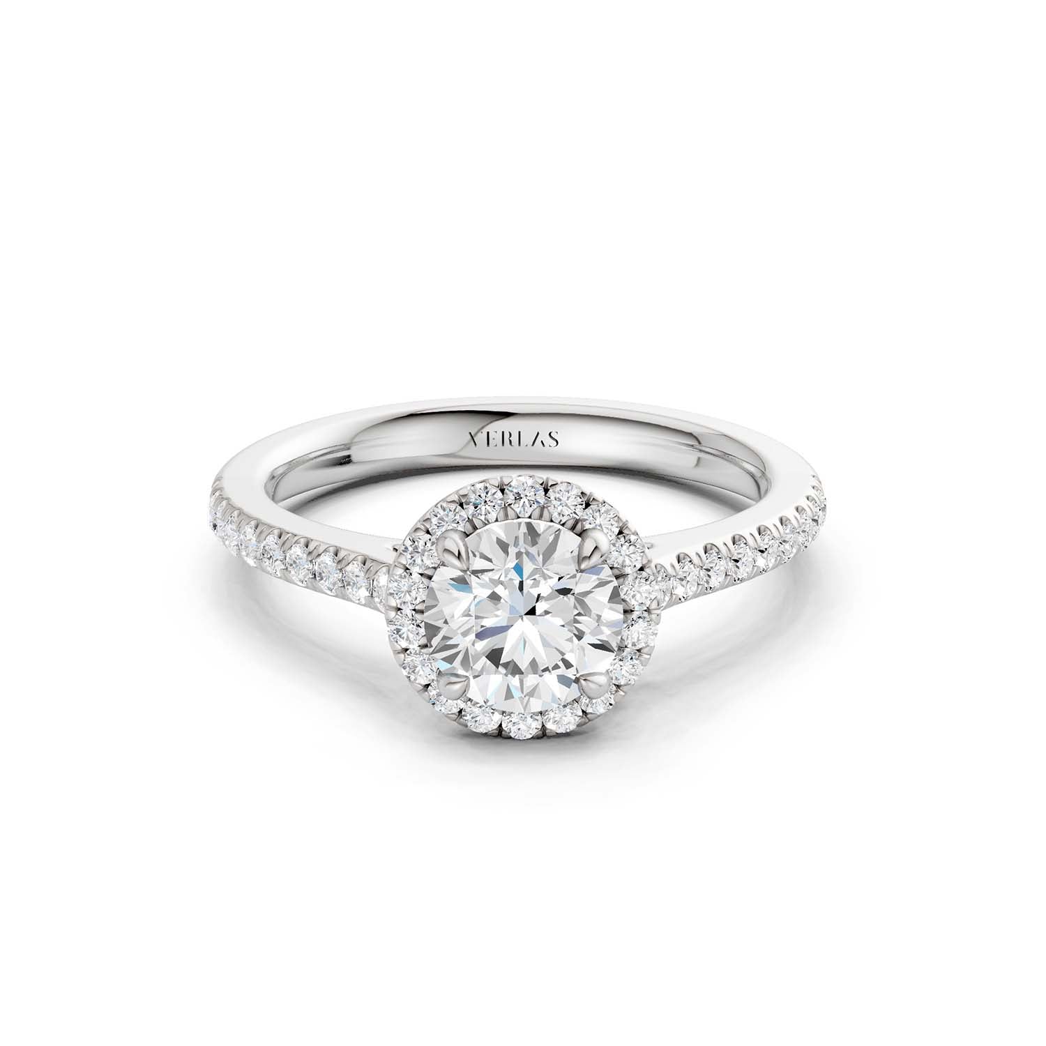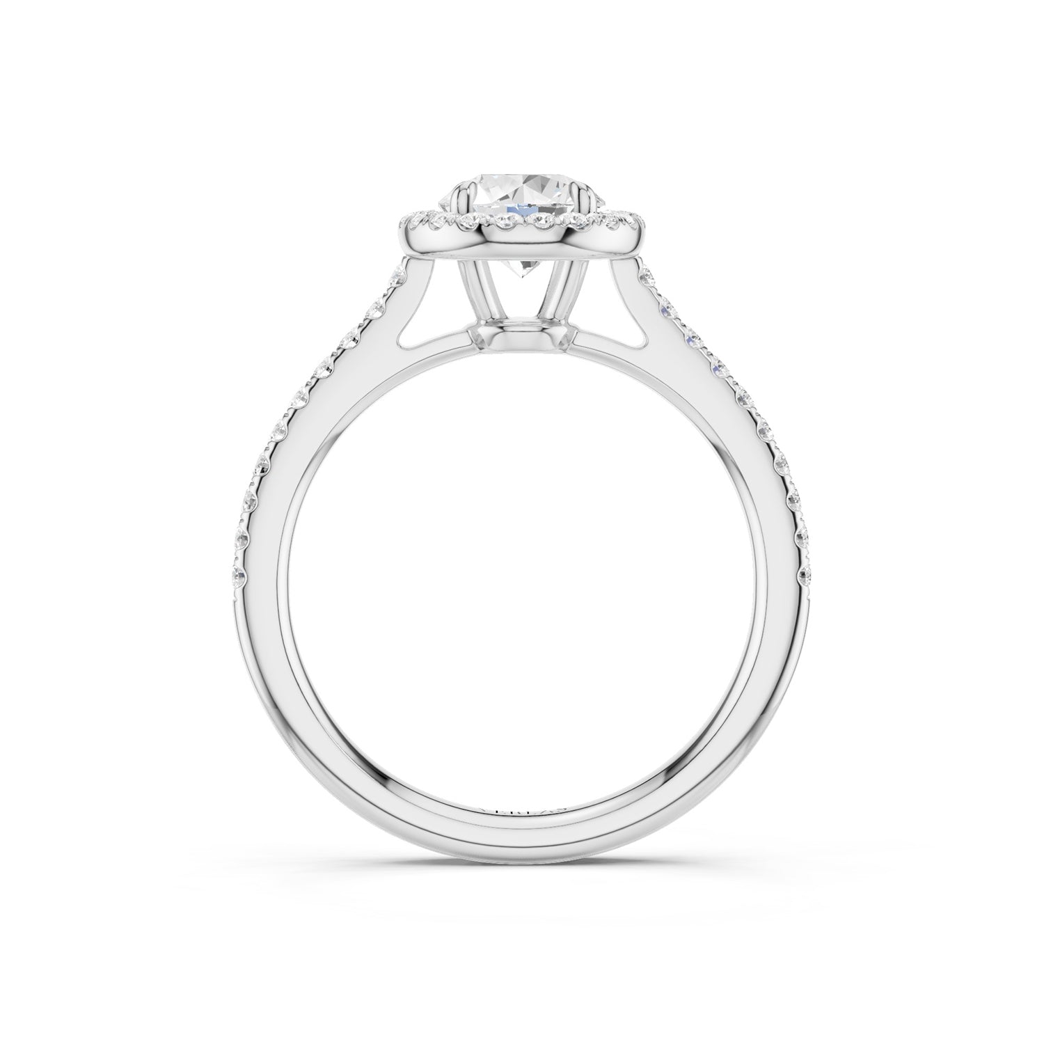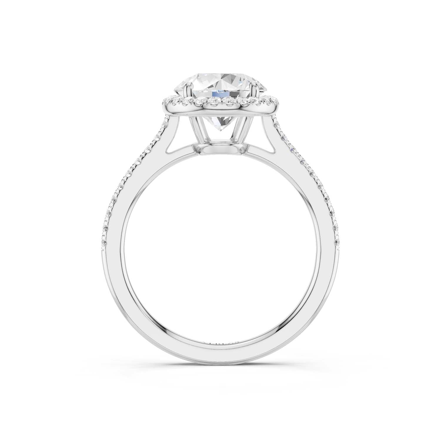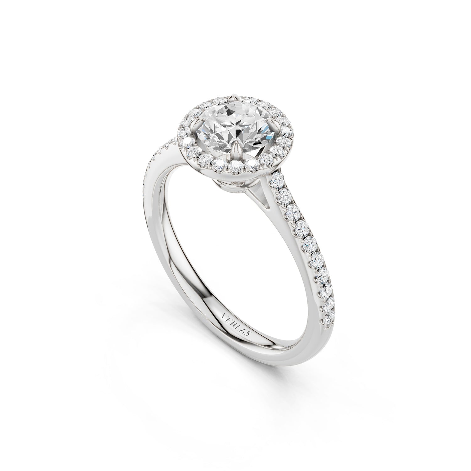 Featuring a single row of diamond pavé on the band creates a lift to focus on the round brilliant cut center diamond accentuating maximum brilliance. This round-shaped lab-grown diamond halo ring is striking, and the diamond row gives it a regal look and feel.