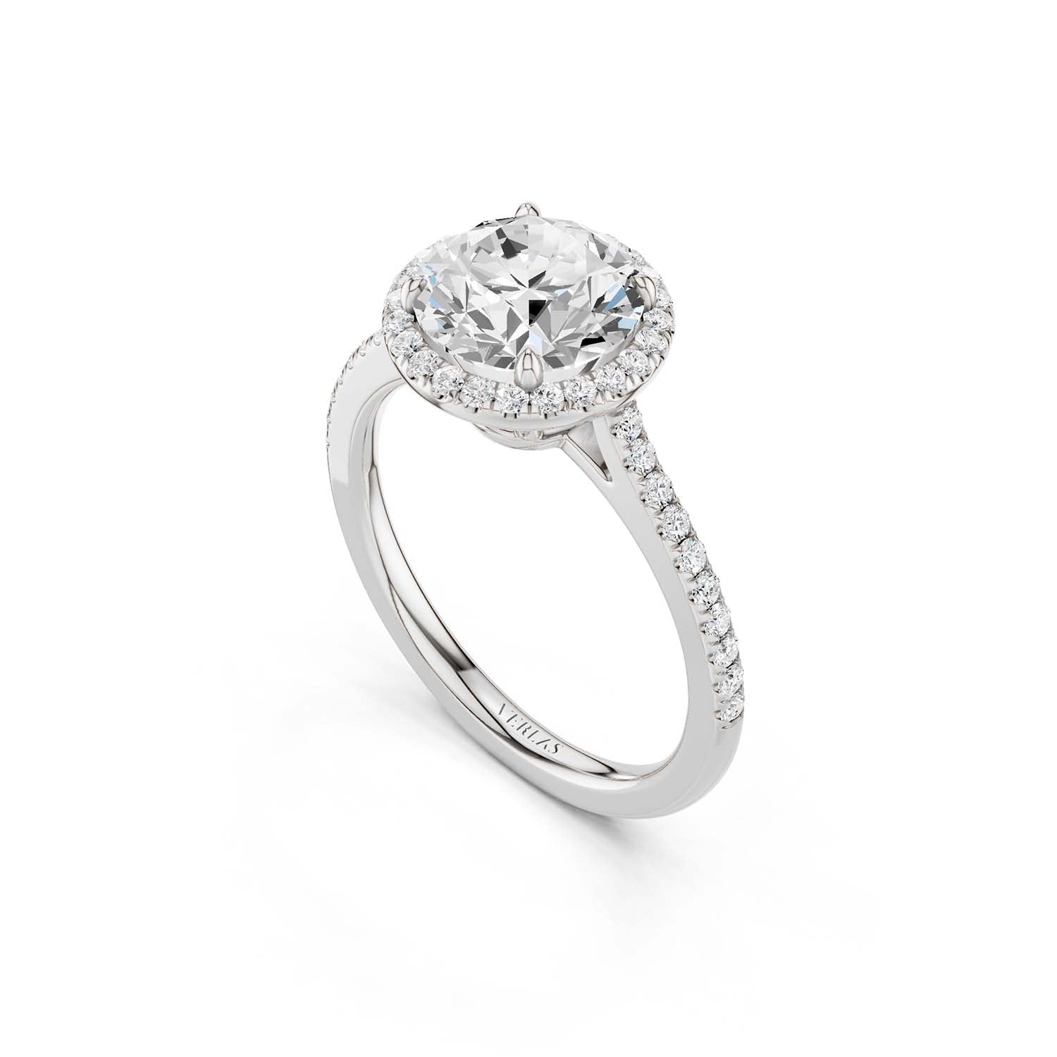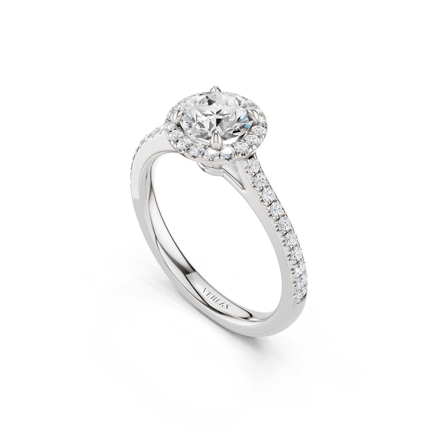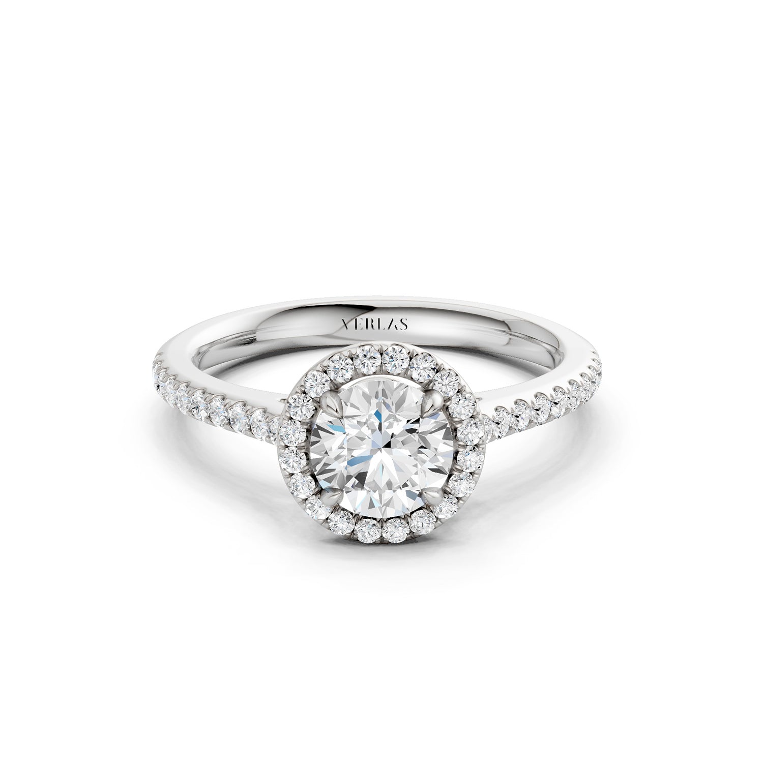 Featuring a single row of diamond pavé on the band creates a lift to focus on the round brilliant cut center diamond accentuating maximum brilliance. This round-shaped lab-grown diamond halo ring is striking, and the diamond row gives it a regal look and feel.