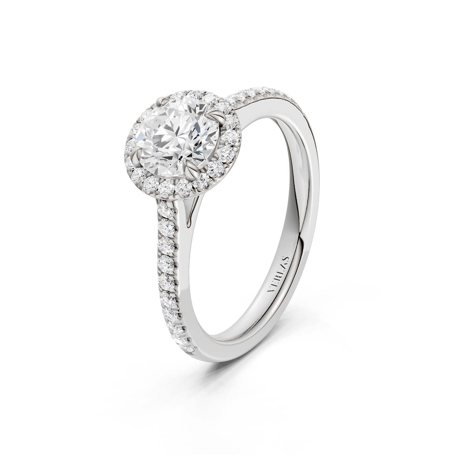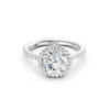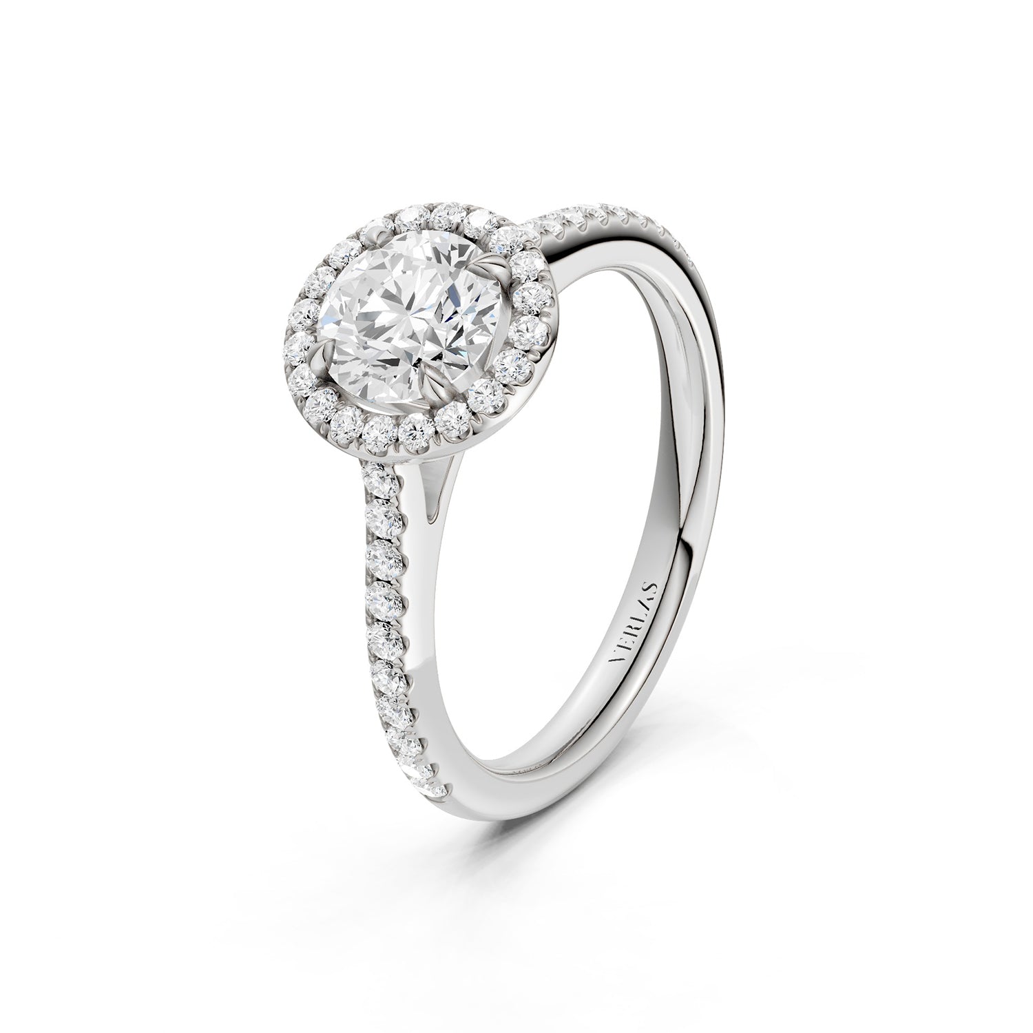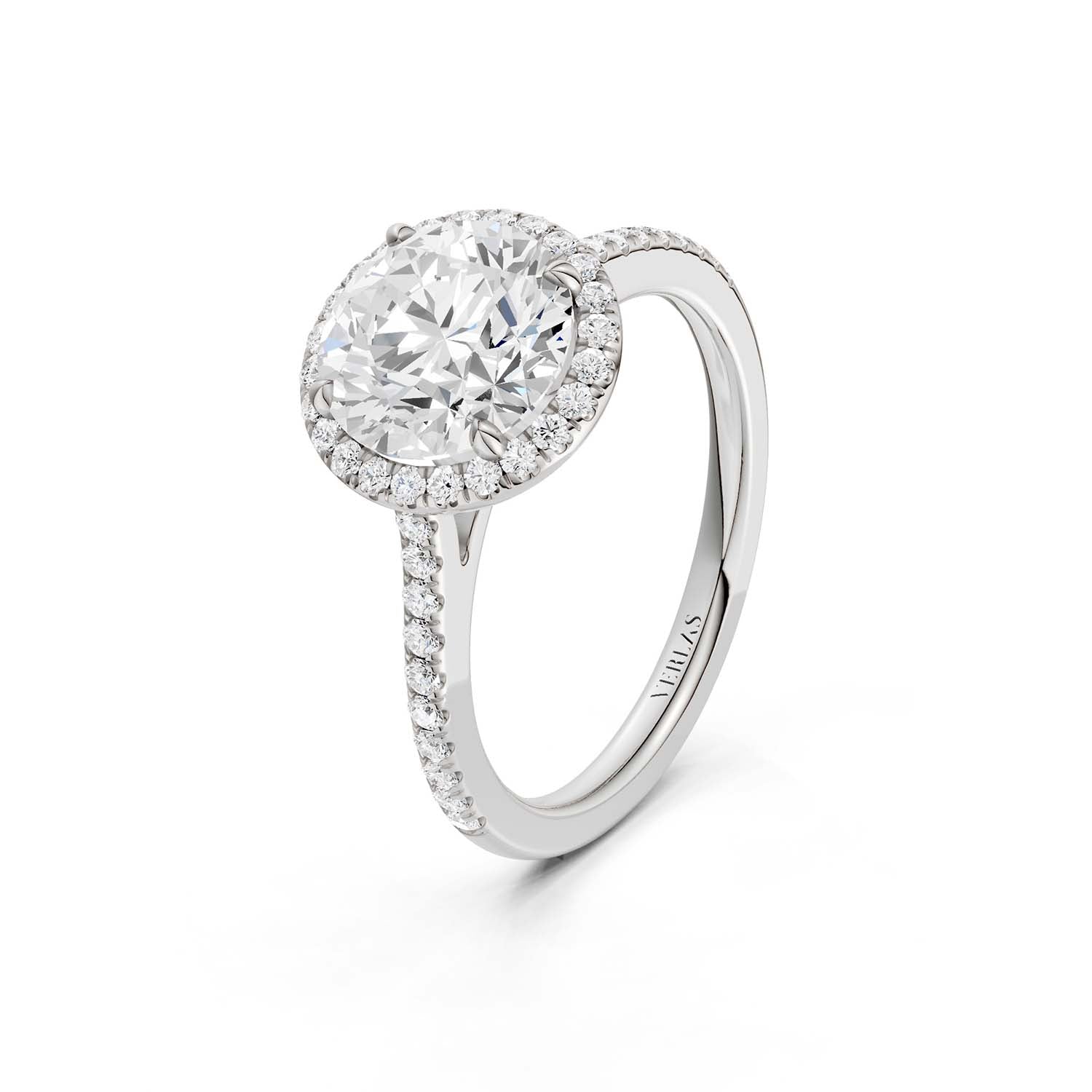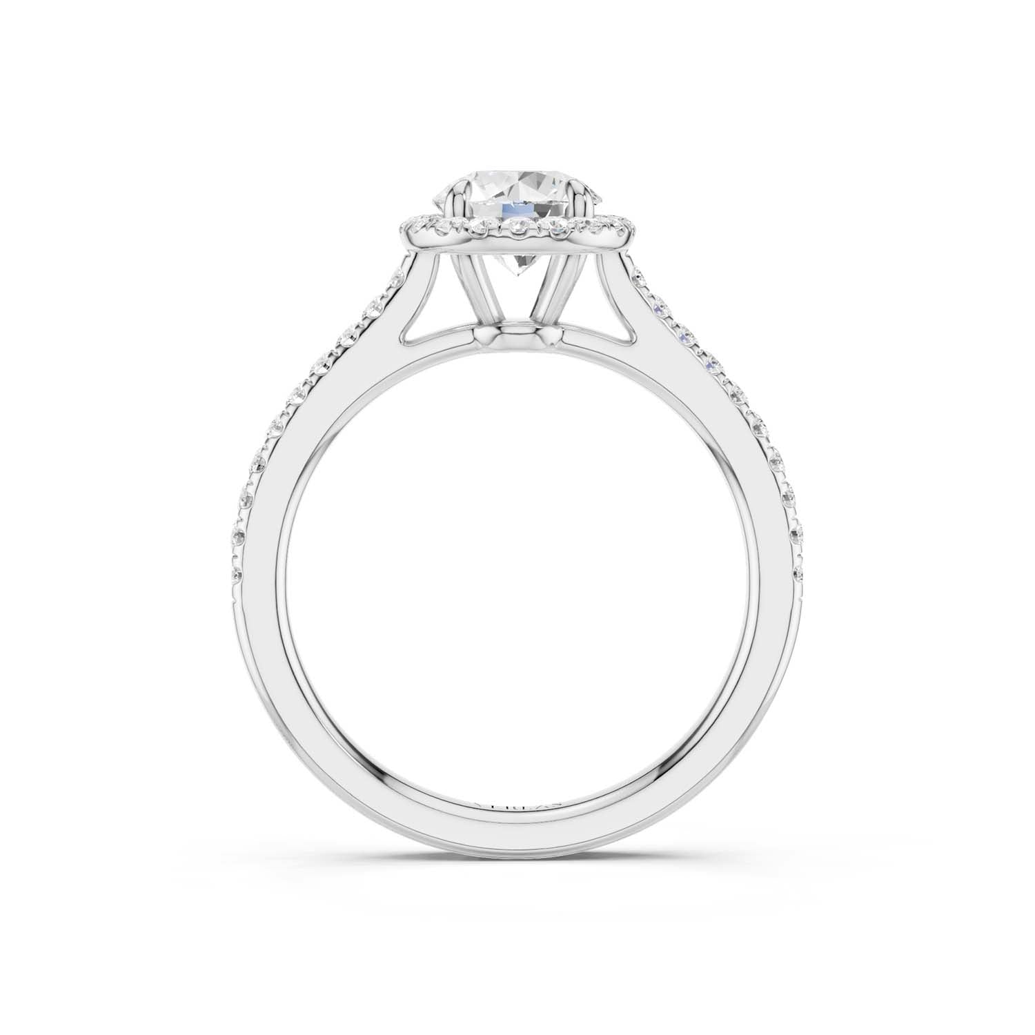 Featuring a single row of diamond pavé on the band creates a lift to focus on the round brilliant cut center diamond accentuating maximum brilliance. This round-shaped lab-grown diamond halo ring is striking, and the diamond row gives it a regal look and feel.