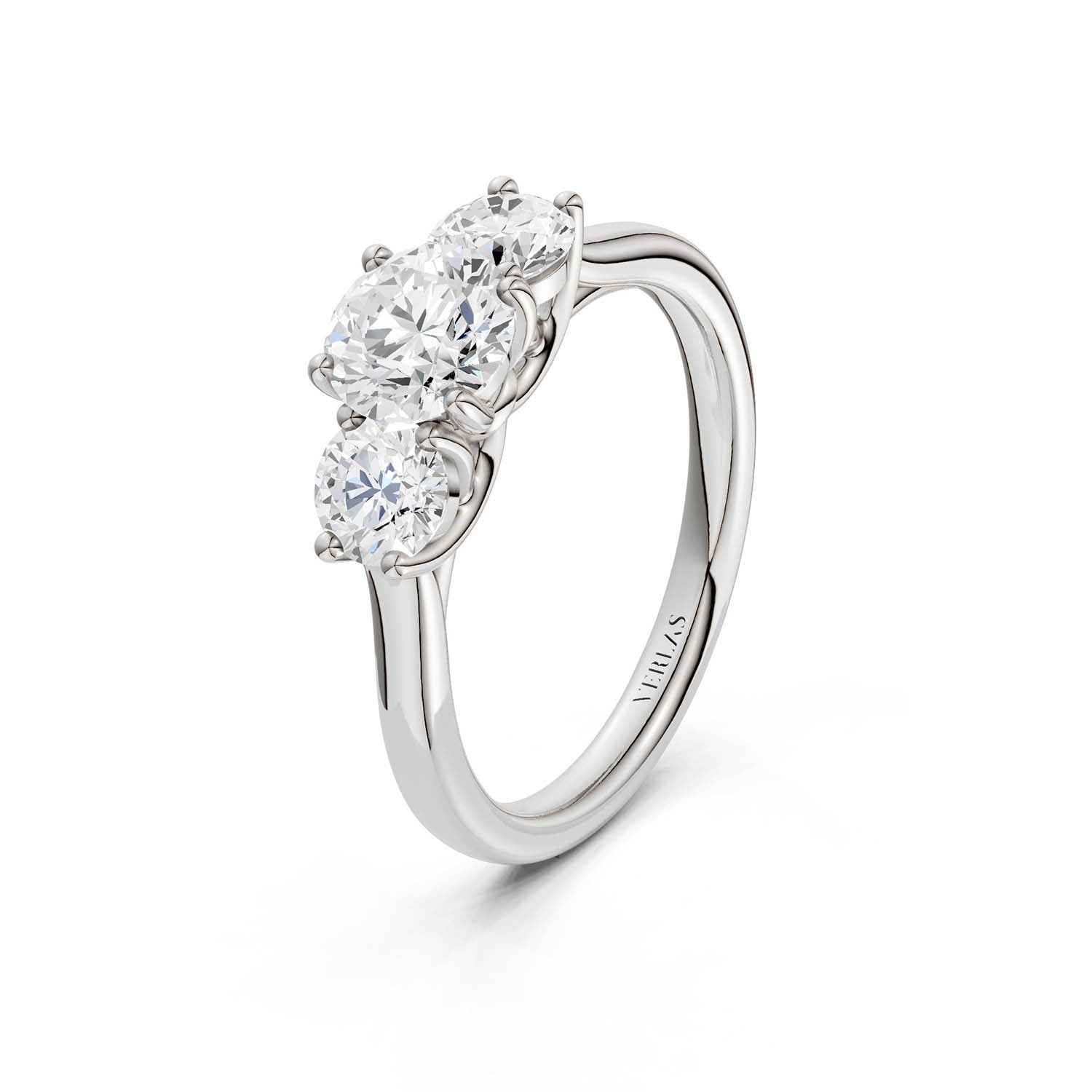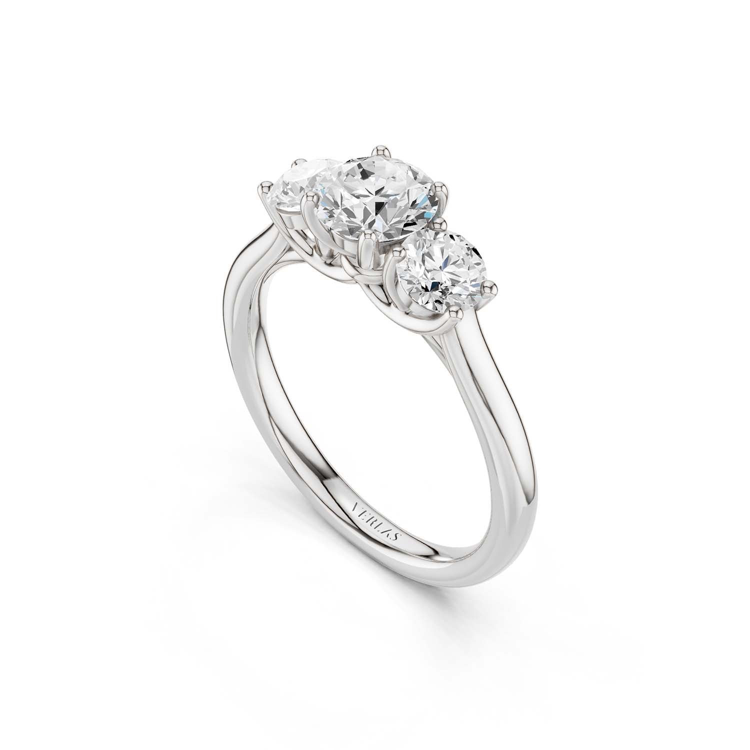 Round Vows is an exquisite three-stone ring featuring three eye-catching prong set diamonds. This timeless design ensures the diamonds will shine and create a lasting impression. Each diamond is carefully held in place in the three prongs, securing its place and brilliance for years to come, making it one of the most sought-after diamond engagement rings.