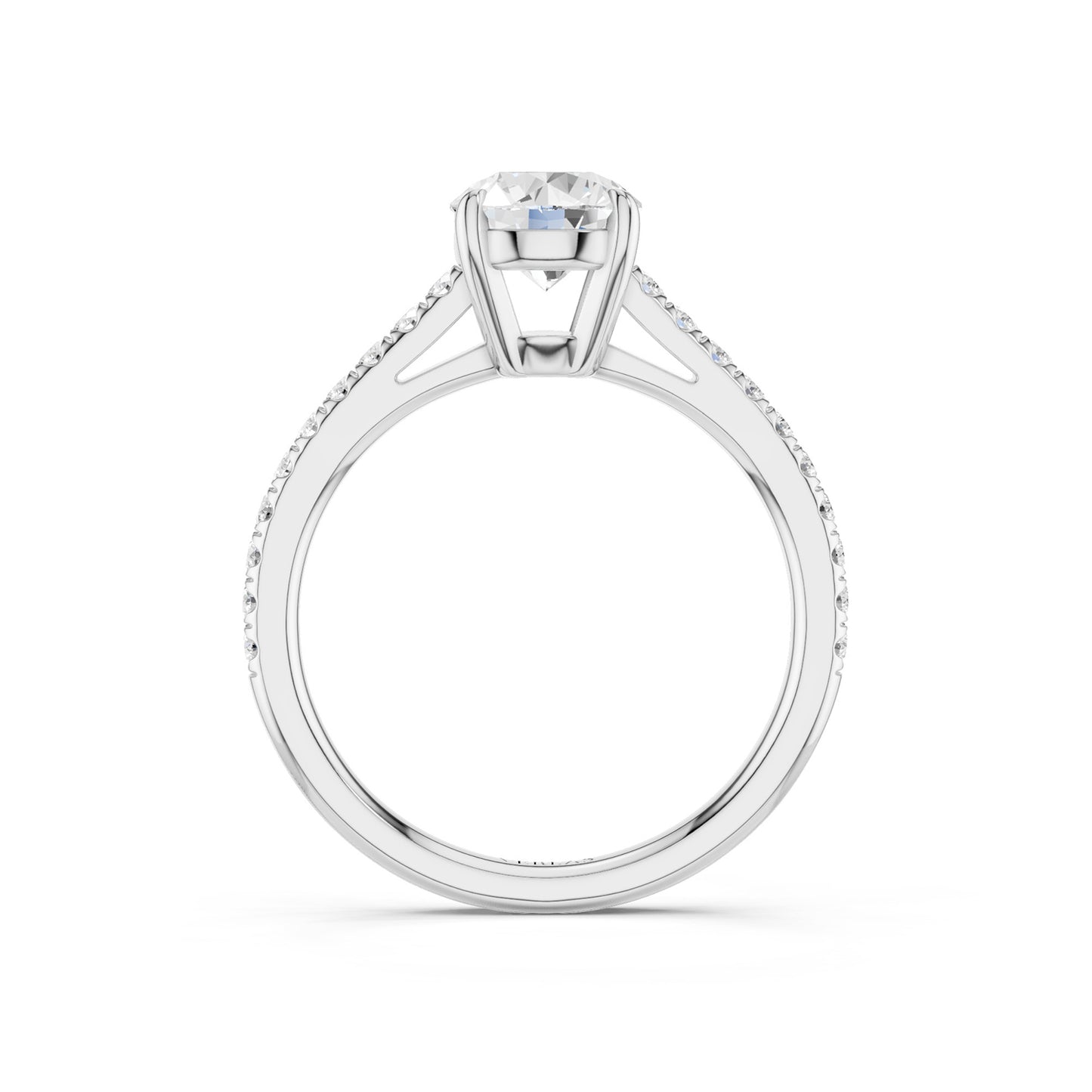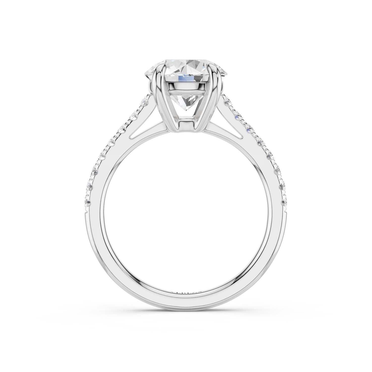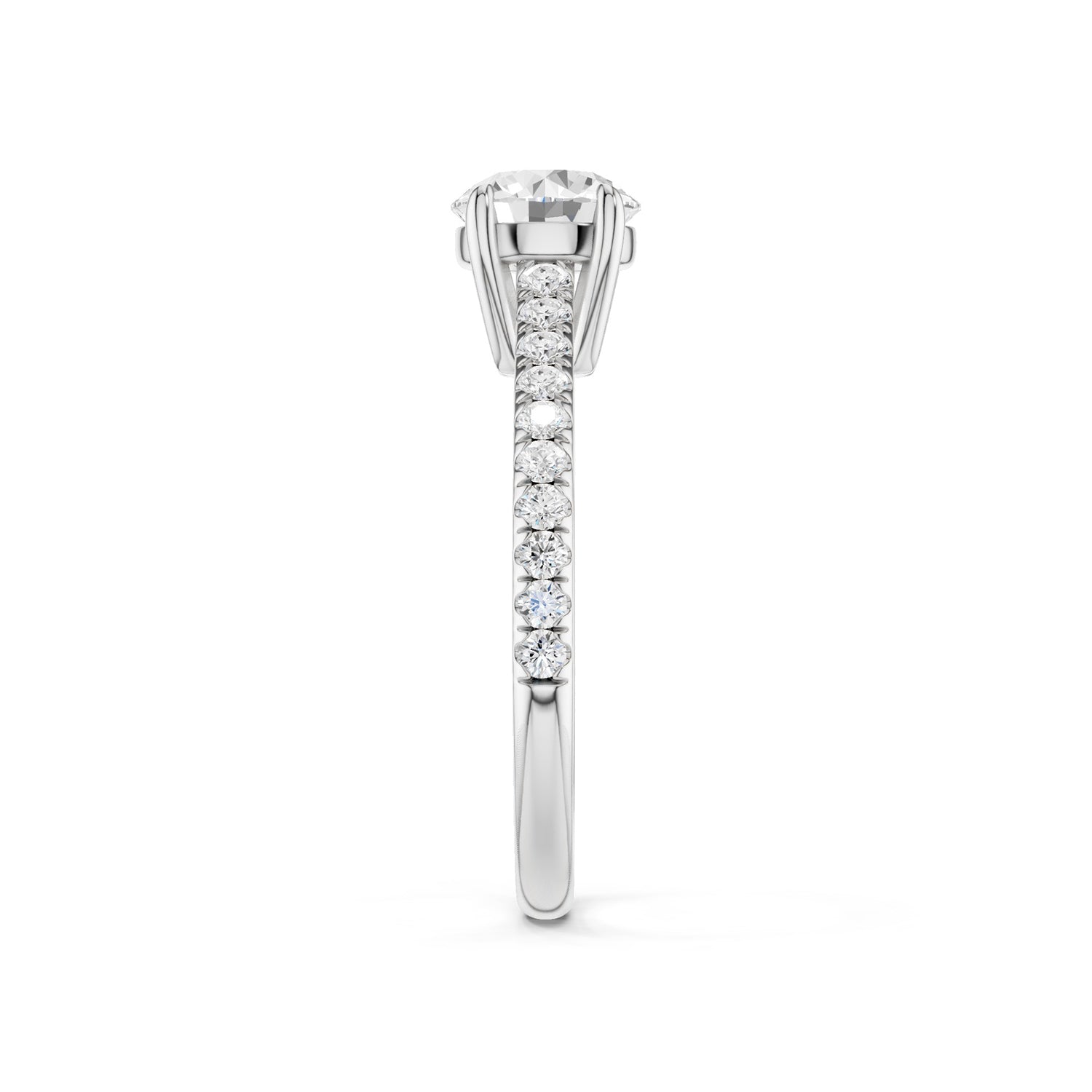 A scintillating halo of brilliant diamonds and a striking round center stone result in an unrivaled display of brilliance. The lab-grown engagement ring consists of a petite band with diamonds extending halfway down the shank.