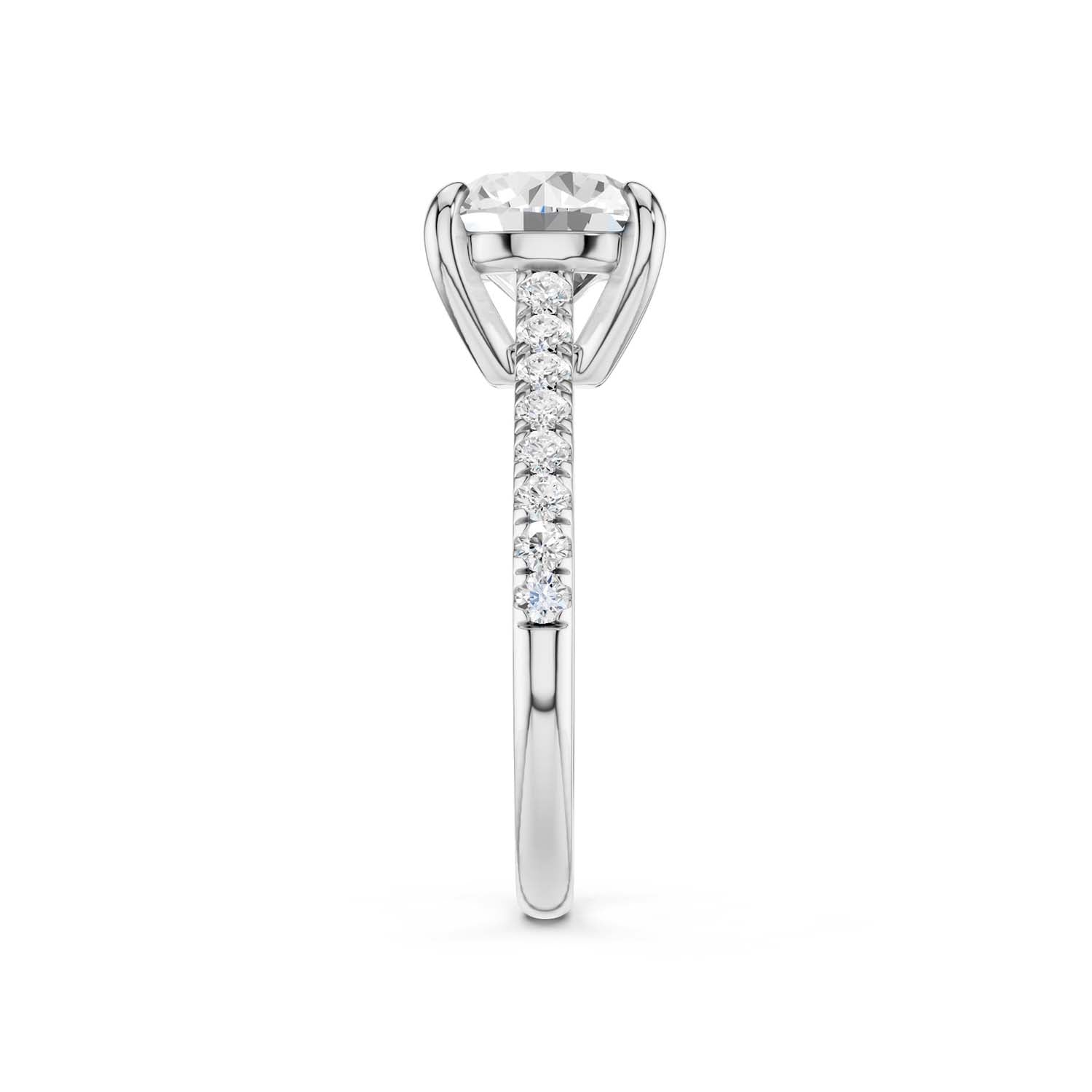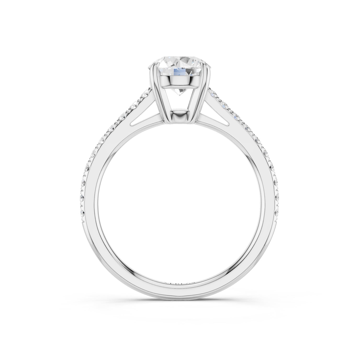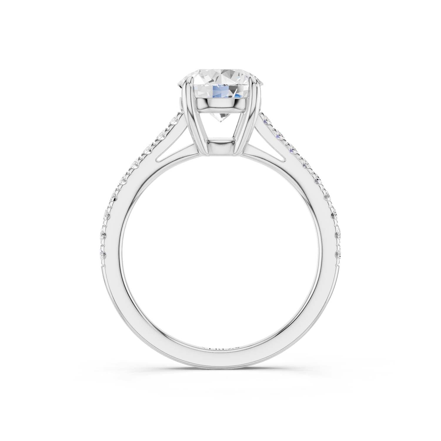 A scintillating halo of brilliant diamonds and a striking round center stone result in an unrivaled display of brilliance. The lab-grown engagement ring consists of a petite band with diamonds extending halfway down the shank.