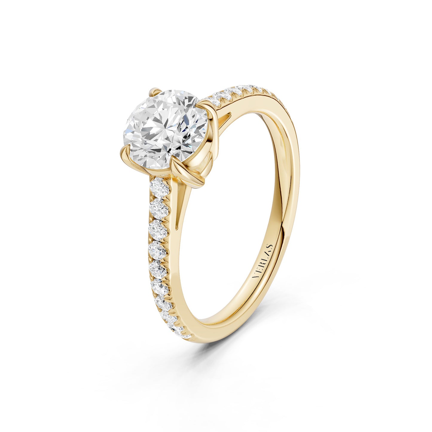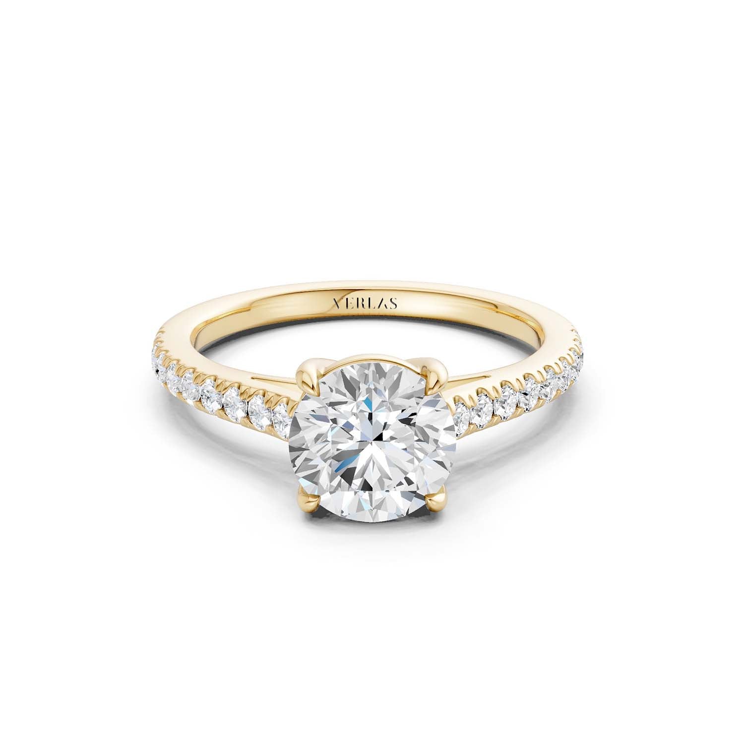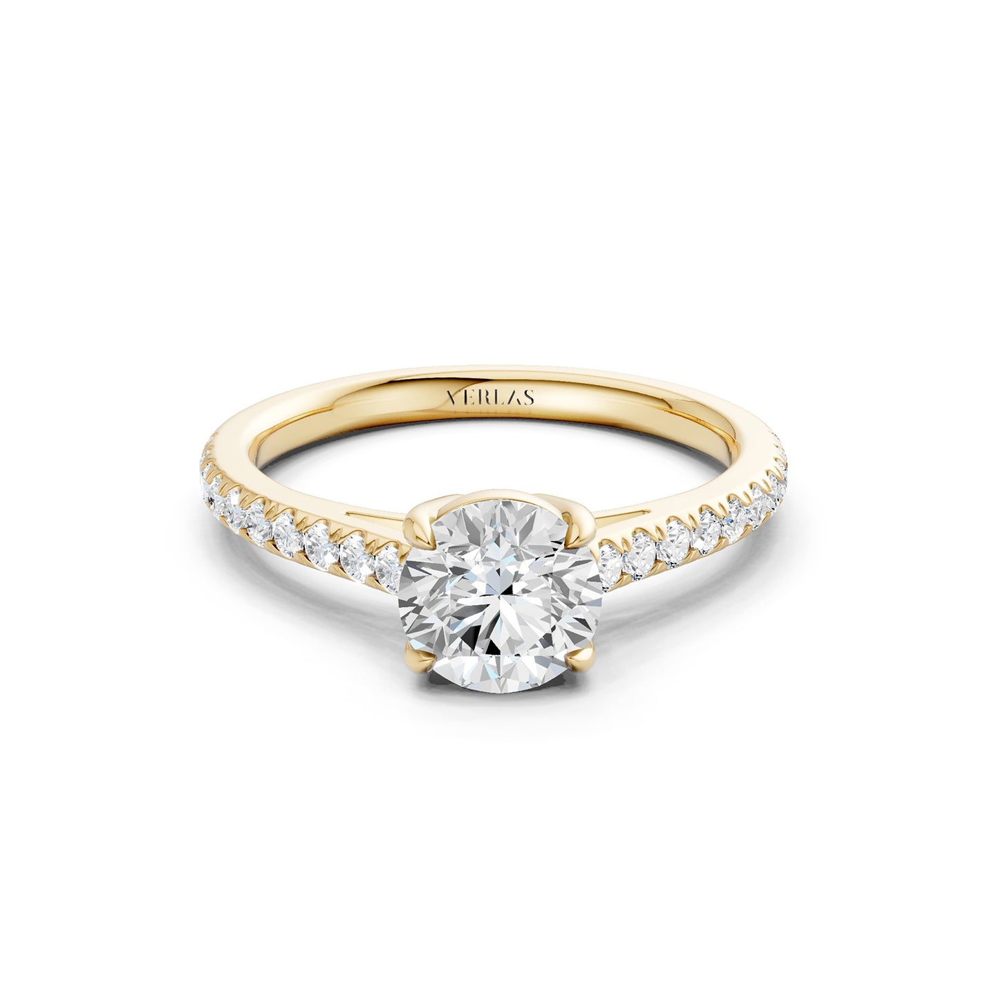 Read MoreA scintillating halo of brilliant diamonds and a striking round center stone result in an unrivaled display of brilliance. The lab-grown engagement ring consists of a petite band with diamonds extending halfway down the shank.