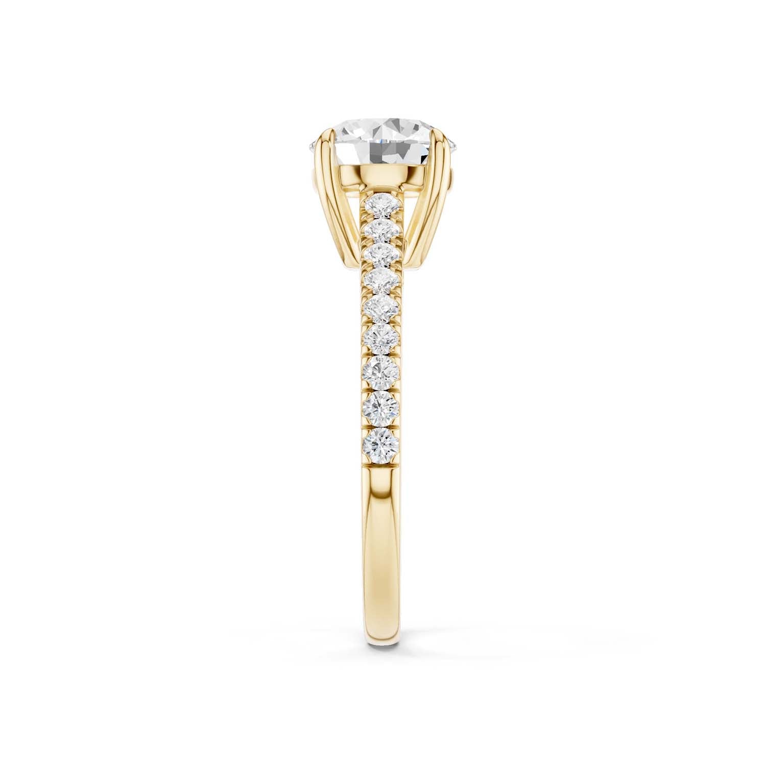 A scintillating halo of brilliant diamonds and a striking round center stone result in an unrivaled display of brilliance. The lab-grown engagement ring consists of a petite band with diamonds extending halfway down the shank.