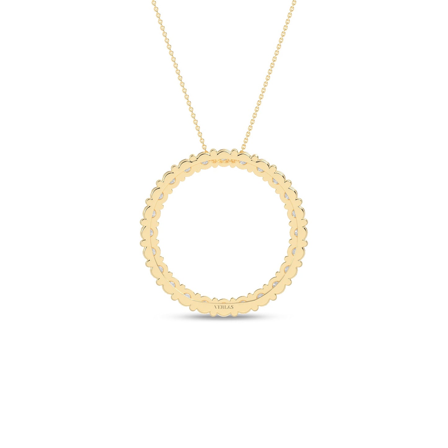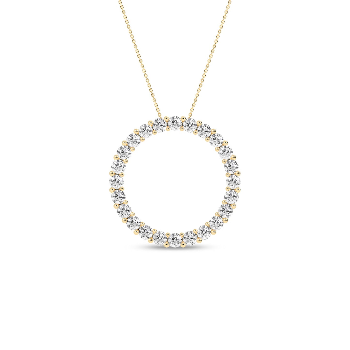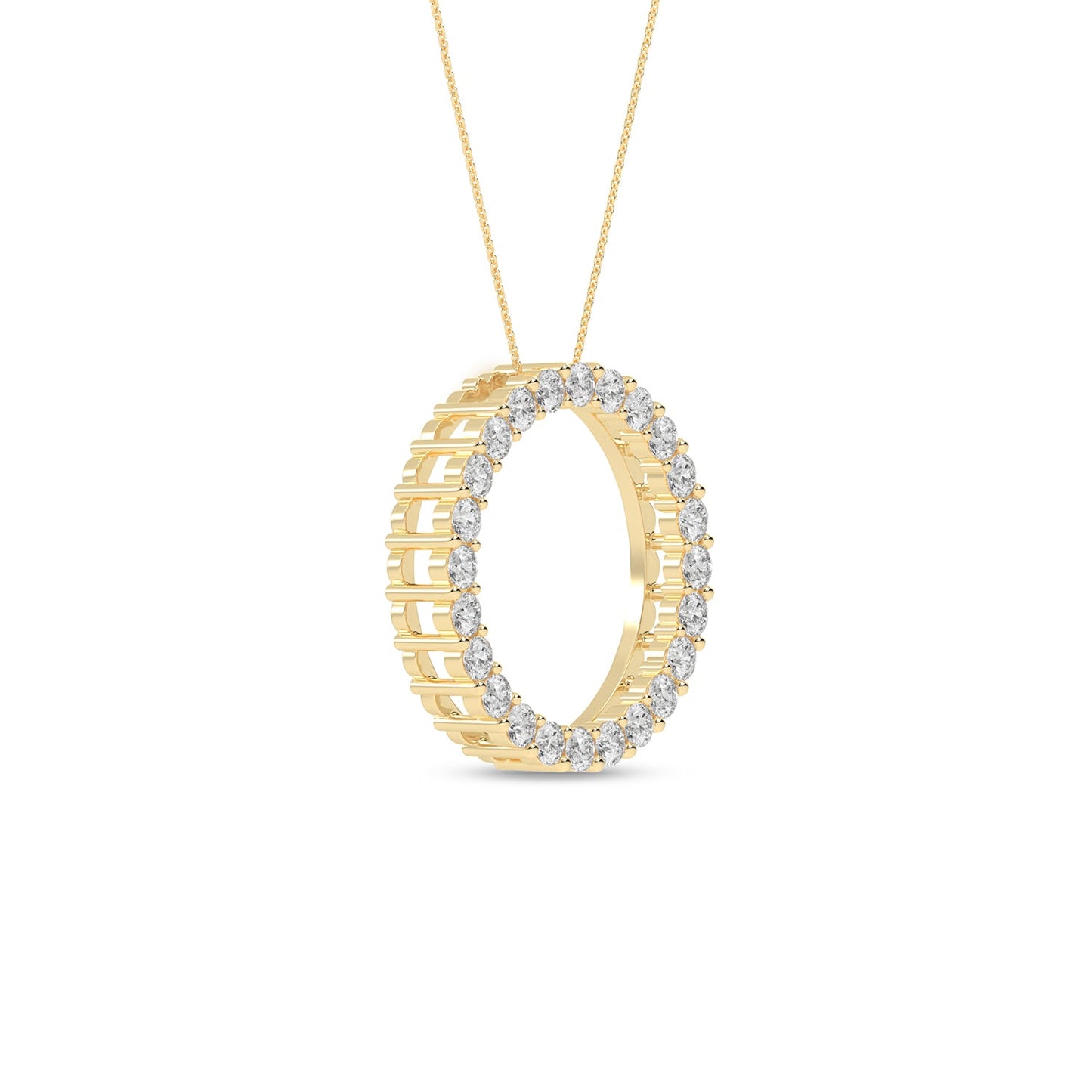 This circular silhouette Pendant with the best lab-made diamonds adds glamour to your every look. A classic shared prong setting forming a splendid silhouette gives an unmatched grandeur to the piece, making lab-grown pendants an excellent gifting option.