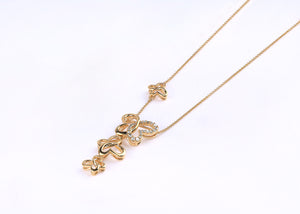 The Triple Butterfly Drop Necklace holds three delicate butterfly silhouettes, each rendered in gleaming gold. From the graceful curves of their wings to the intricate links that connect them, each one is meticulously detailed. Whether you're attending a glamorous gala or simply adding a touch of elegance to your everyday attire, this diamond pendant necklace is the epitome of versatile luxury.