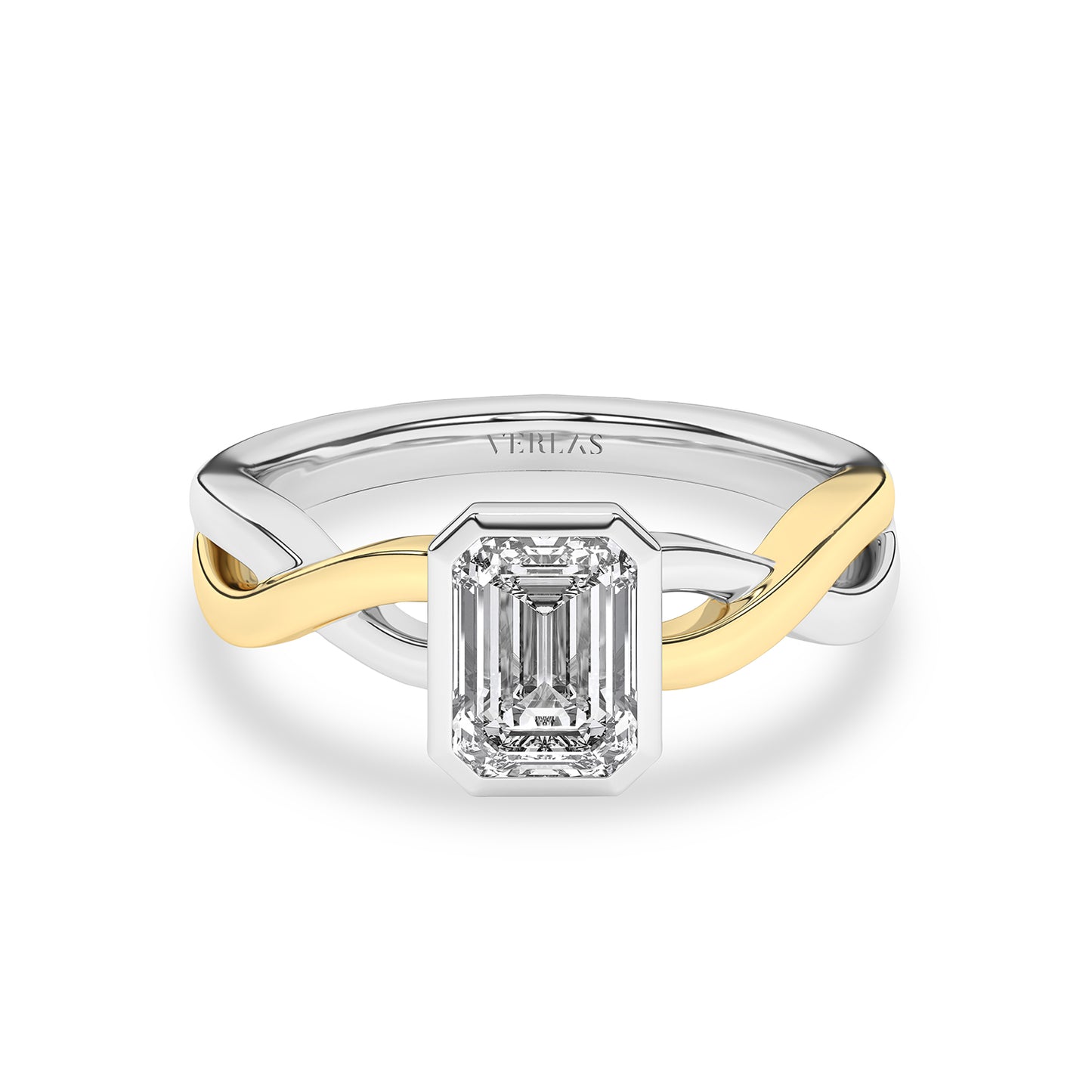 Experience elegance redefined with our Twisted Bezel Emerald Diamond Ring. This exquisite piece features a stunning bezel-set, emerald-shaped solitaire diamond that captures the light with unparalleled brilliance. Crafted with precision, the ring boasts a unique design highlighted by a twisted band intricately woven from intertwining strands of either lustrous white and yellow gold or charming white and rose gold. Perfect as an engagement ring or a luxurious gift, this solitaire diamond ring symbolizes timeless beauty and modern craftsmanship. Also available in the all-white gold setting.
