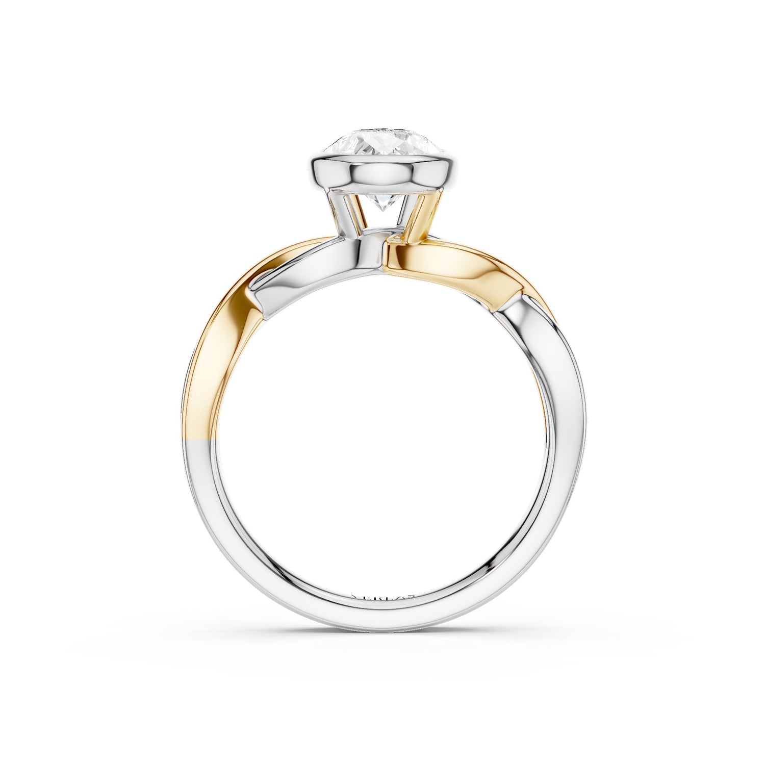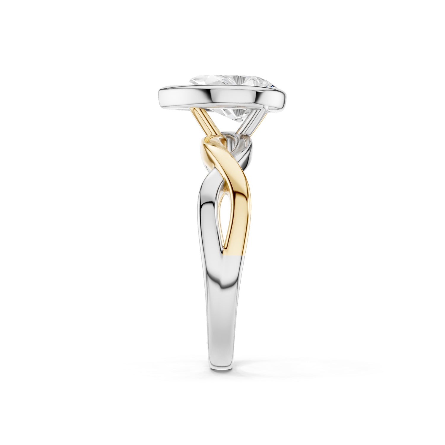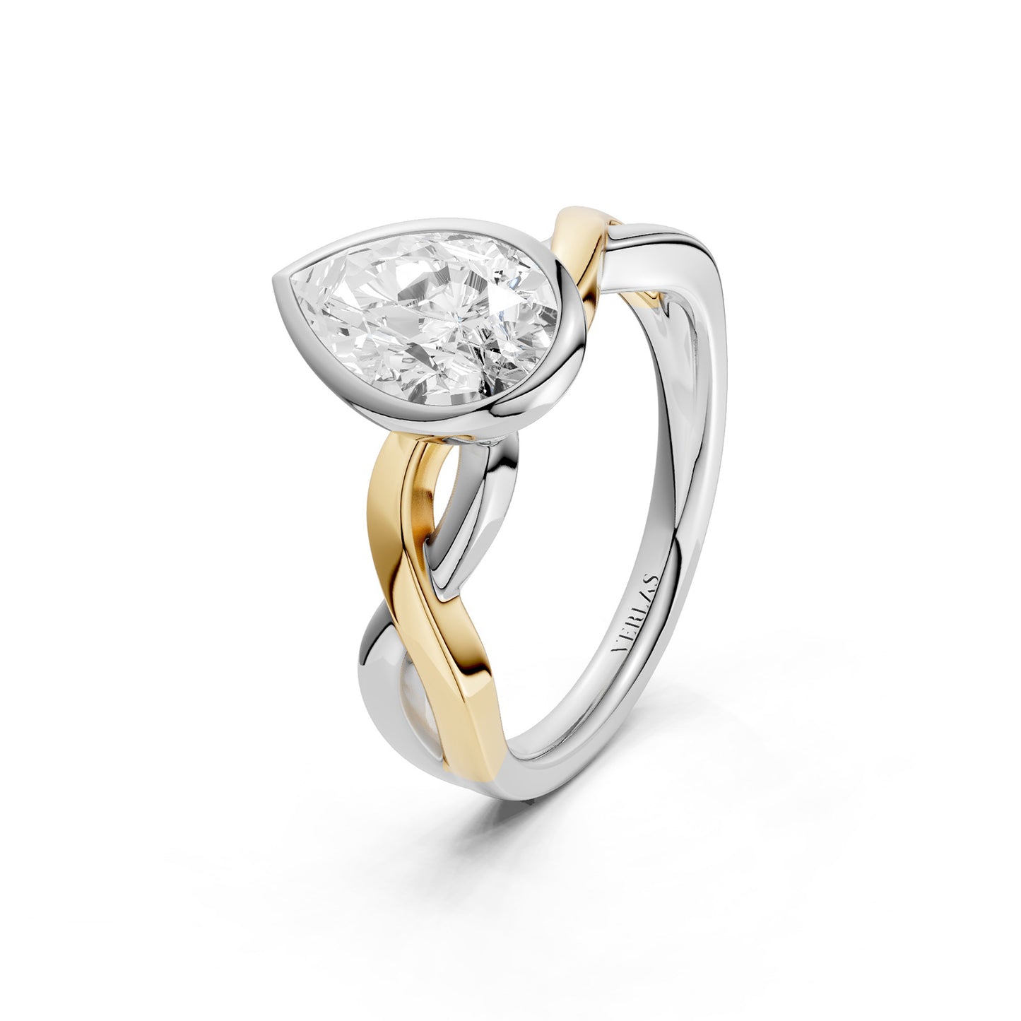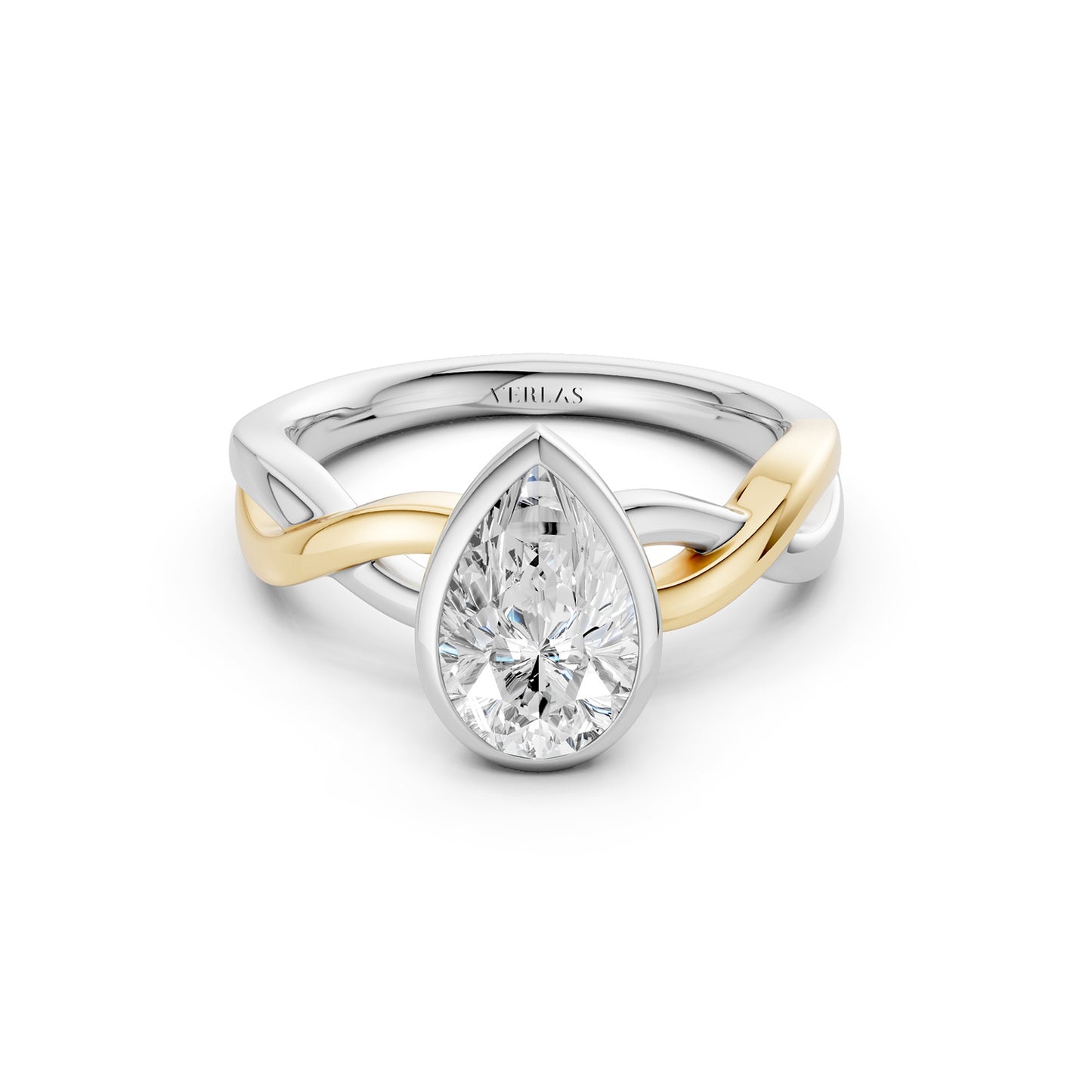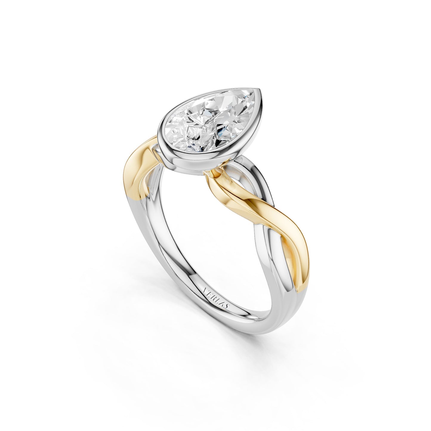 Discover a unique blend of modern sophistication and timeless elegance with our Twisted Bezel Pear Diamond Ring. At its heart lies a stunning pear-shaped lab-grown diamond, securely bezel-set to showcase its brilliant facets. The solitaire diamond ring's unique design showcases a twisted band, expertly crafted from intertwining strands of either lustrous white, white and yellow gold or white and rose gold. This sophisticated combination symbolizes unity and modern luxury, making it a versatile accessory for any occasion.