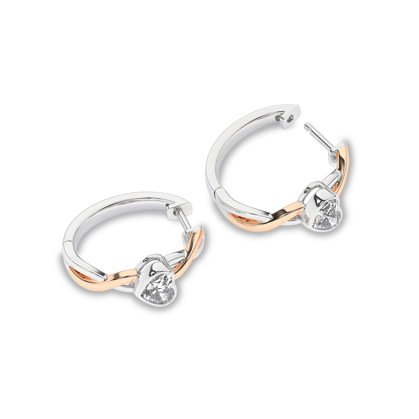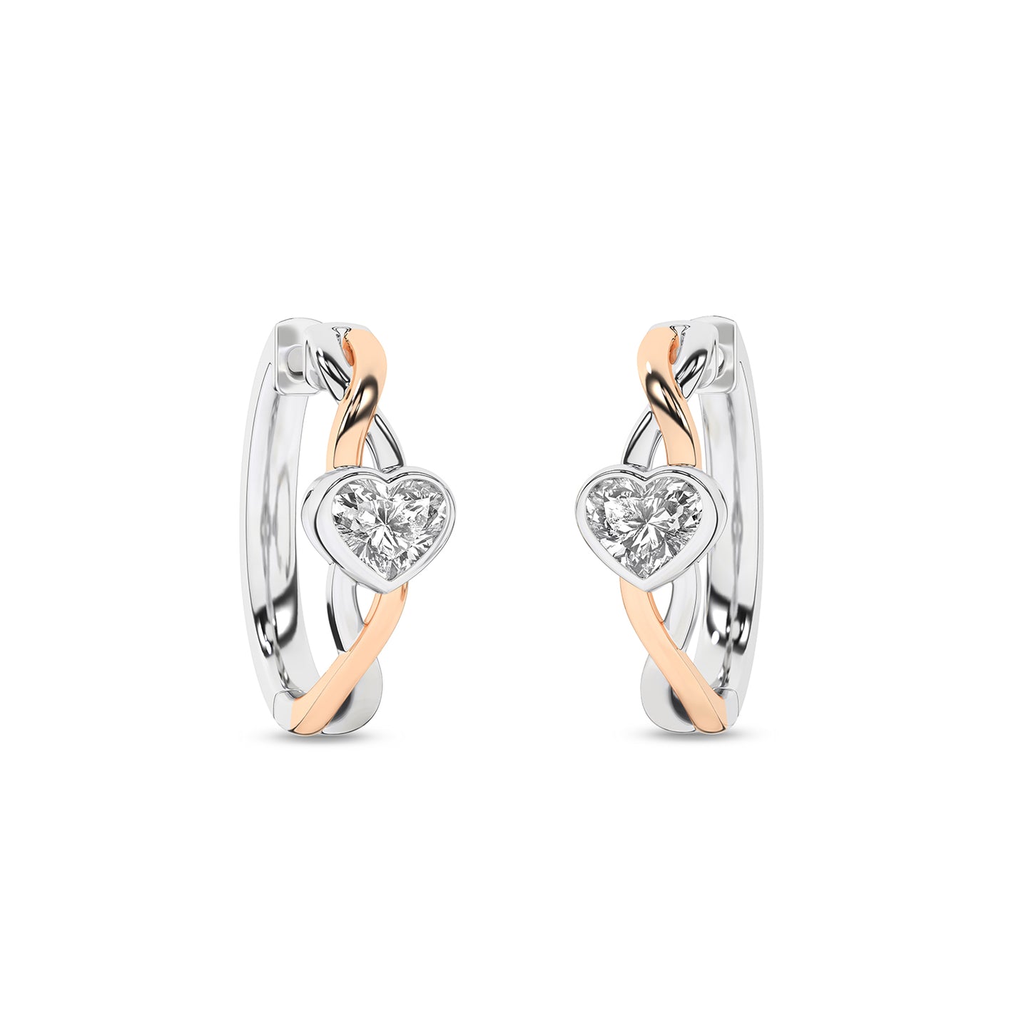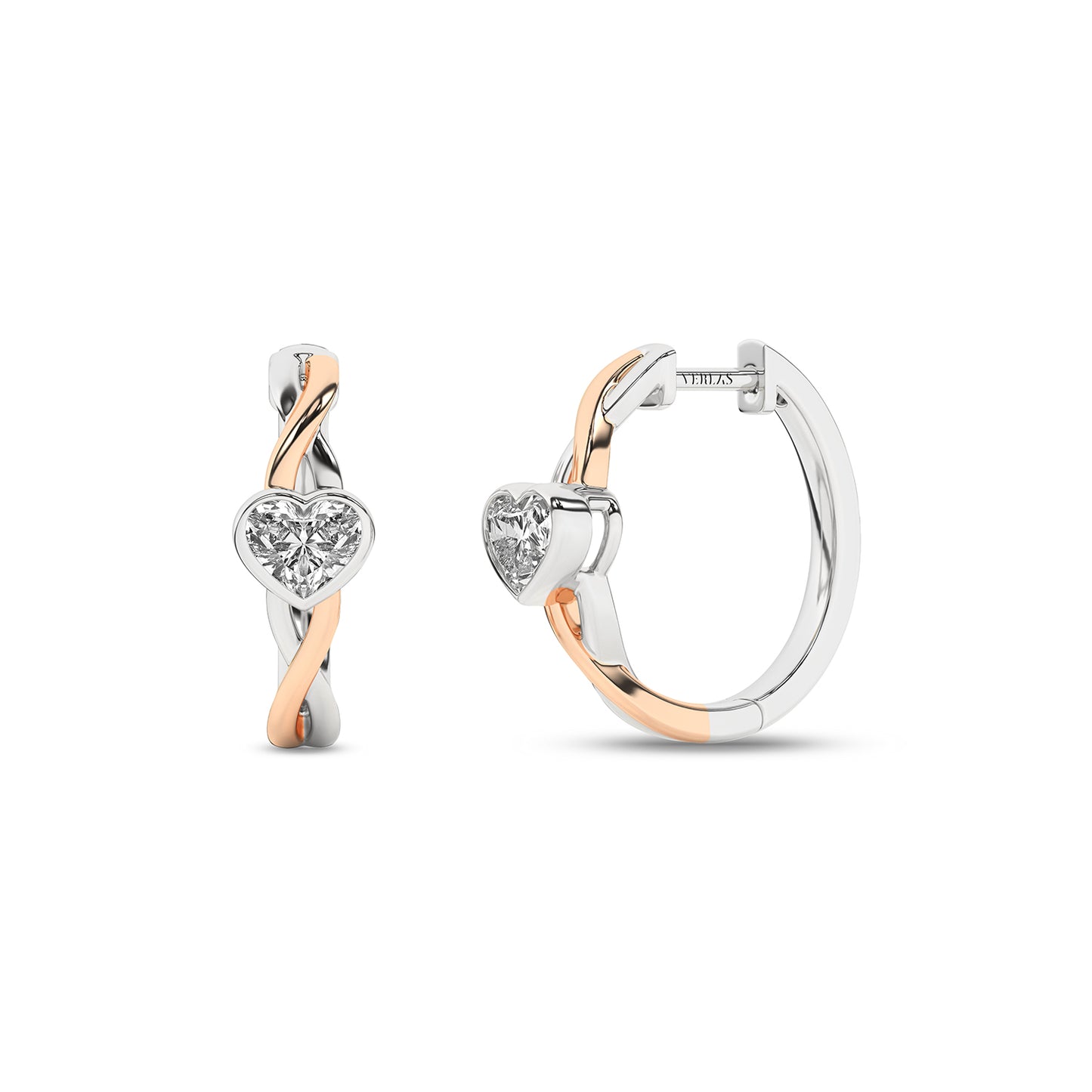 Turn heads with our Twisted Heart Bezel Huggie Hoops, where timeless elegance meets modern allure. These exquisite diamond hoop earrings feature a bezel-set, heart-cut lab-grown diamond that dazzles brilliantly at the center of each hoop, catching the light with every move. The intricate twisted band design, available in a striking blend of white and rose gold or the classic white and yellow gold duo creates a captivating contrast. Designed to make a statement, these huggie hoops are perfect for adding a touch of glamour to any ensemble.