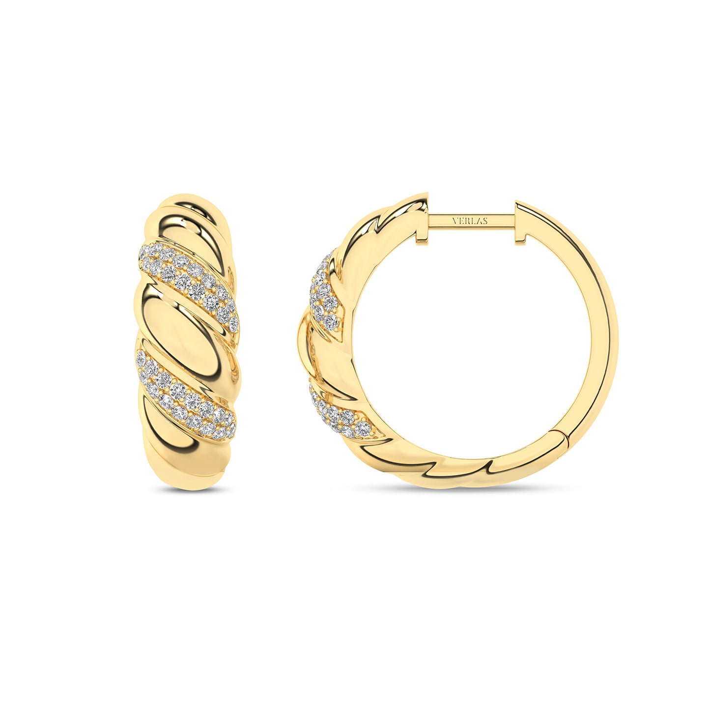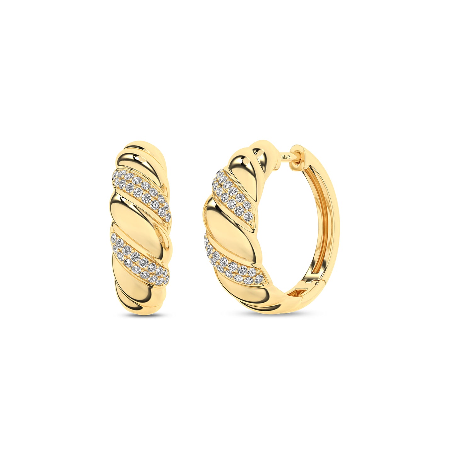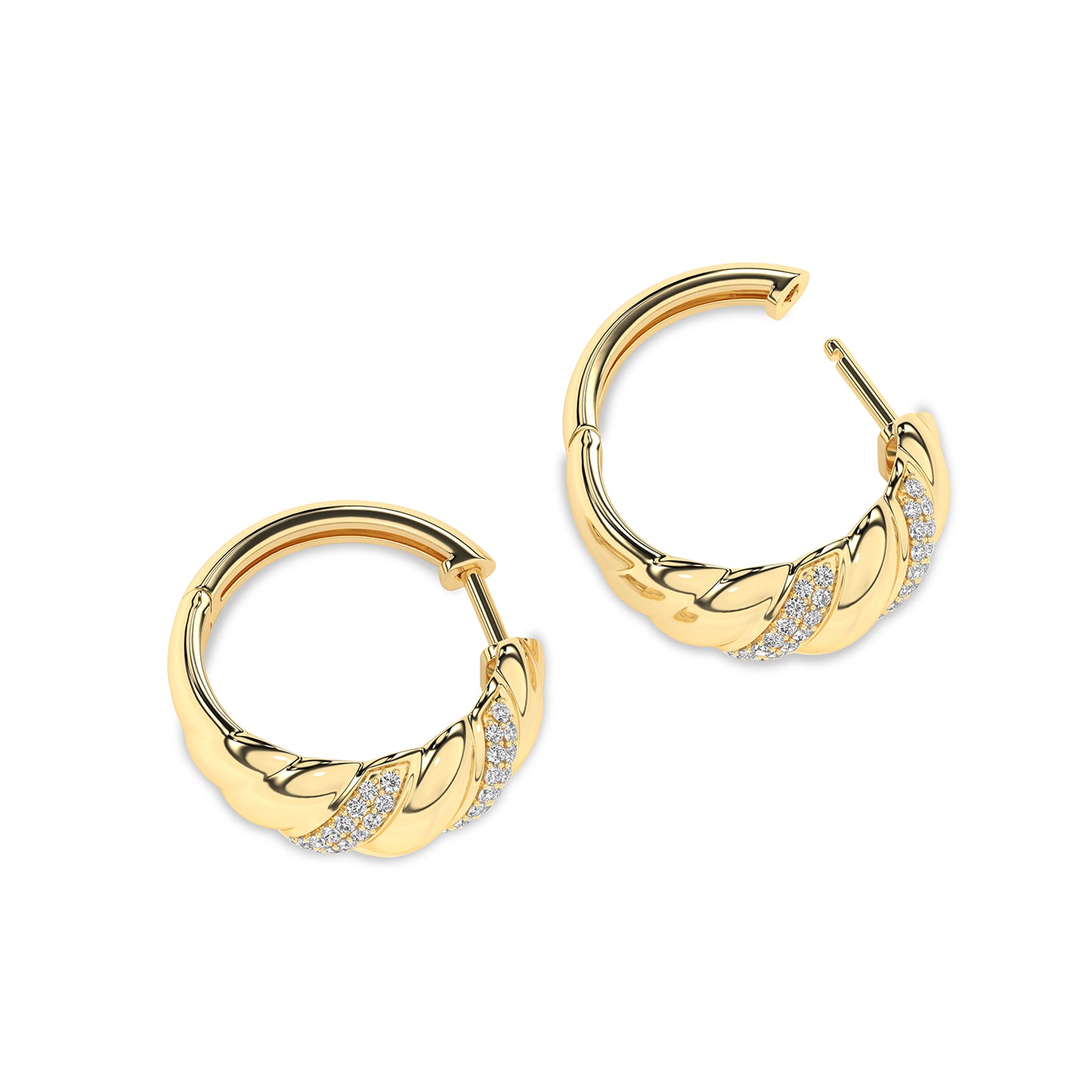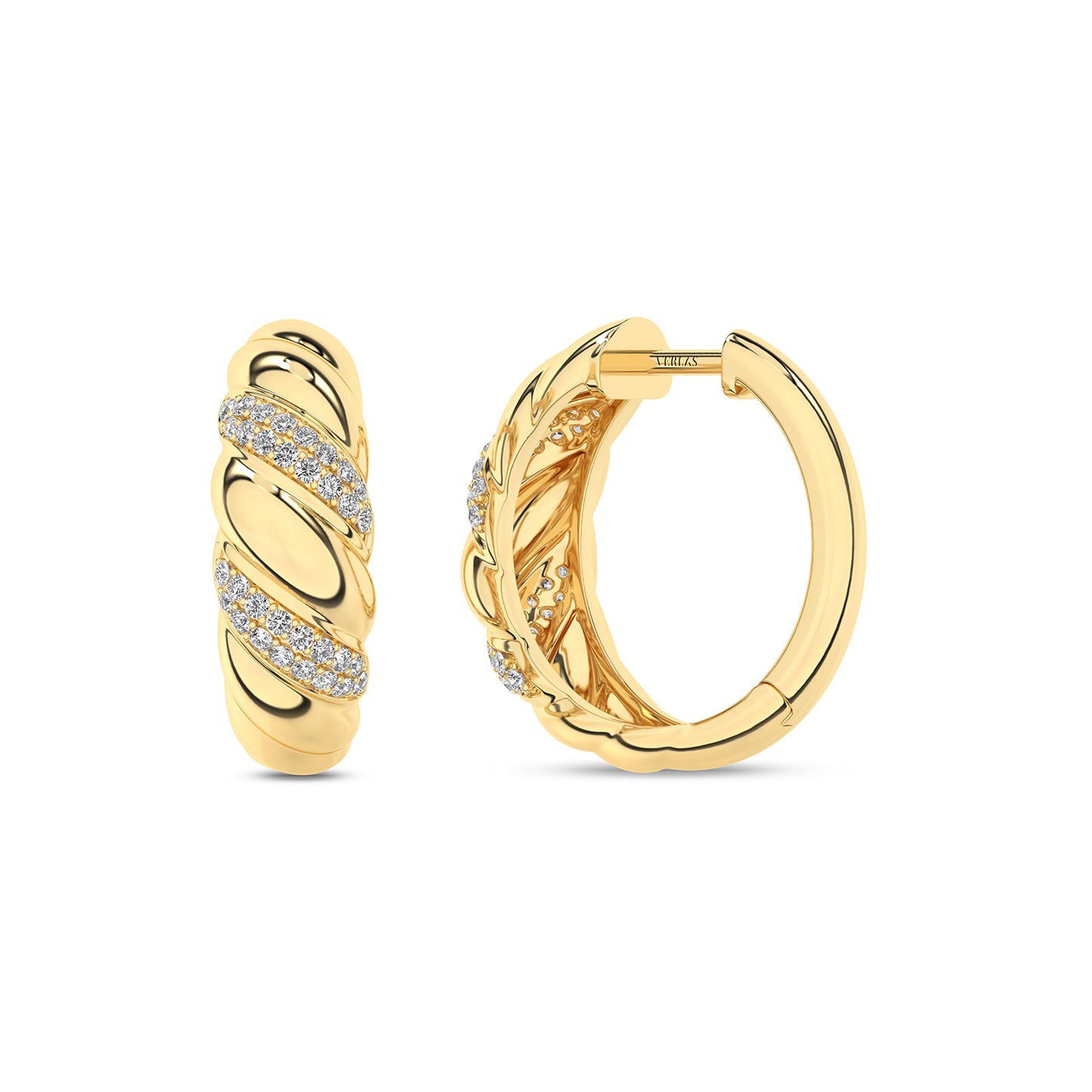 Wrapped in ethical elegance - presenting our Twisted Rope Huggie Hoop earrings. Embracing your earlobe in stunning design, this lab grown diamond huggie hoop is a unique take on a popular rope design. Two of the twists of this 14k solid gold rope hoop are adorned with a mesh of radiant round diamonds, giving it a brilliant look. Add these sustainable stunners to your collection today. Read Less