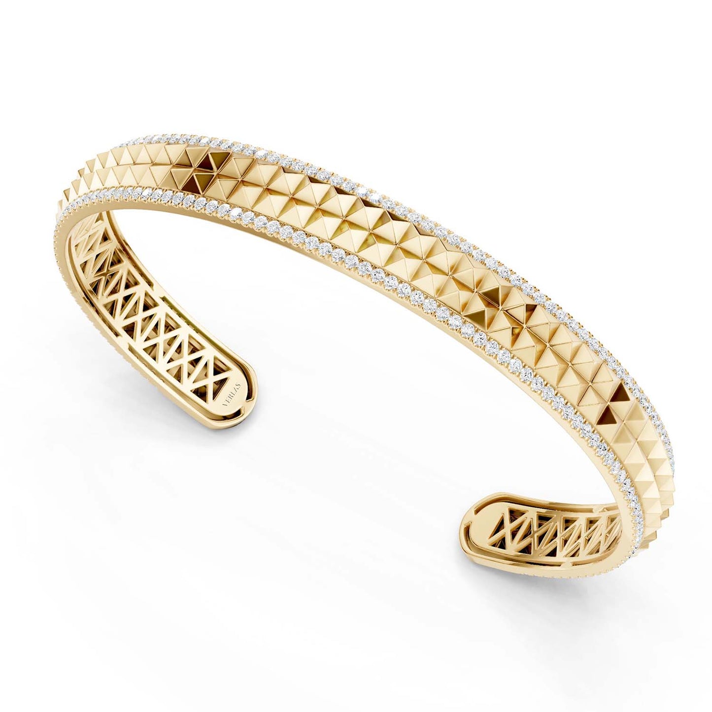 Experience modern elegance with our Two-Tier Pyramid Diamond Cuff Bracelet, a stunning fusion of bold geometry and luxurious sparkle. At the heart of this masterpiece is a striking double row of pyramid motifs that wrap continuously around the bracelet, creating a captivating architectural design. Adjoining the center pyramids on both sides are two rows of dazzling lab-grown diamonds. The combination of sharp pyramid contours and the seamless diamond rows creates a striking balance between edgy and refined. This diamond bracelet is perfect for elevating a formal ensemble or adding a bold statement to your everyday look.