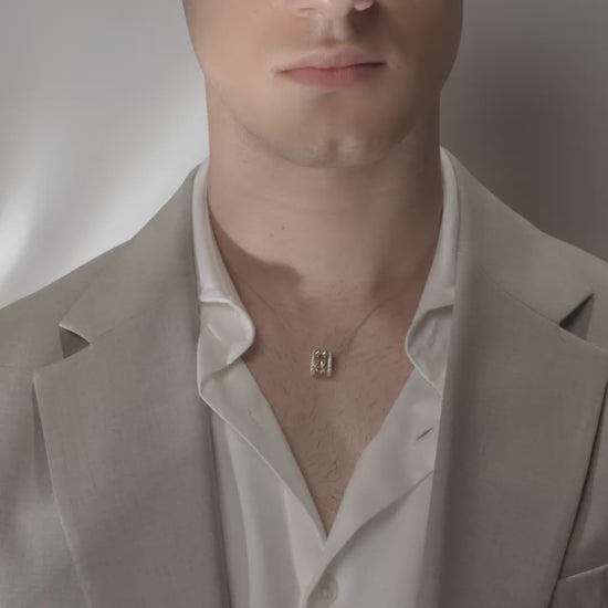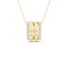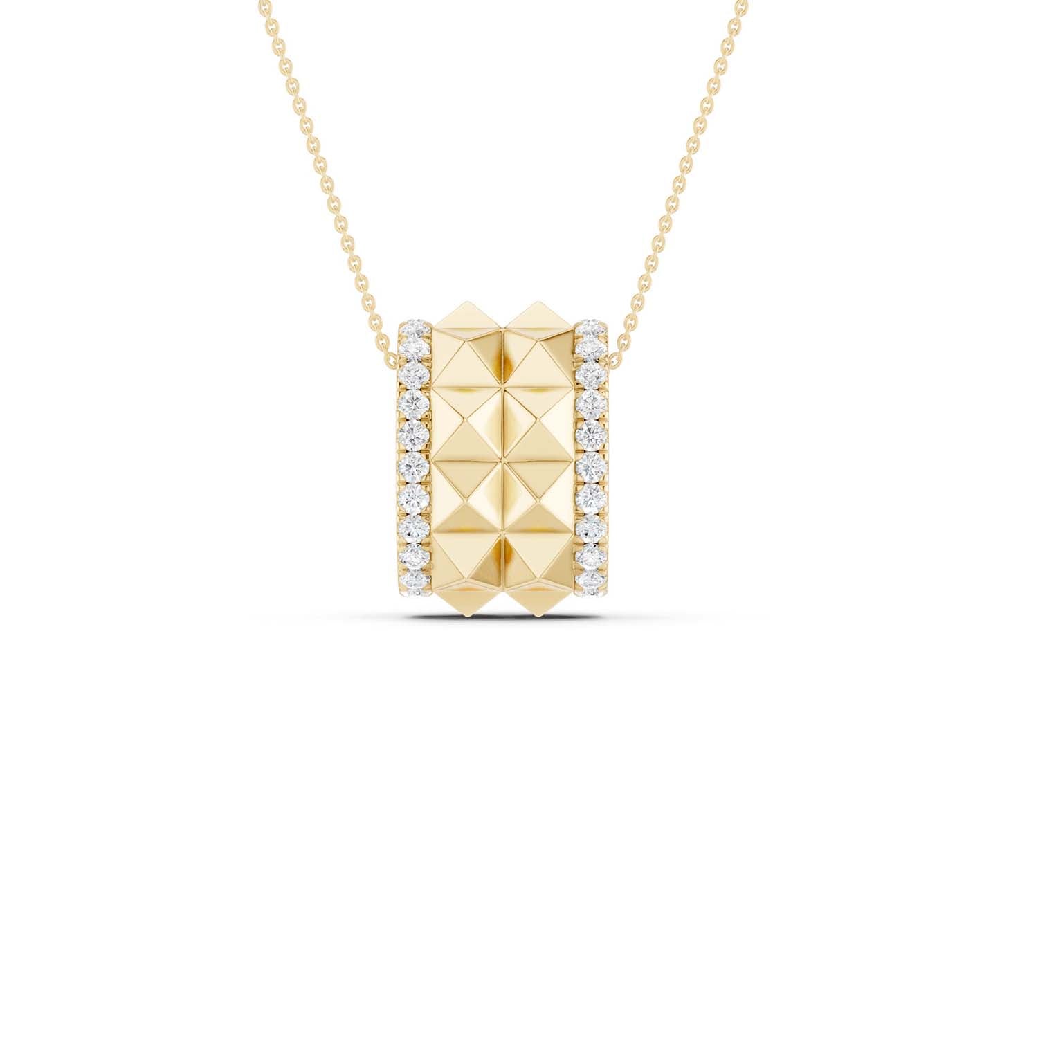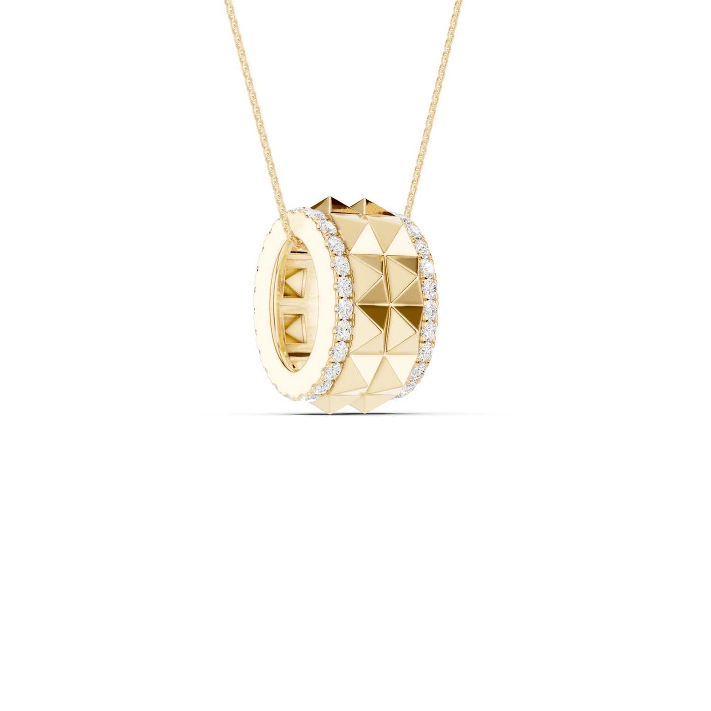 Discover a bold expression of style with our Two-Tier Pyramid Spiked Pendant Necklace, a stunning piece that combines geometric elegance with intricate craftsmanship. This eye-catching diamond pendant necklace features two rows of textured pyramid shapes forming a striking band around the pendant, creating a dynamic visual effect that captivates from every angle. Surrounding the central design is a delicate border adorned with round lab-grown diamonds that catch the light beautifully. Perfect for elevating your everyday look or adding a statement touch to special occasions, this geometric pendant necklace embodies modern elegance and artistic flair.